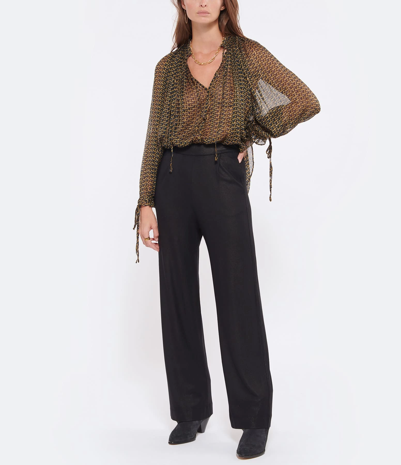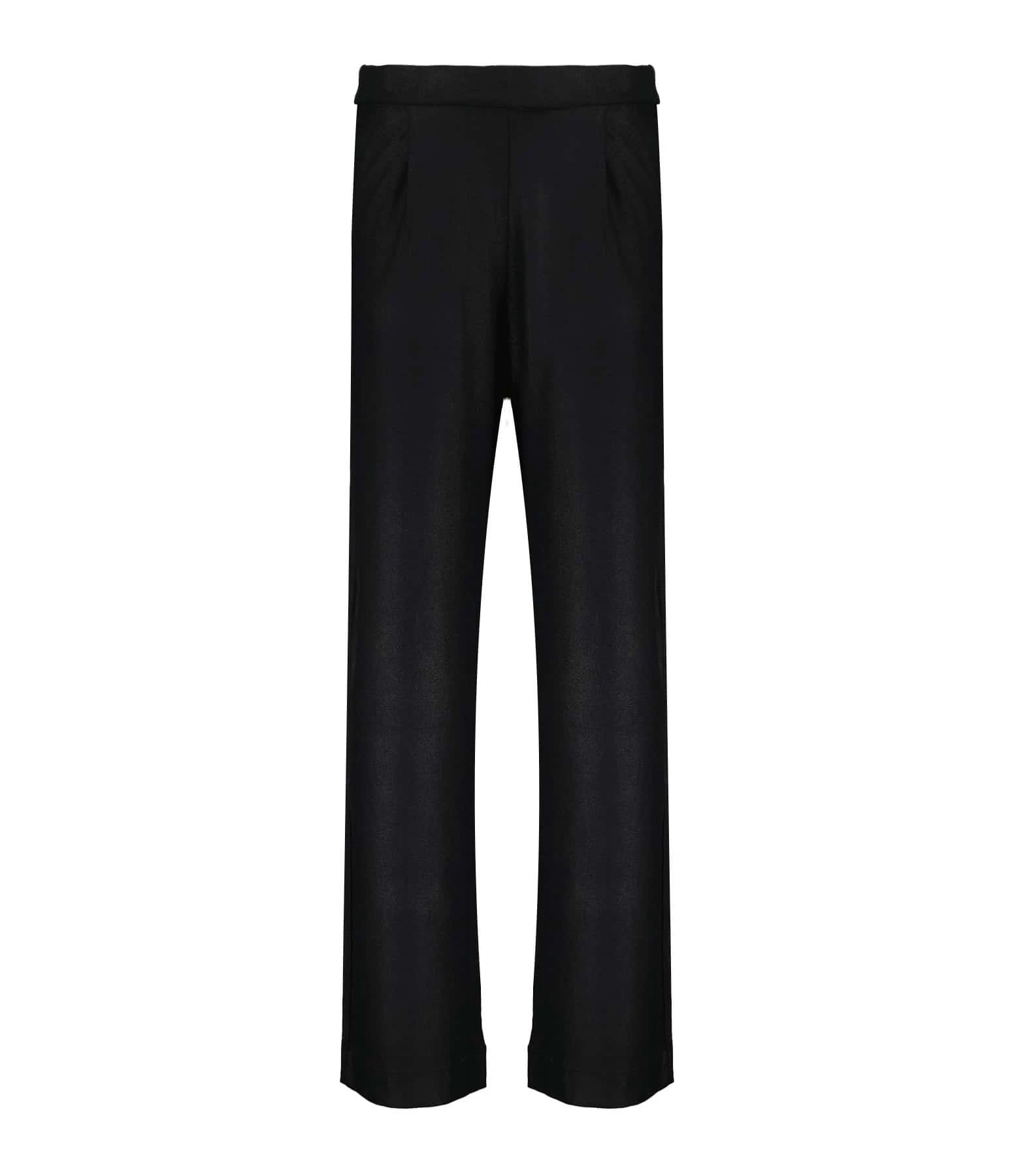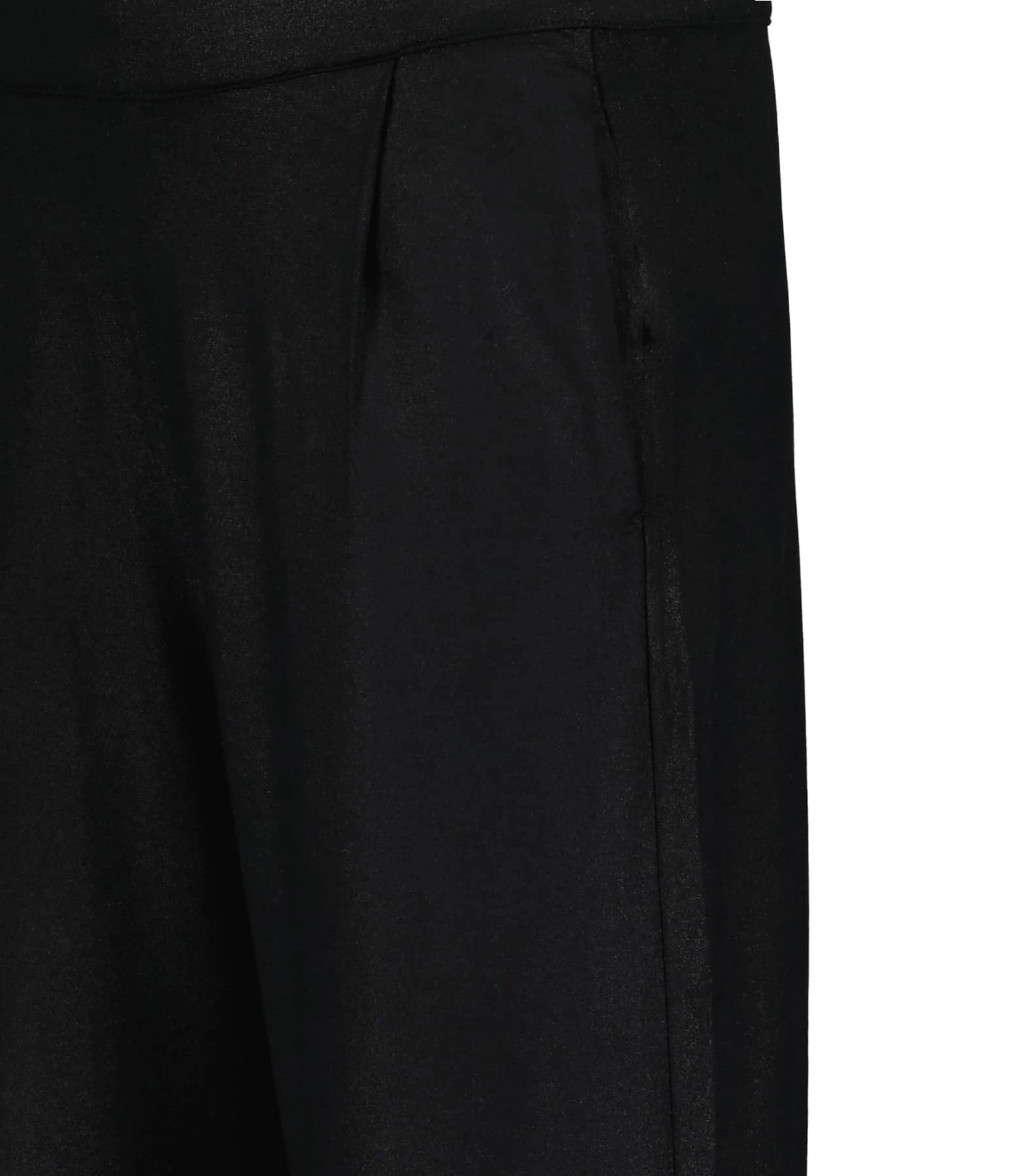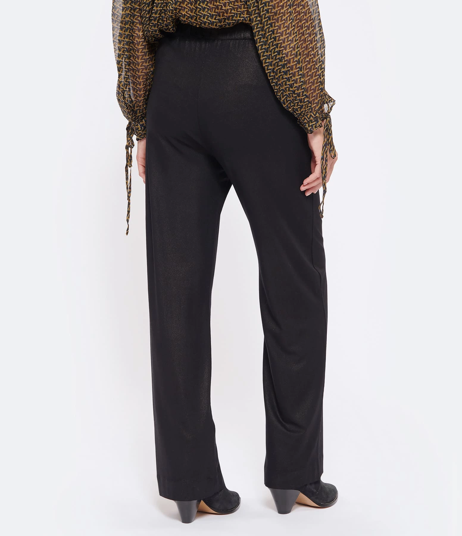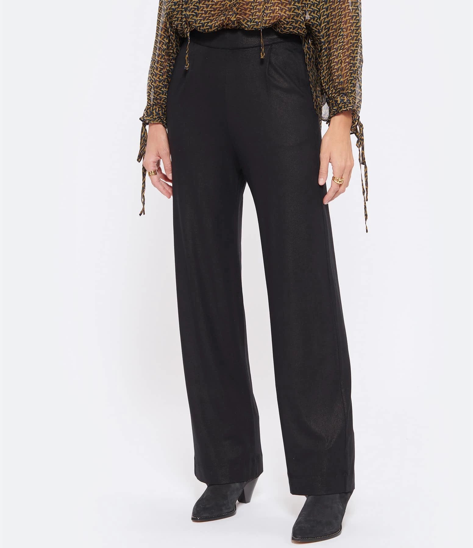 Pantalon à pinces en tissu stretch noir métallisé. Taille élastiquée. Deux poches prises dans les coutures latérales sur le devant. Coupe droite. Base droite.