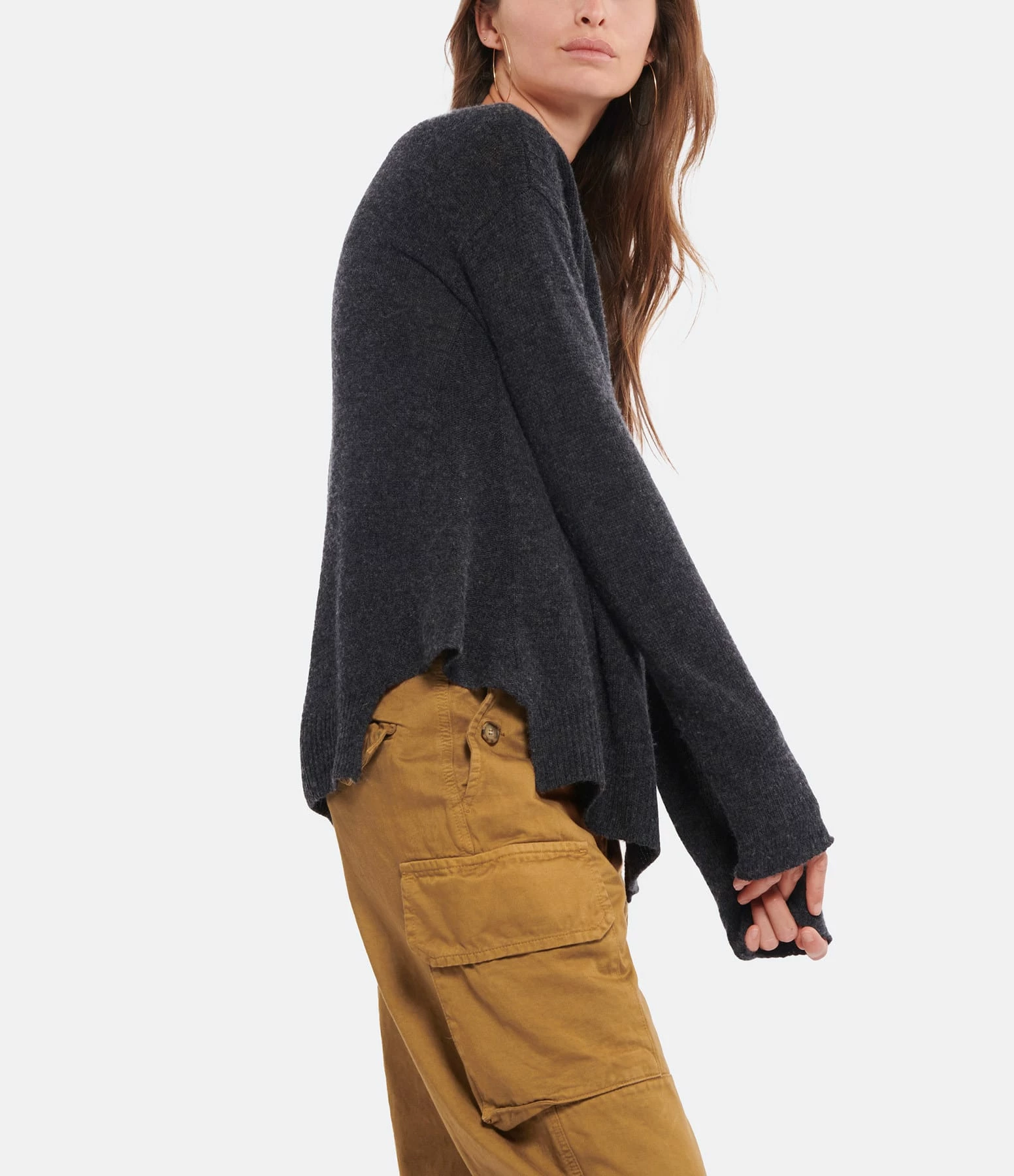Pull en laine et cachemire gris anthracite chiné. Col bateau. Manches longues. Coupe droite. Base droite. Fentes latérales.