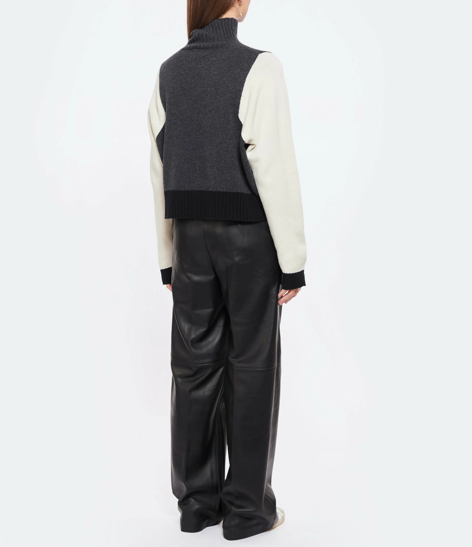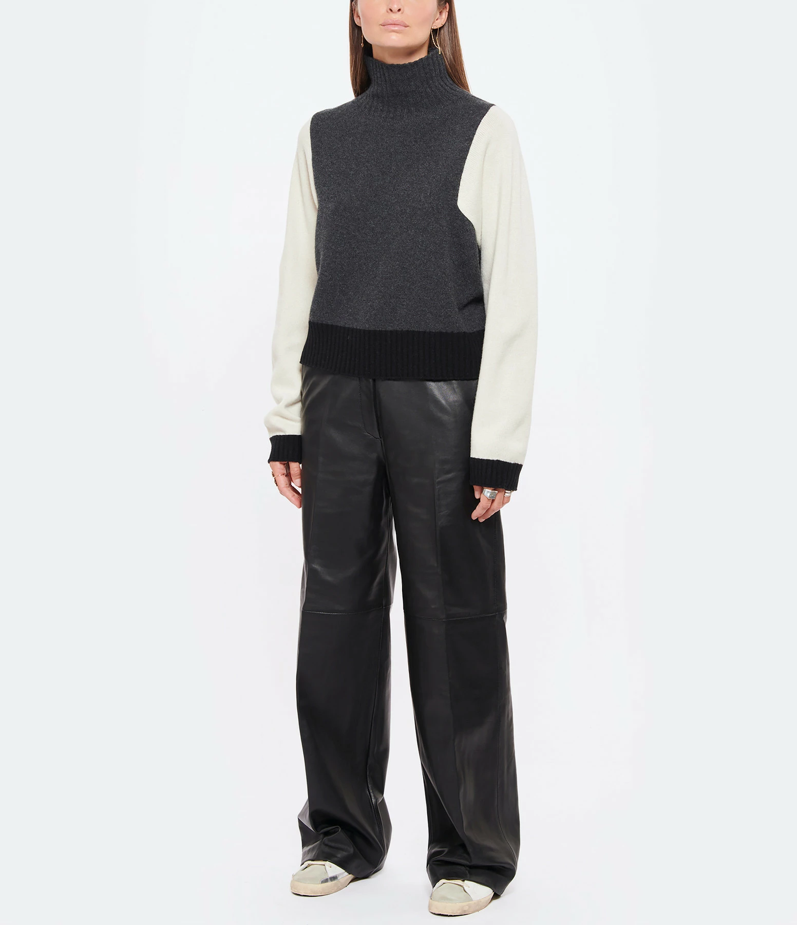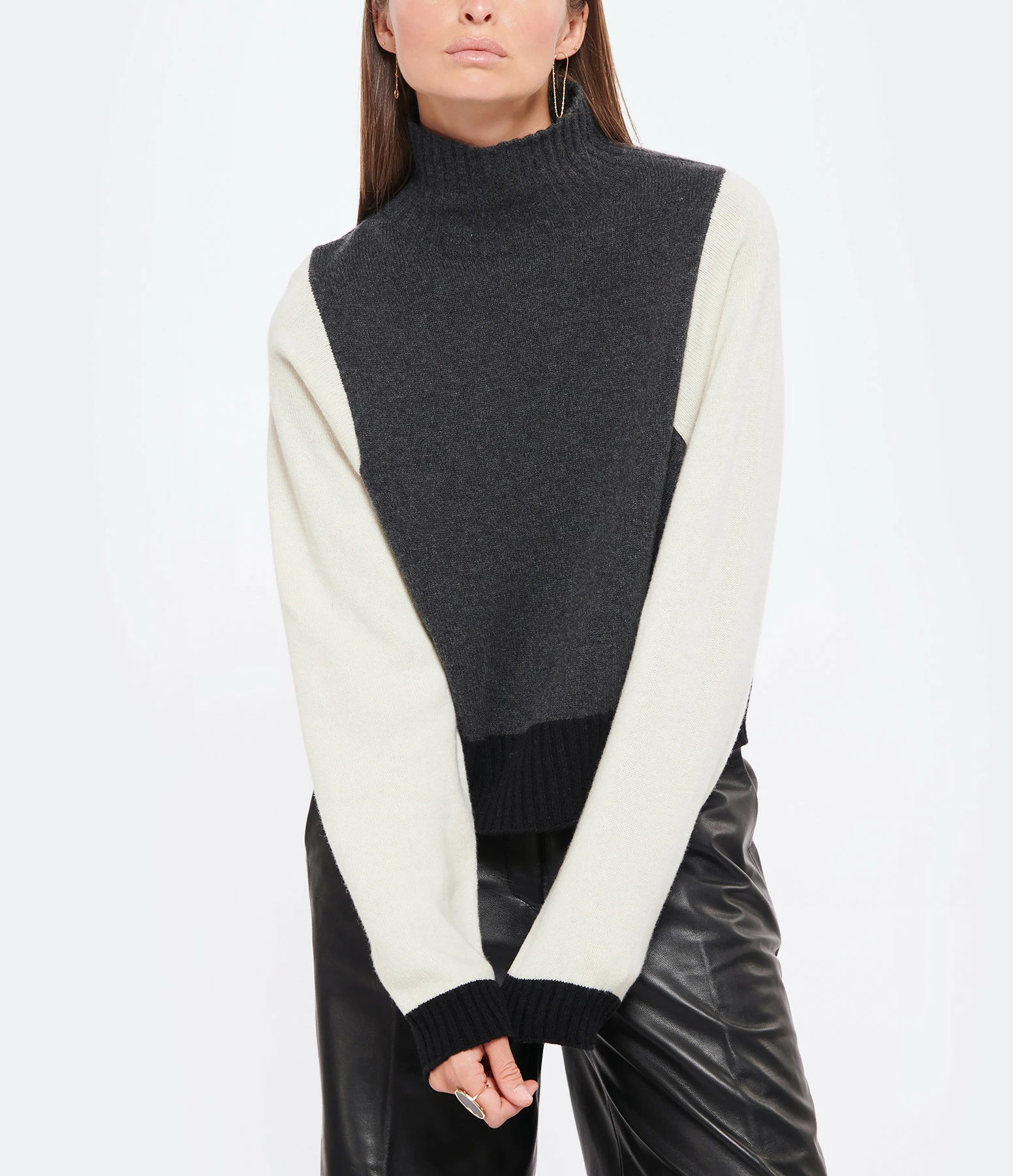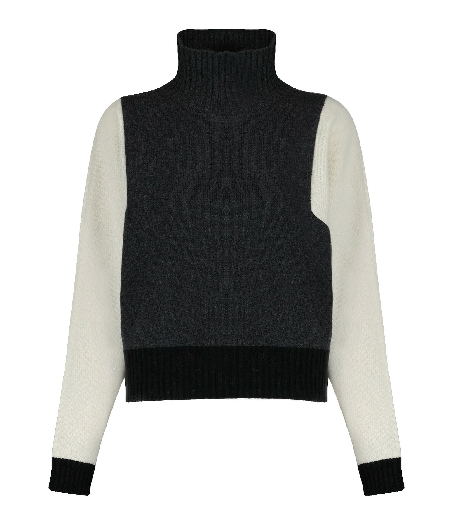 Pull en laine et cachemire anthracite chiné. Col montant côtelé. Manches longues blanches avec poignets noirs côtelés. Coupe droite large. Base droite noire côtelée.