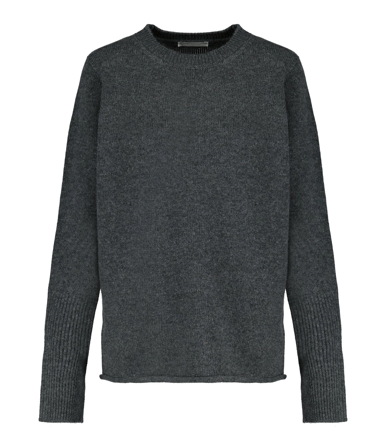 Pull en cachemire gris chiné. Col rond. Manches longues. Coupe droite. Base droite. Non doublé.