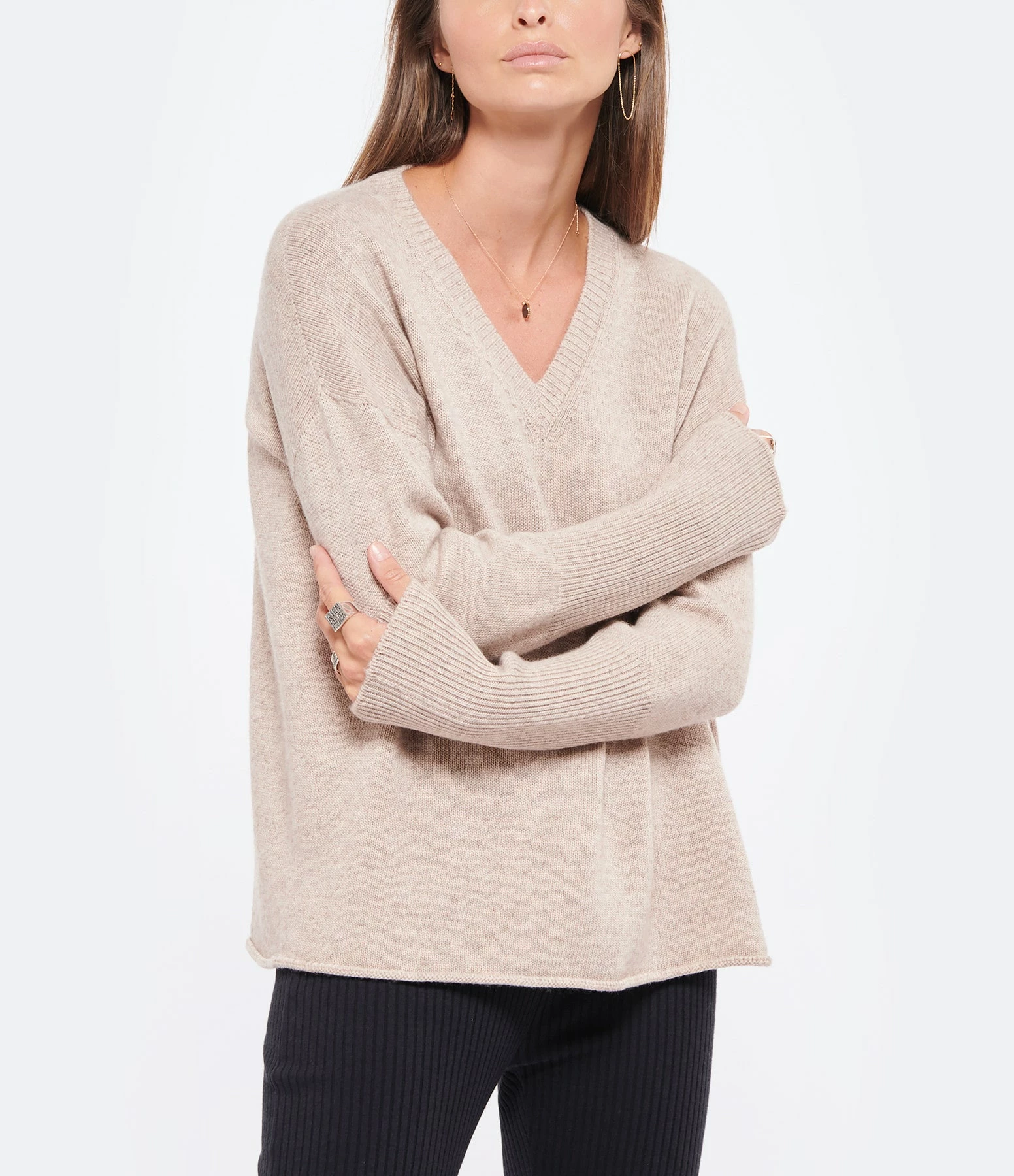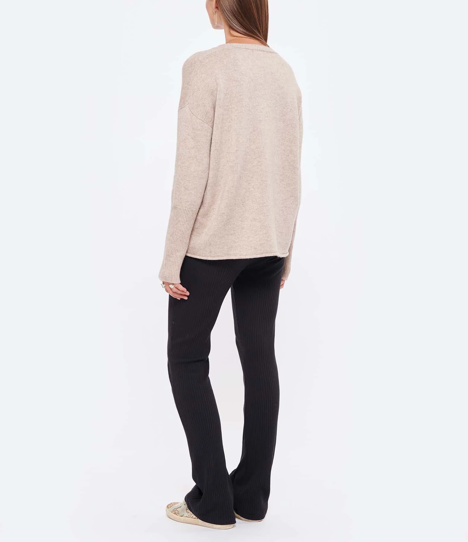 Pull en laine et cachemire beige rosé. Col en V côtelé. Manches longues avec longs poignets côtelés. Coupe droite. Base droite roulottée.