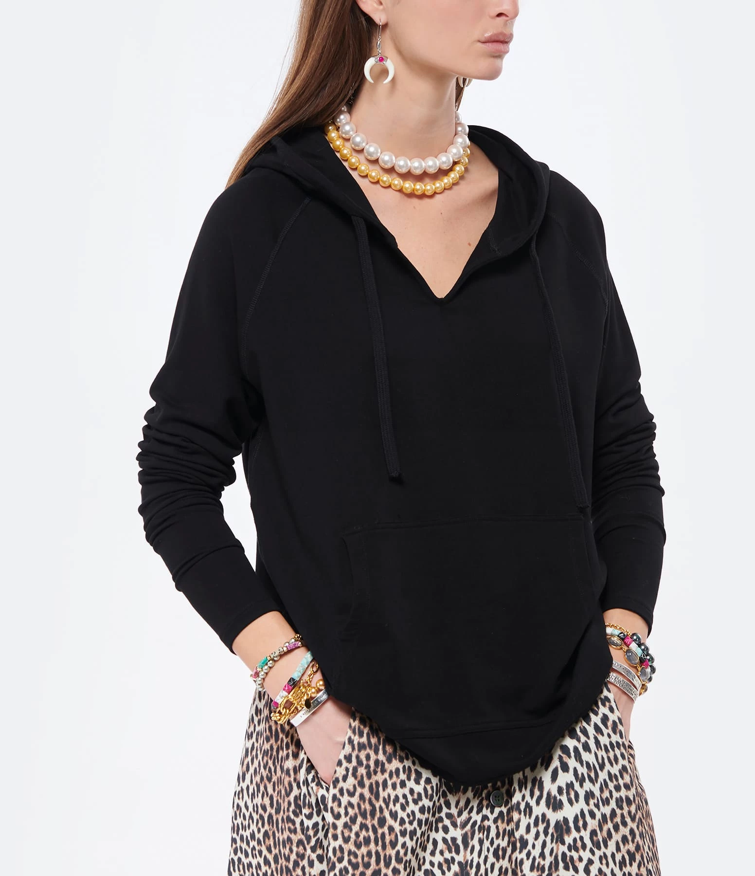 Sweatshirt à capuche avec liens de serrage noir. Manches longues. Une poche kangourou à l’avant. Coupe droite. Base droite.