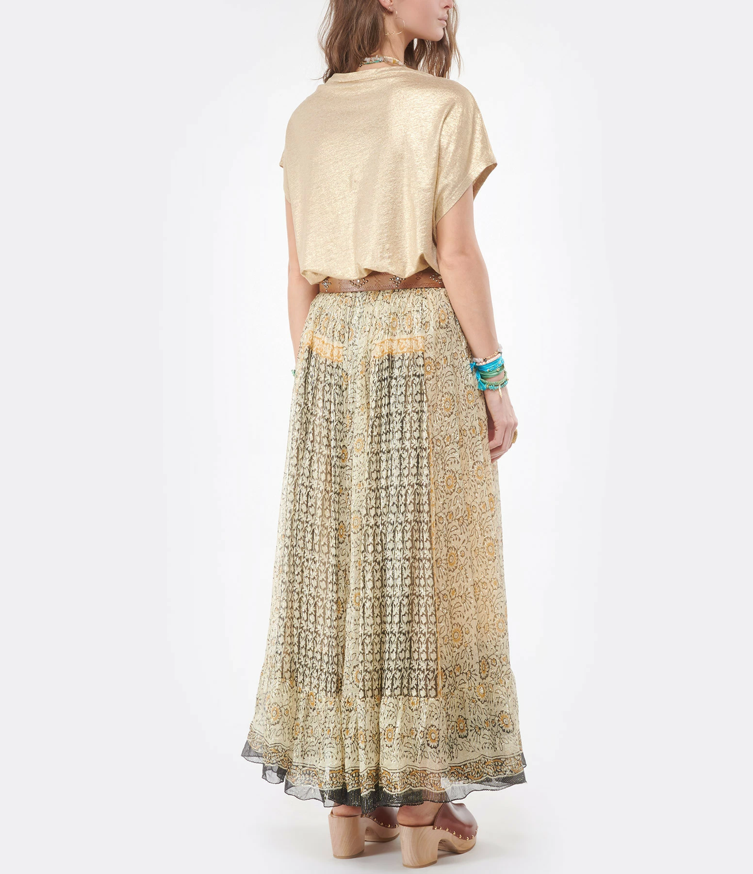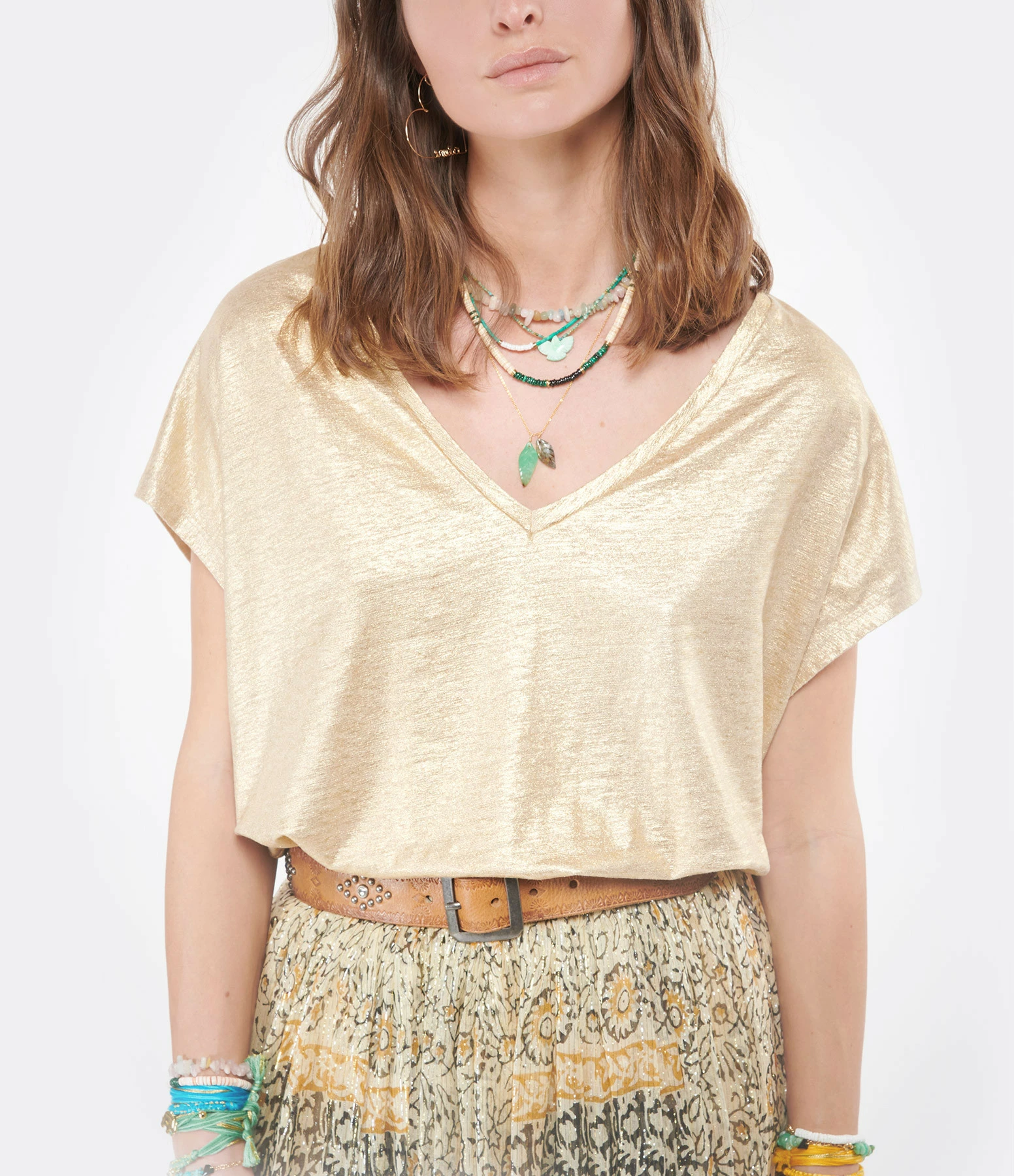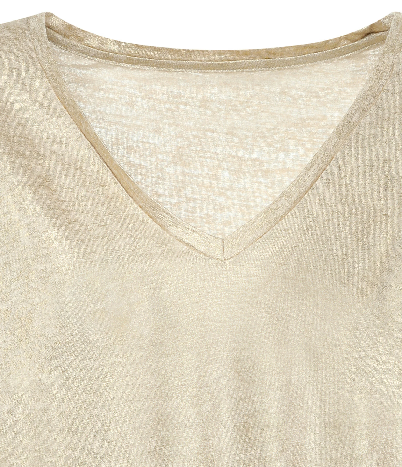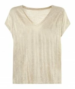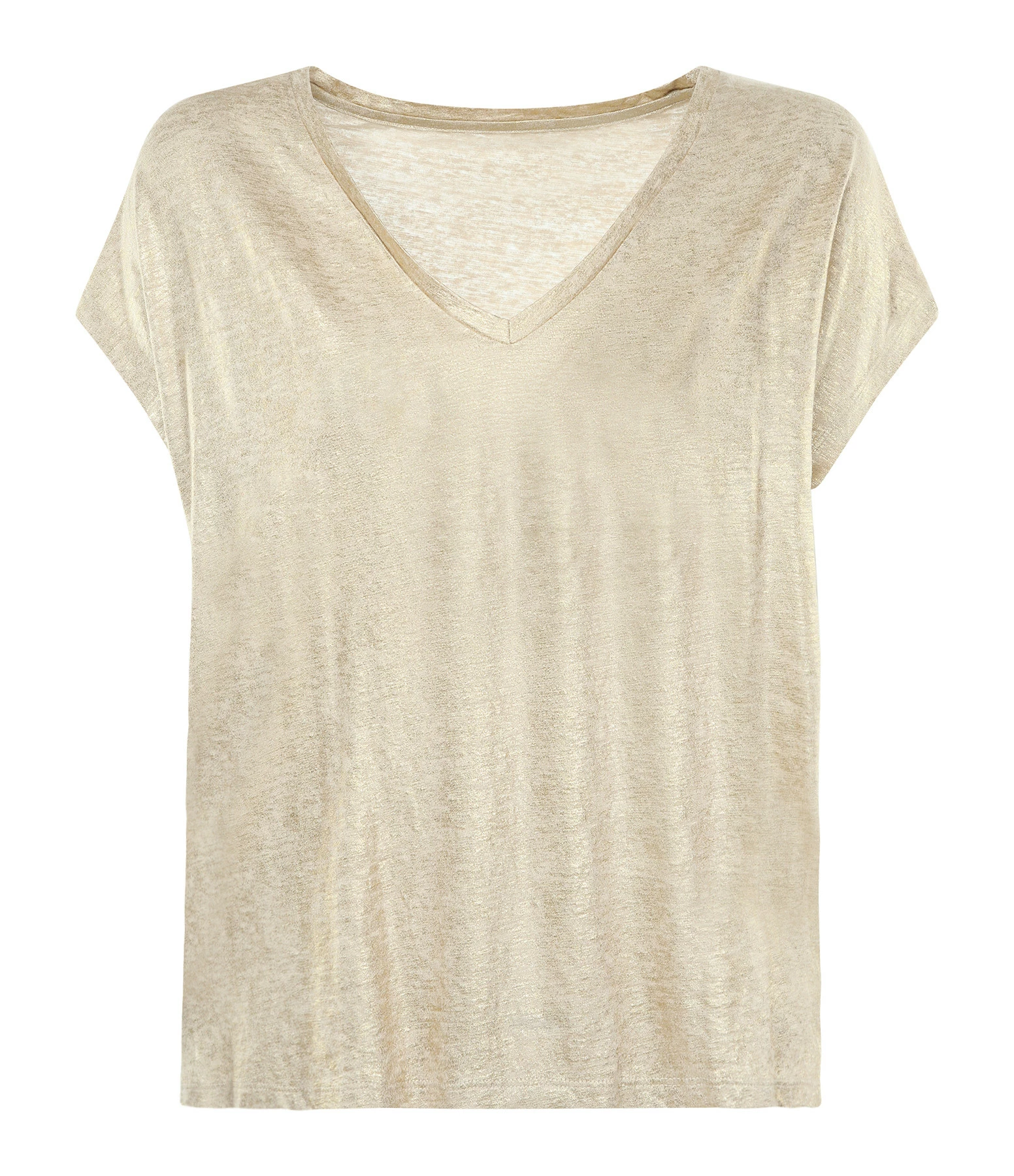 Tee-shirt manches courtes en lin doré. Coupe large et col en V. Base droite.