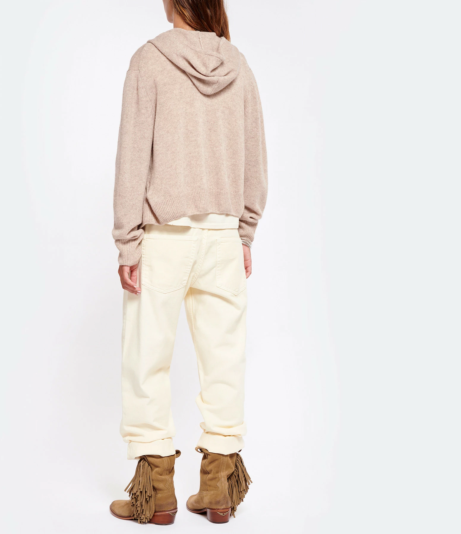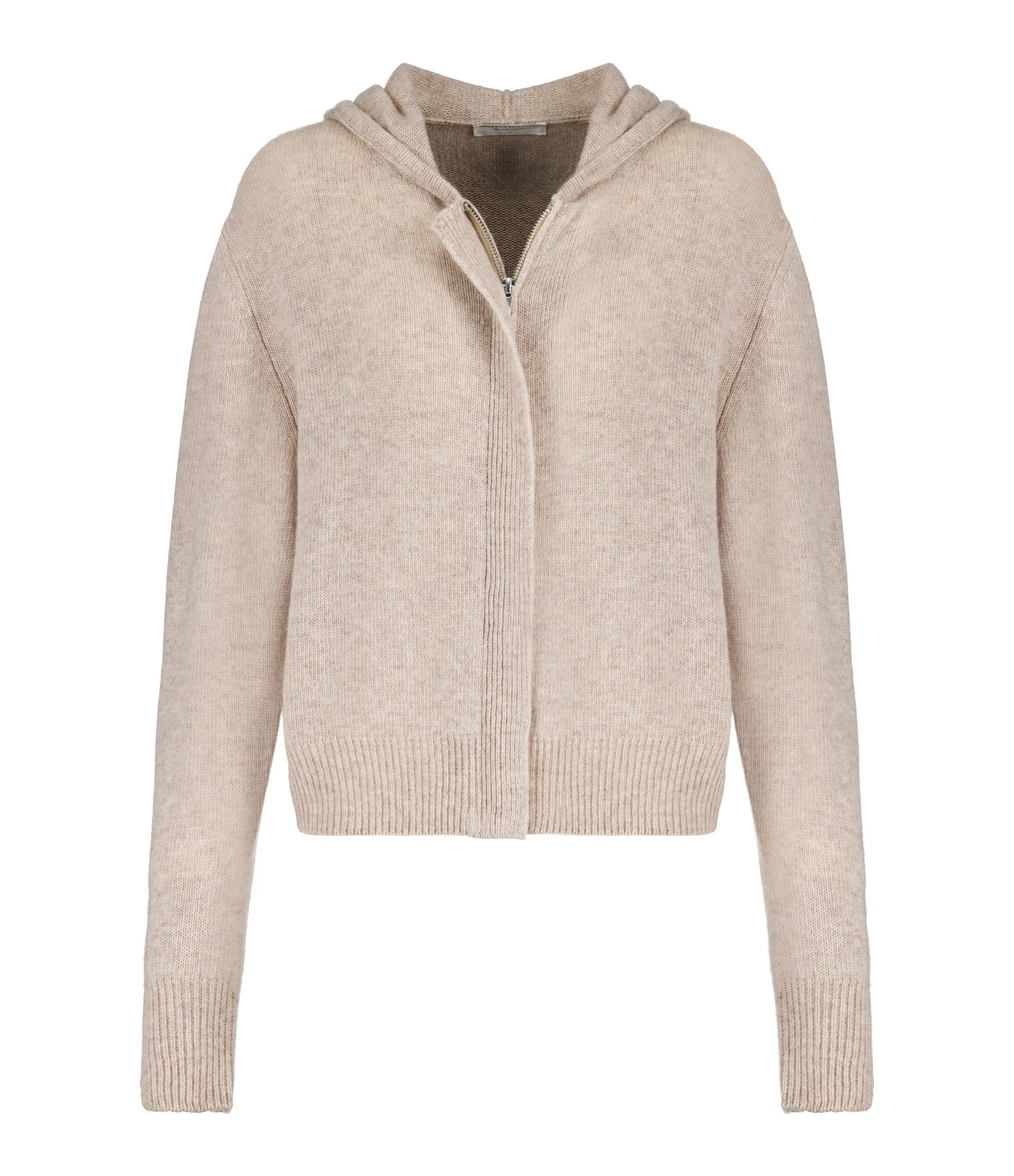 Veste courte en maille de laine et cachemire rose poudré. Col à capuche. Manches longues avec poignets côtelés. Fermeture zippée cachée sur le devant. Coupe droite. Base droite côtelée.
