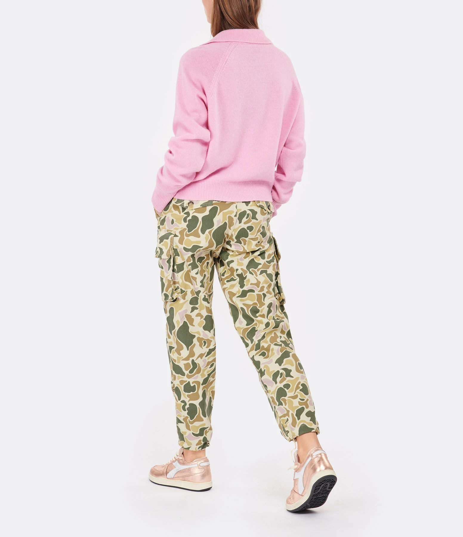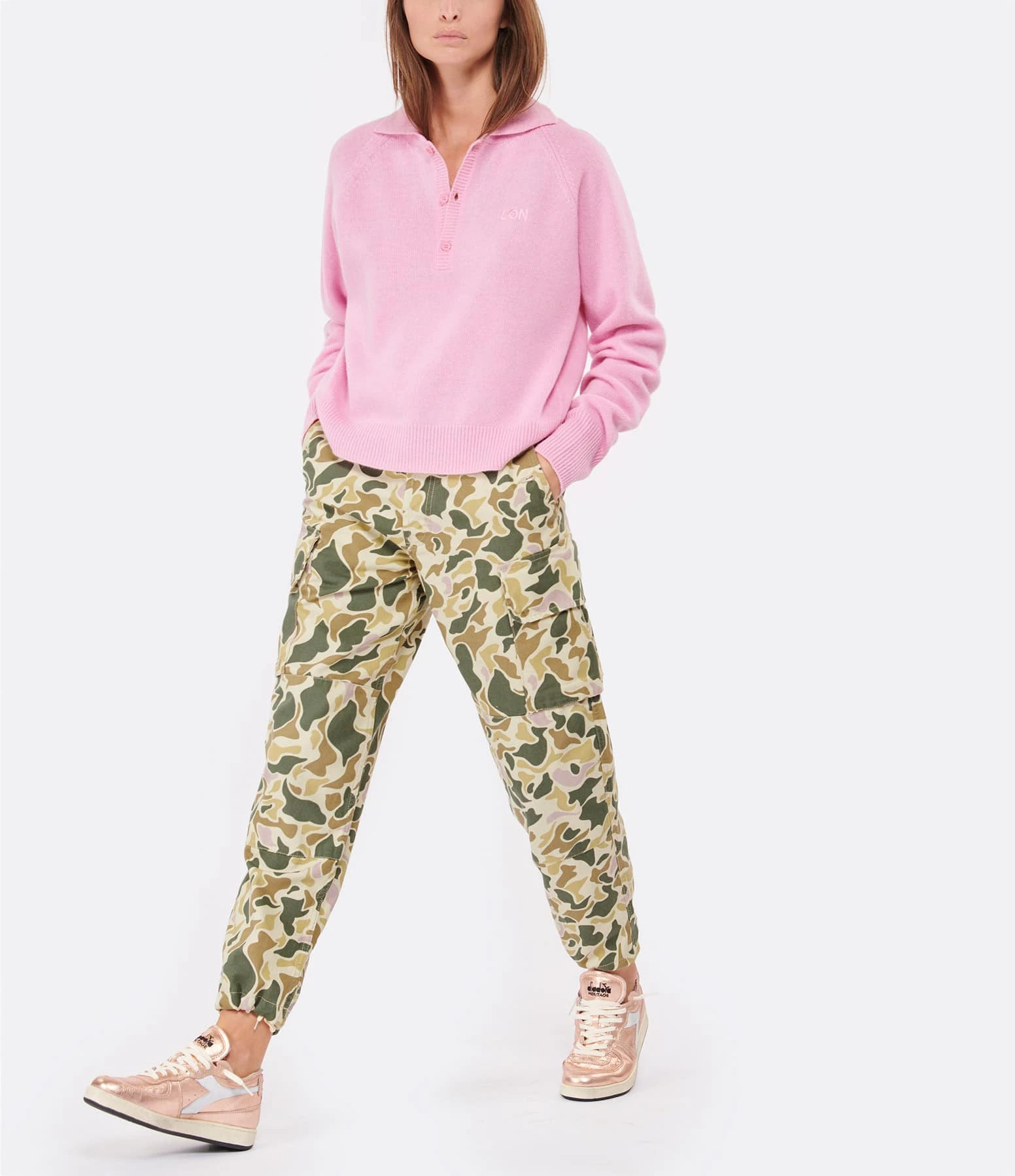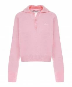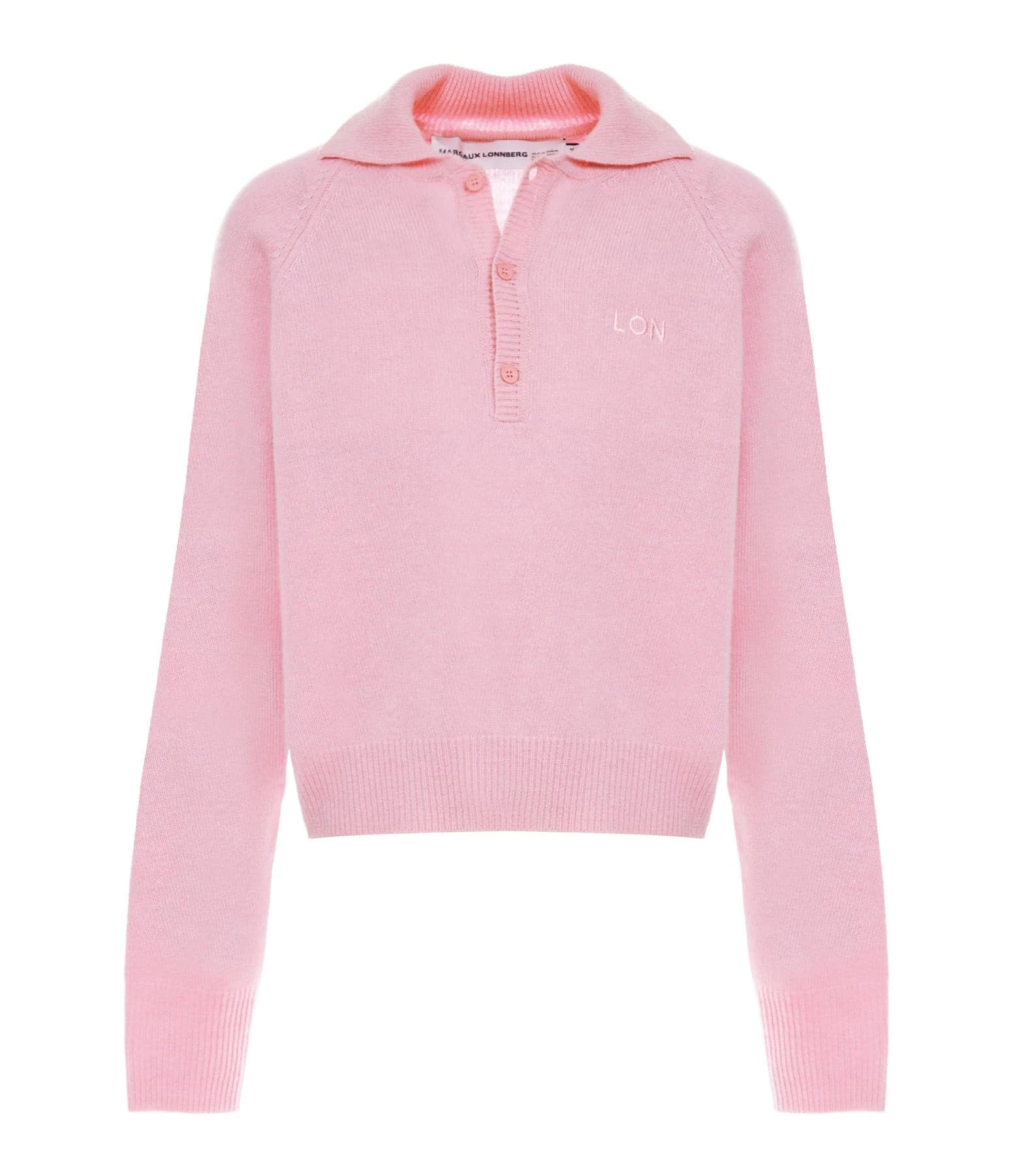 Pull en maille de laine rose orné du logo brodé ton sur ton sur la poitrine. Col polo côtelé et boutonné. Petits boutons rose. Manches longues raglan avec poignets côtelés. Coupe ample. Base droite côtelée.