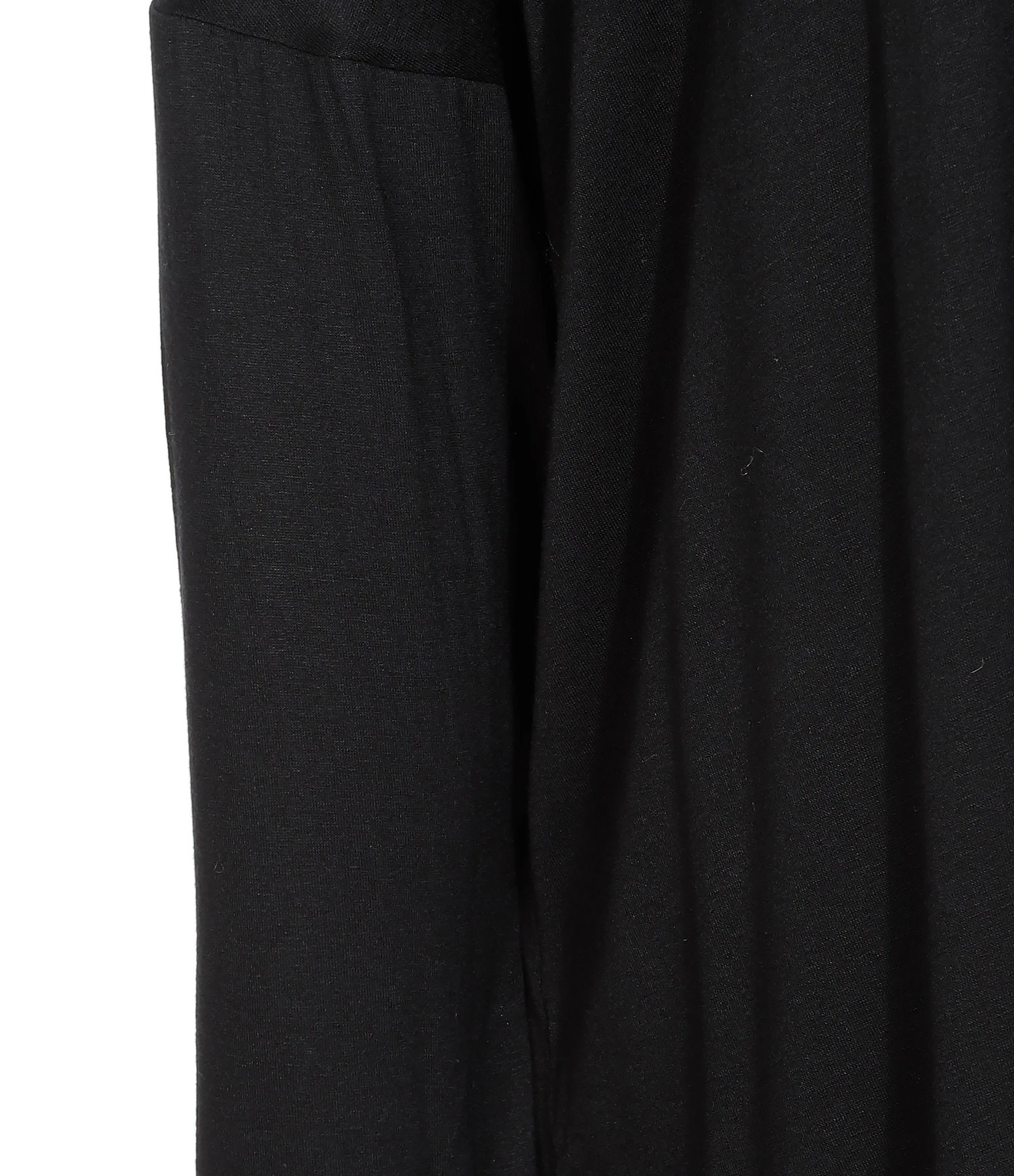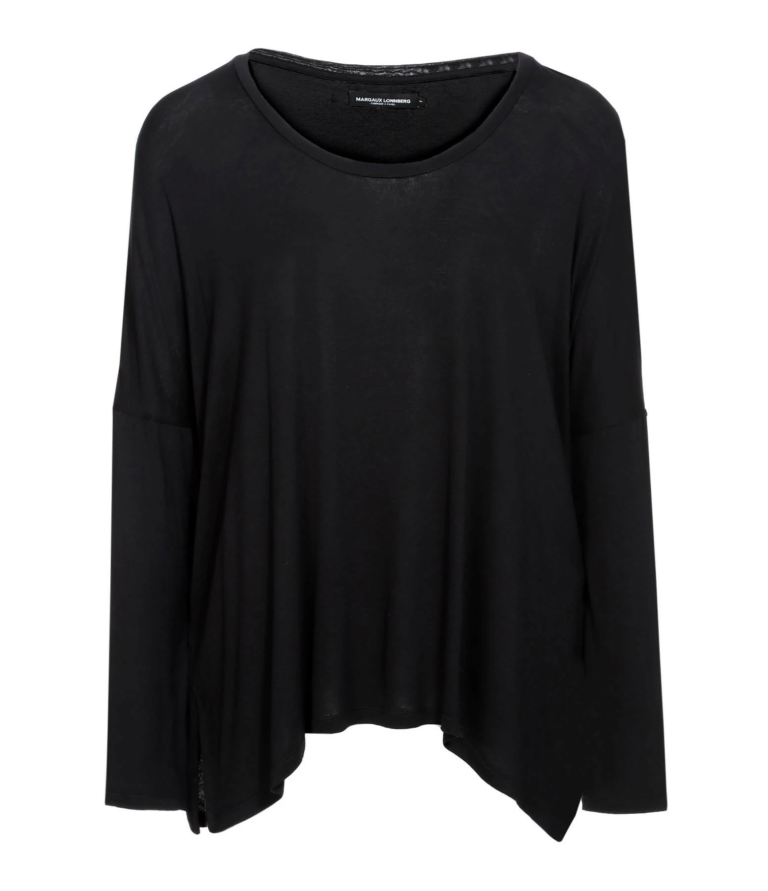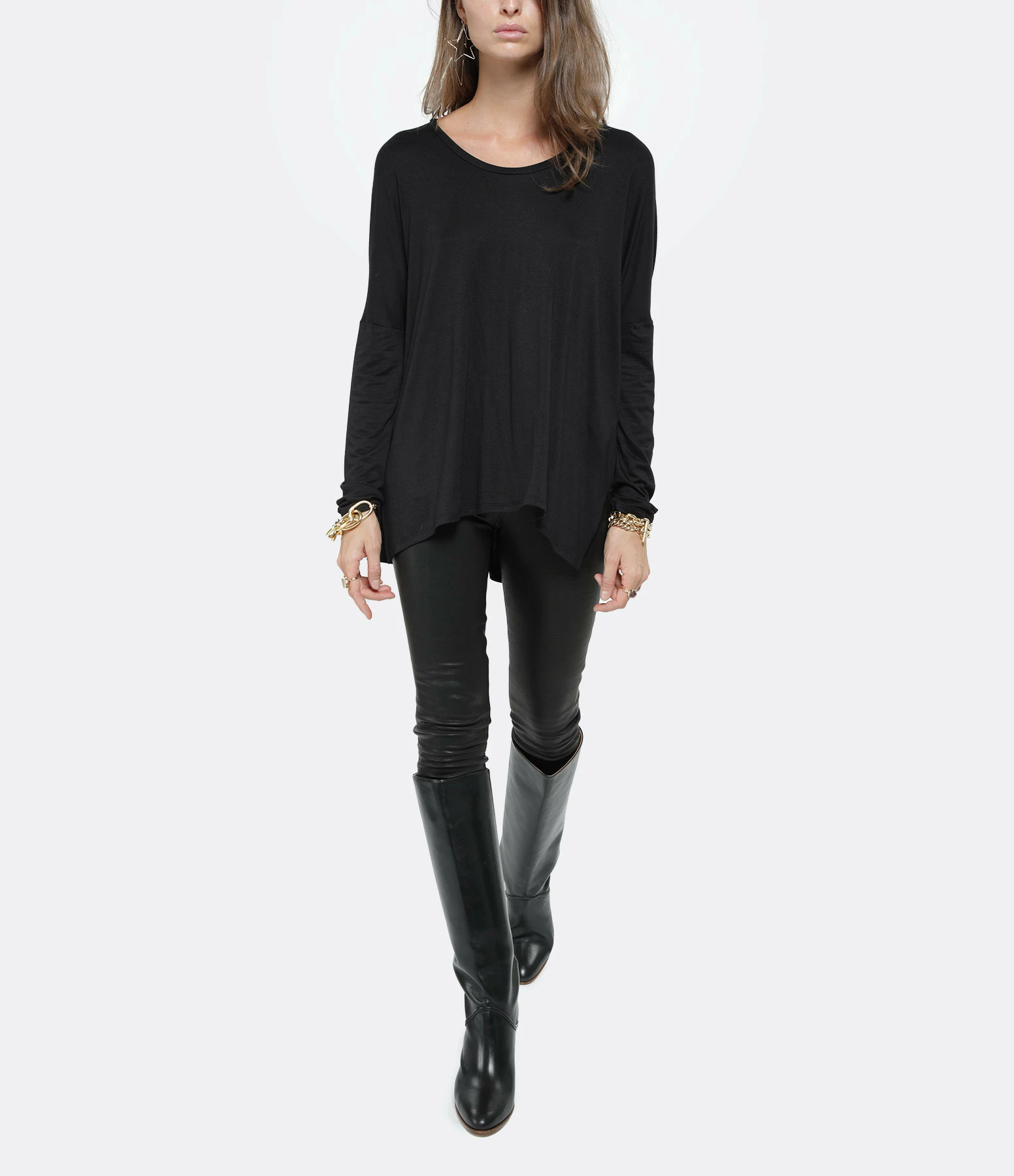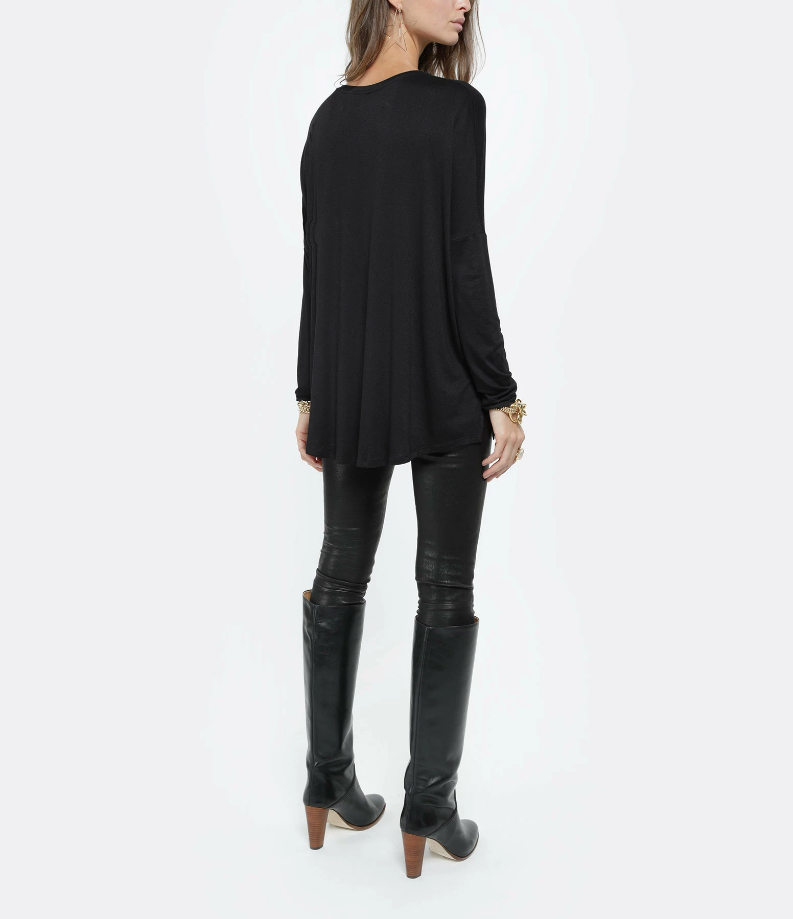 Tee-shirt fluide noir. Col rond et manches longues. Base droite avec fentes et forme ample. Légèrement plus long à l’arrière. Non doublé.