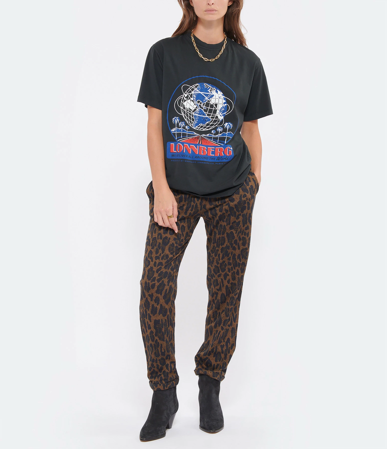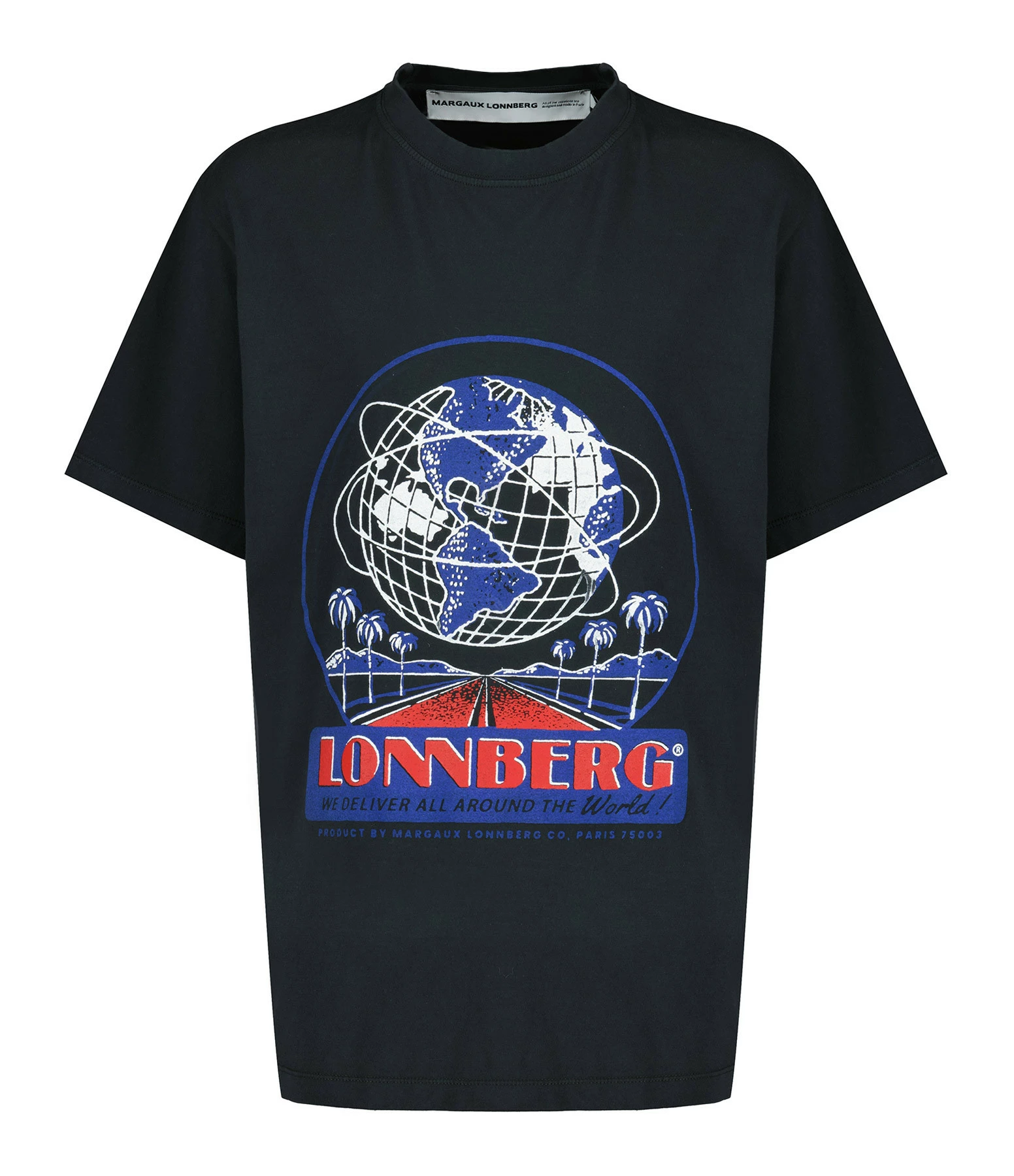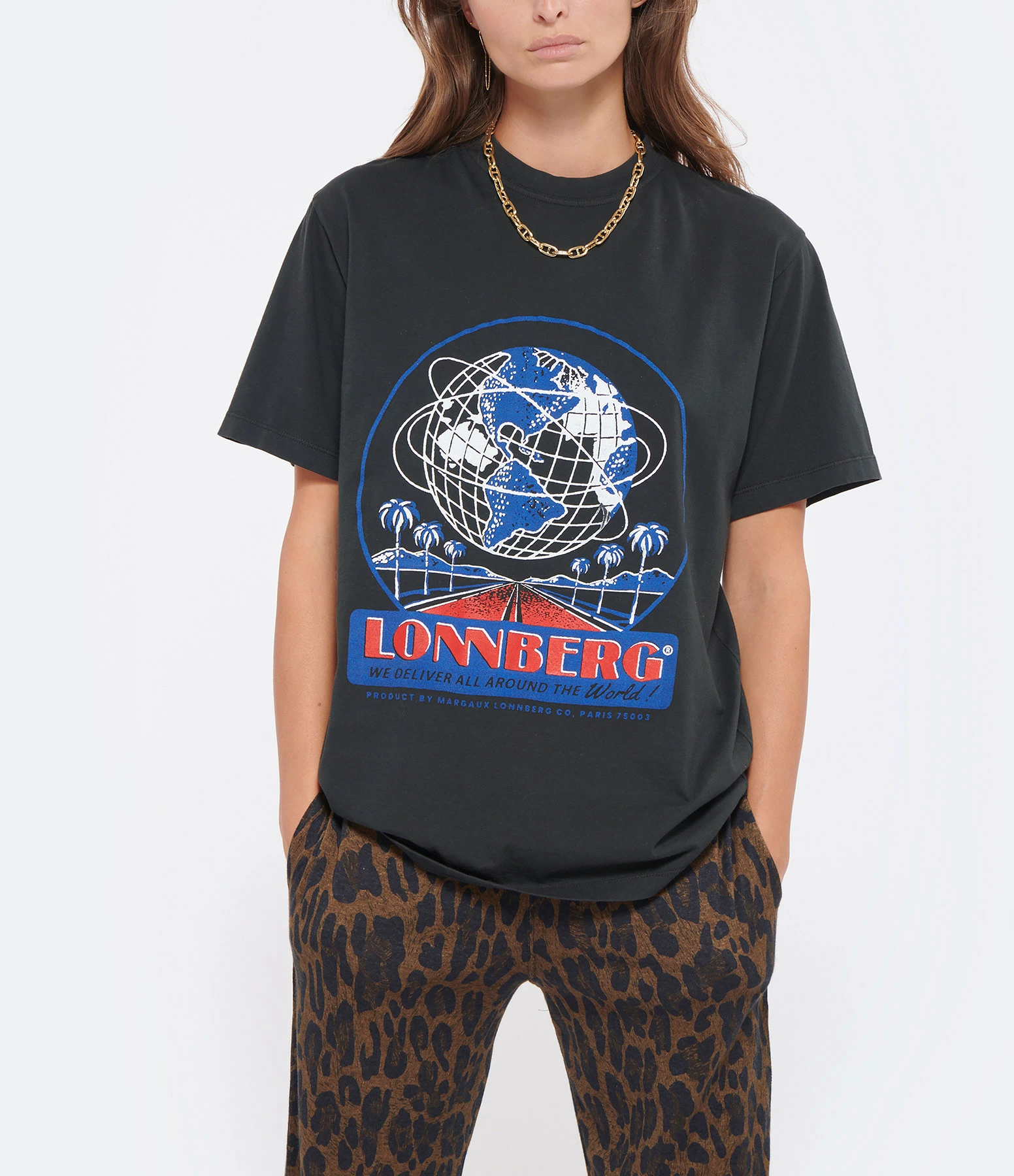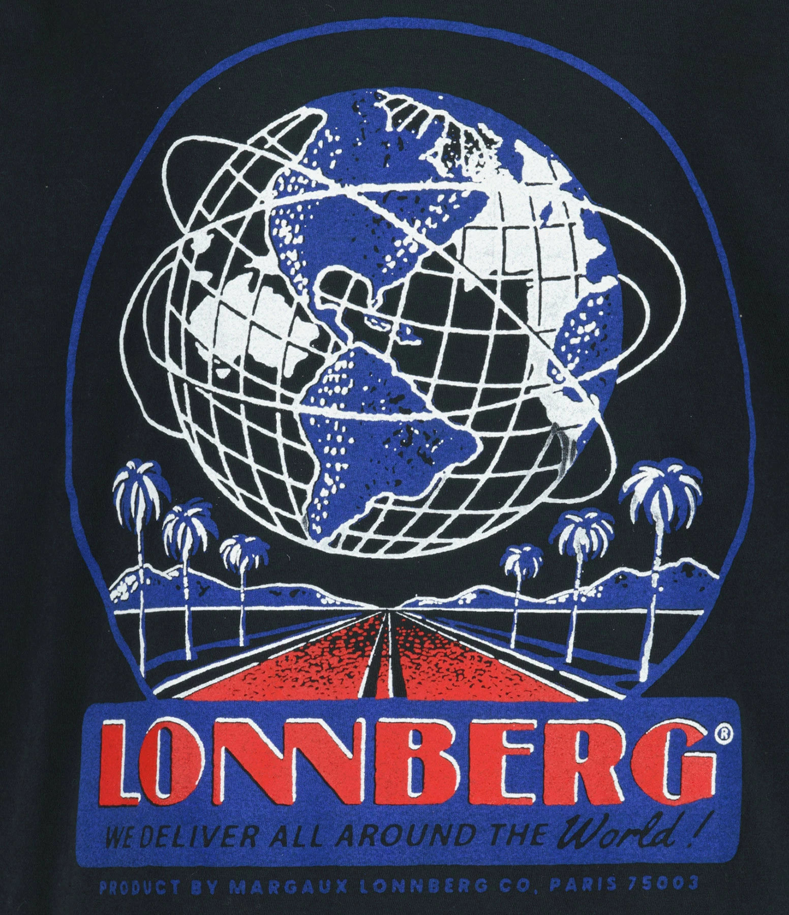 Tee-shirt en coton noir. Illustration et inscription “Lonnberg we deliver all around the world !” sérigraphiées en rouge et bleu sur le devant. Manches courtes. Col rond. Coupe droite. Base droite.