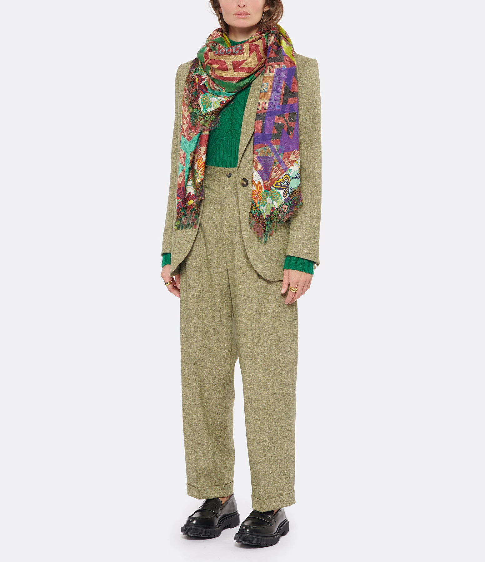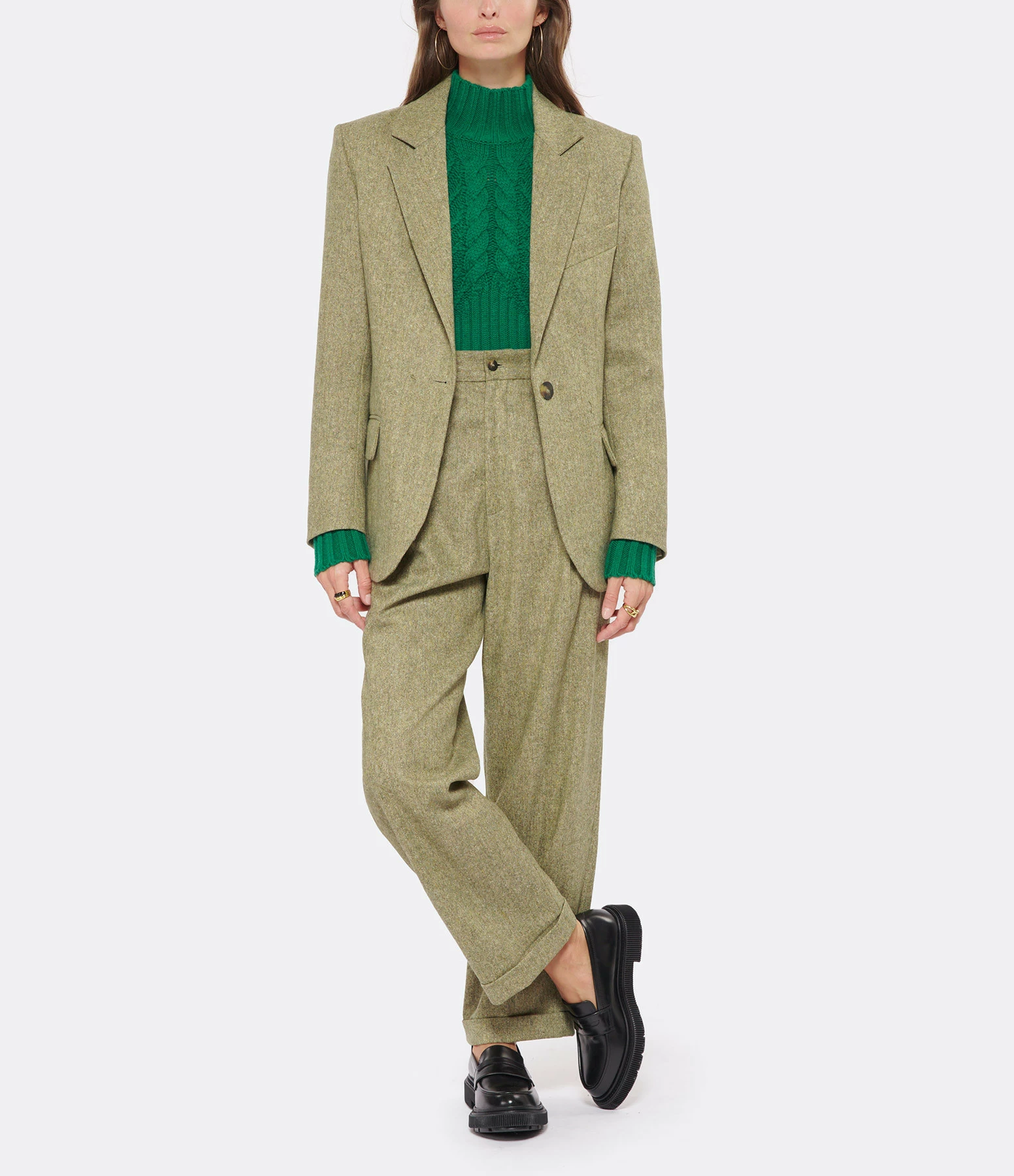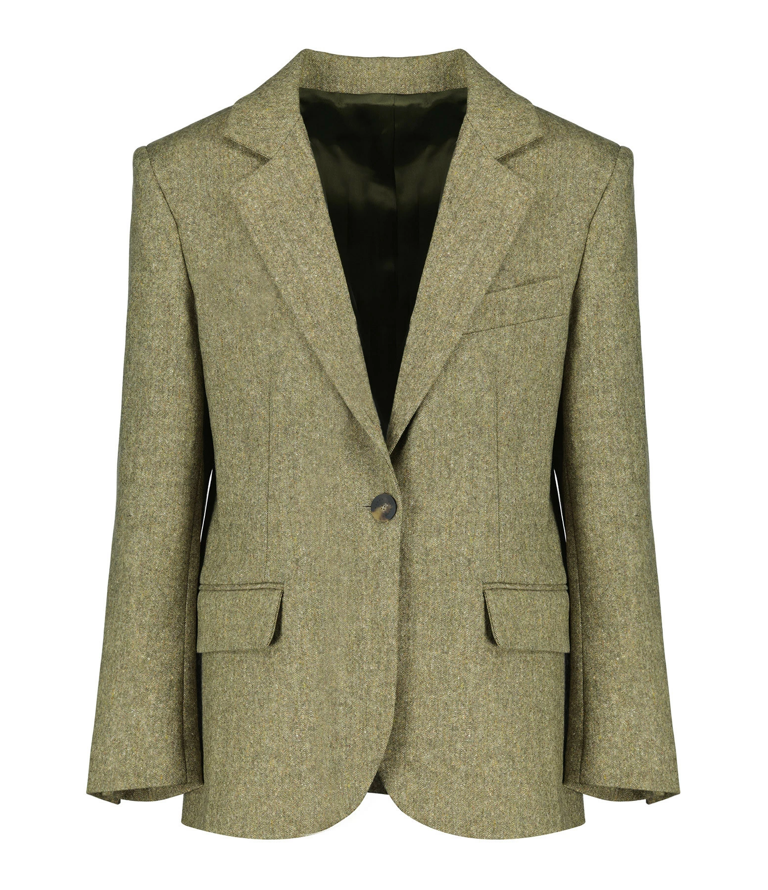 Blazer en laine tweed vert et beige. Col tailleur cranté. Manches longues. Fermeture boutonnée. Deux poches plaquées à rabat à l’avant. Coupe droite. Base arrondie.