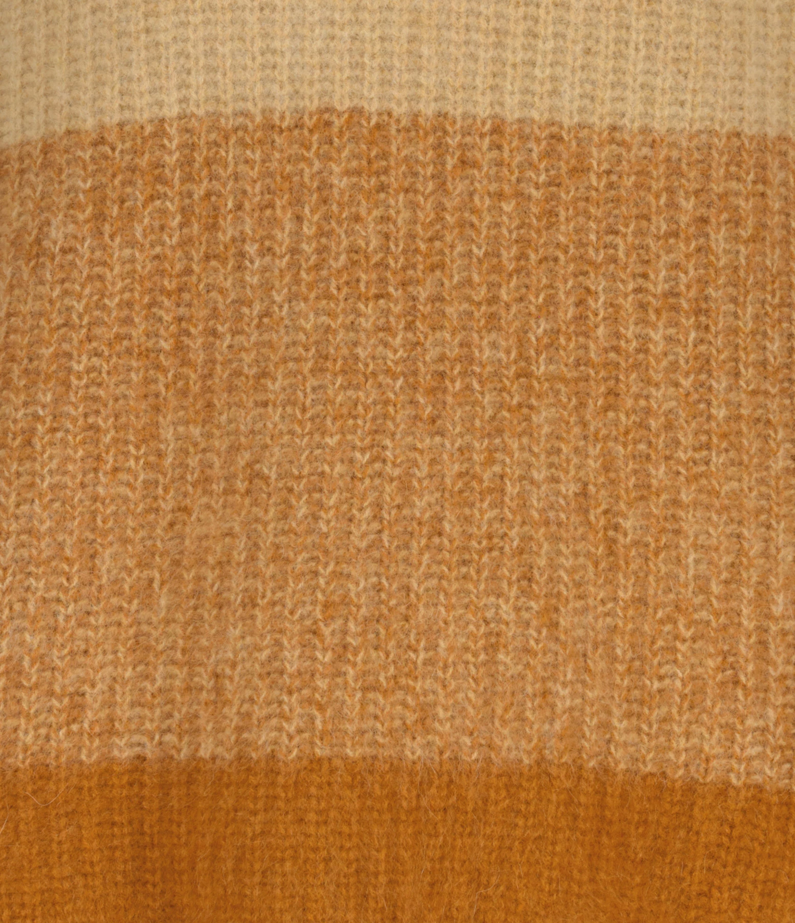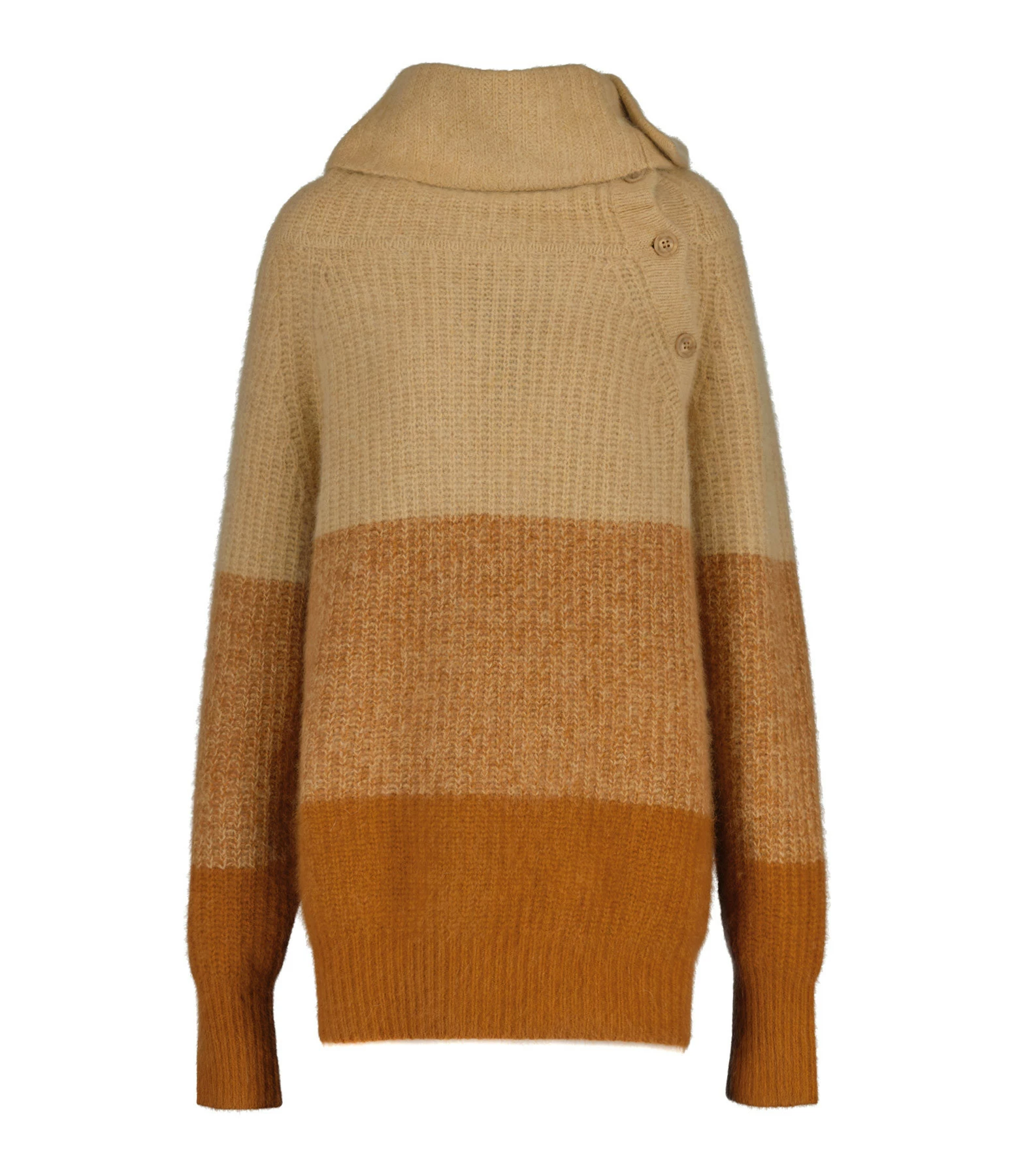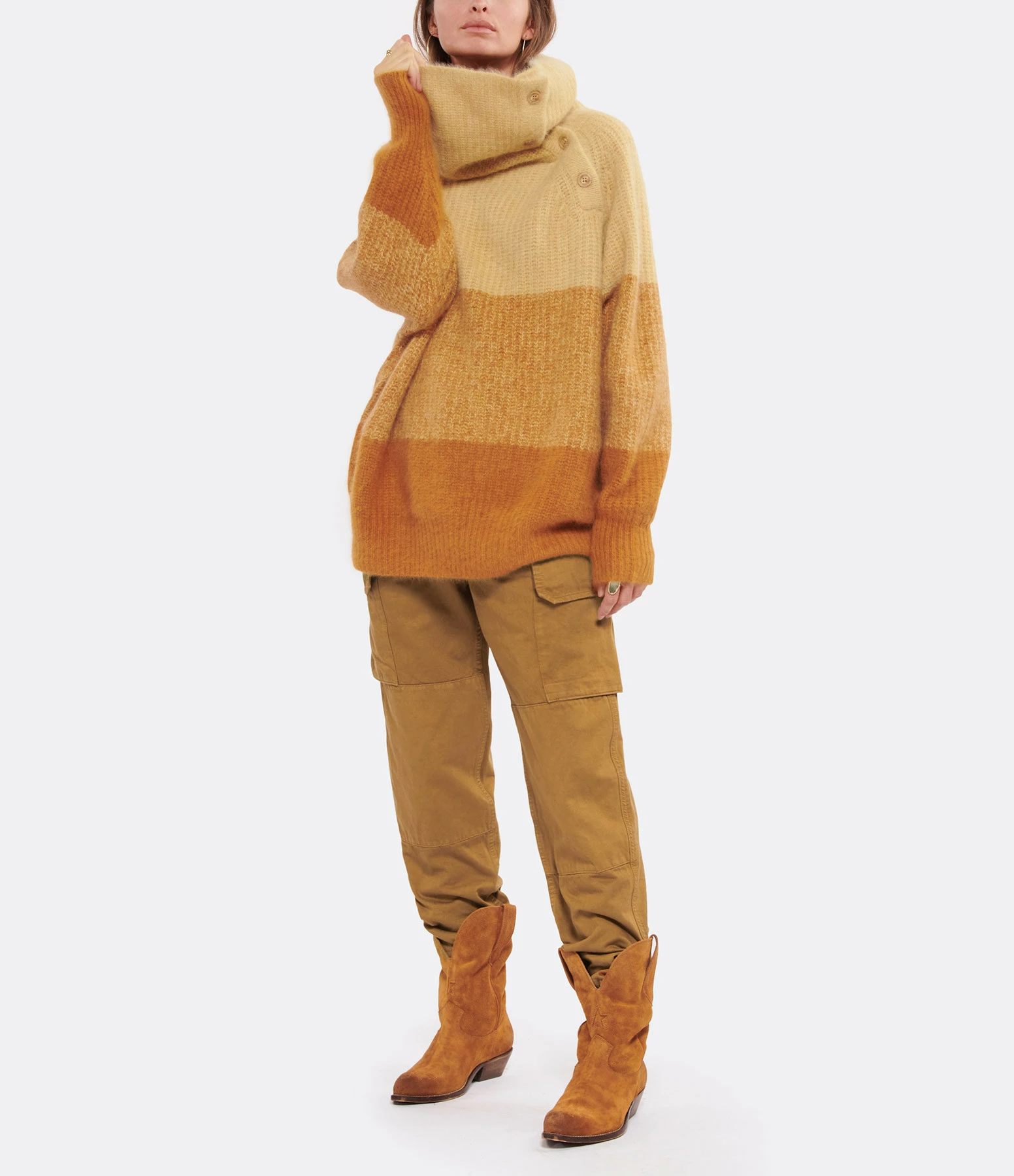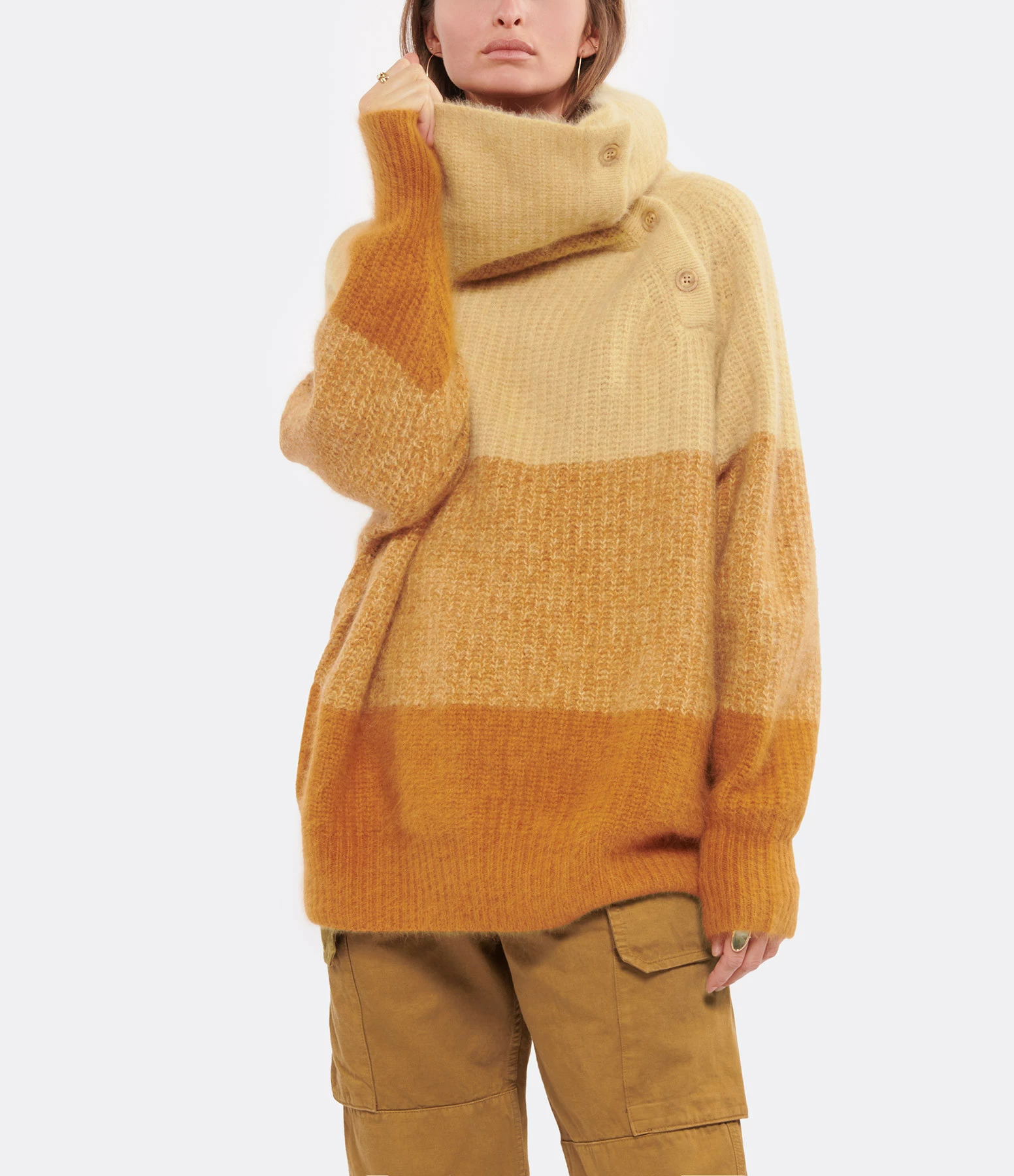 Pull en laine ocre et beige. Col roulé avec fermeture boutonnée sur le côté. Manches longues avec poignets côtelés. Coupe ample. Base arrondie côtelée.