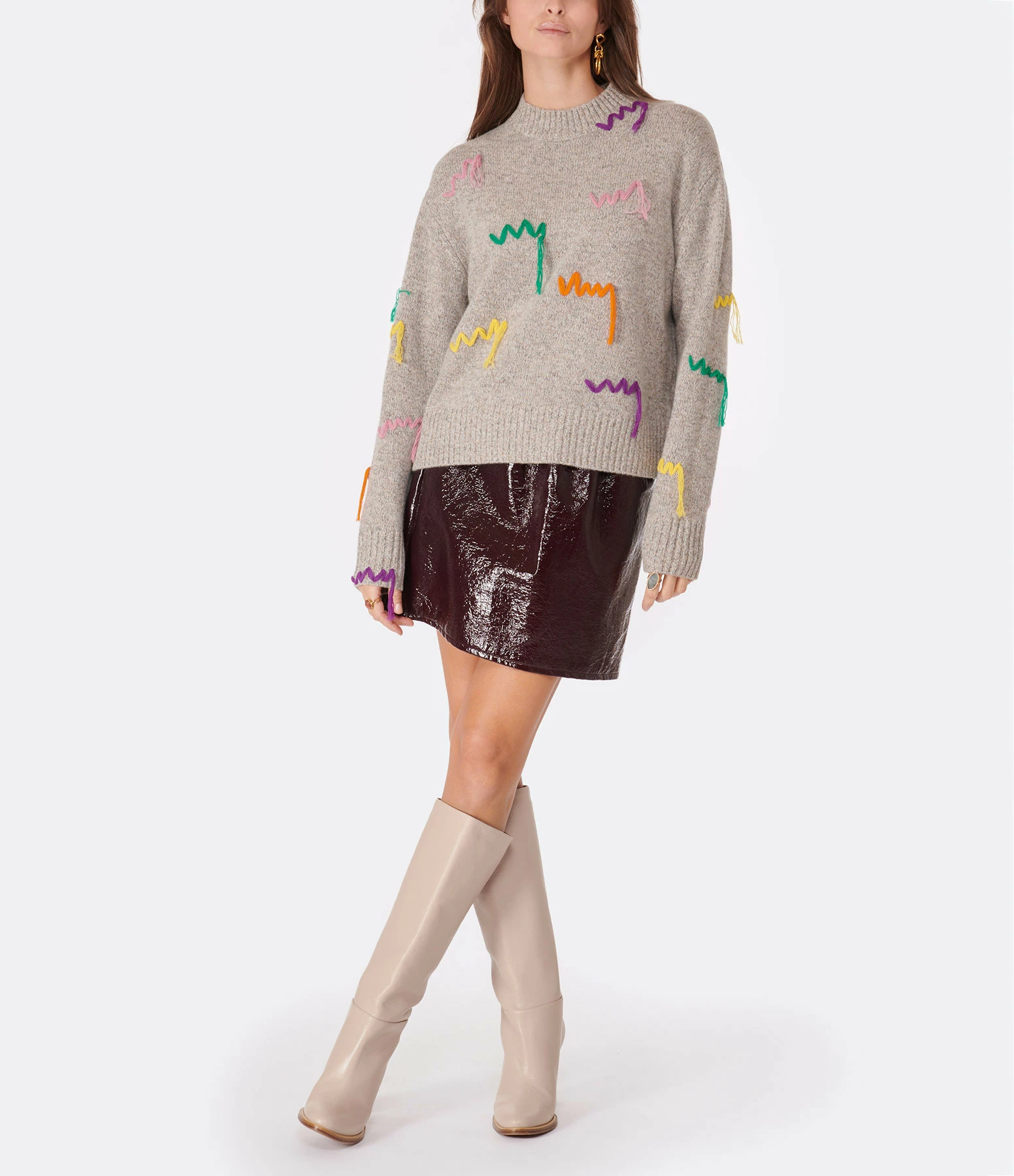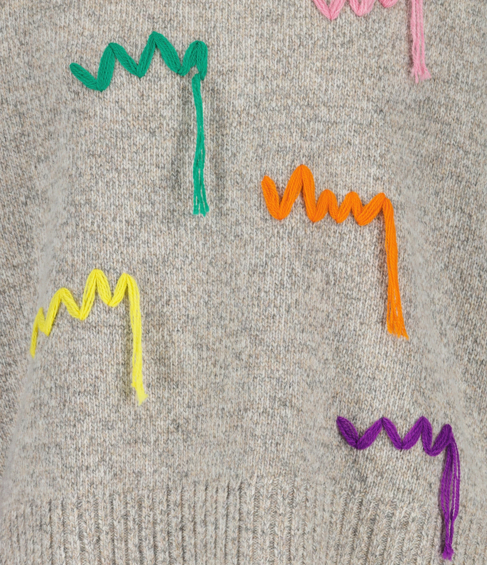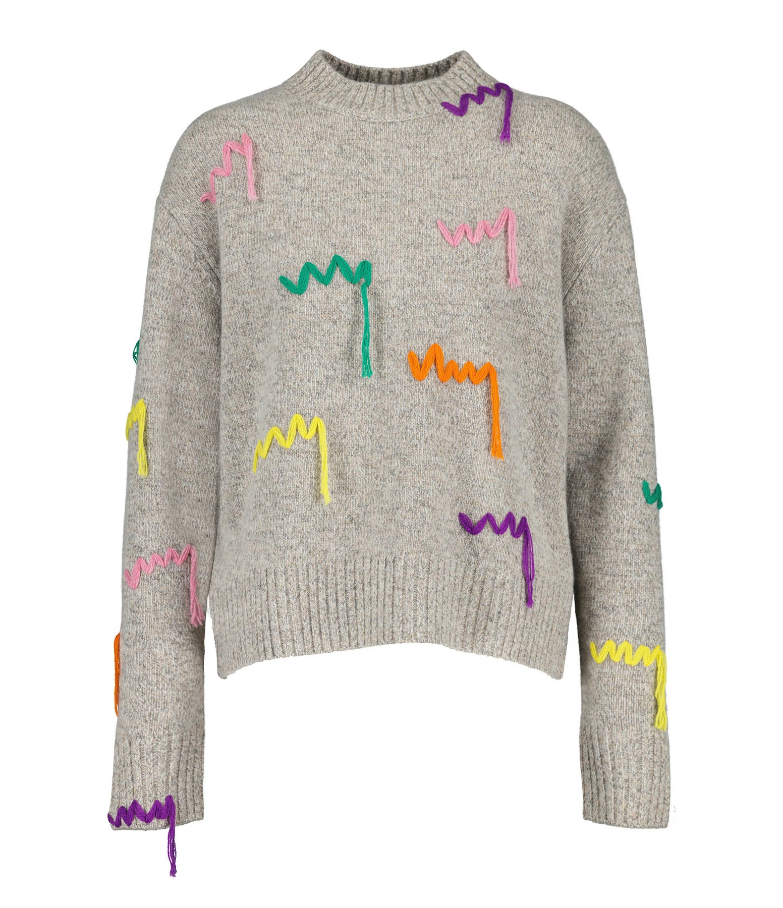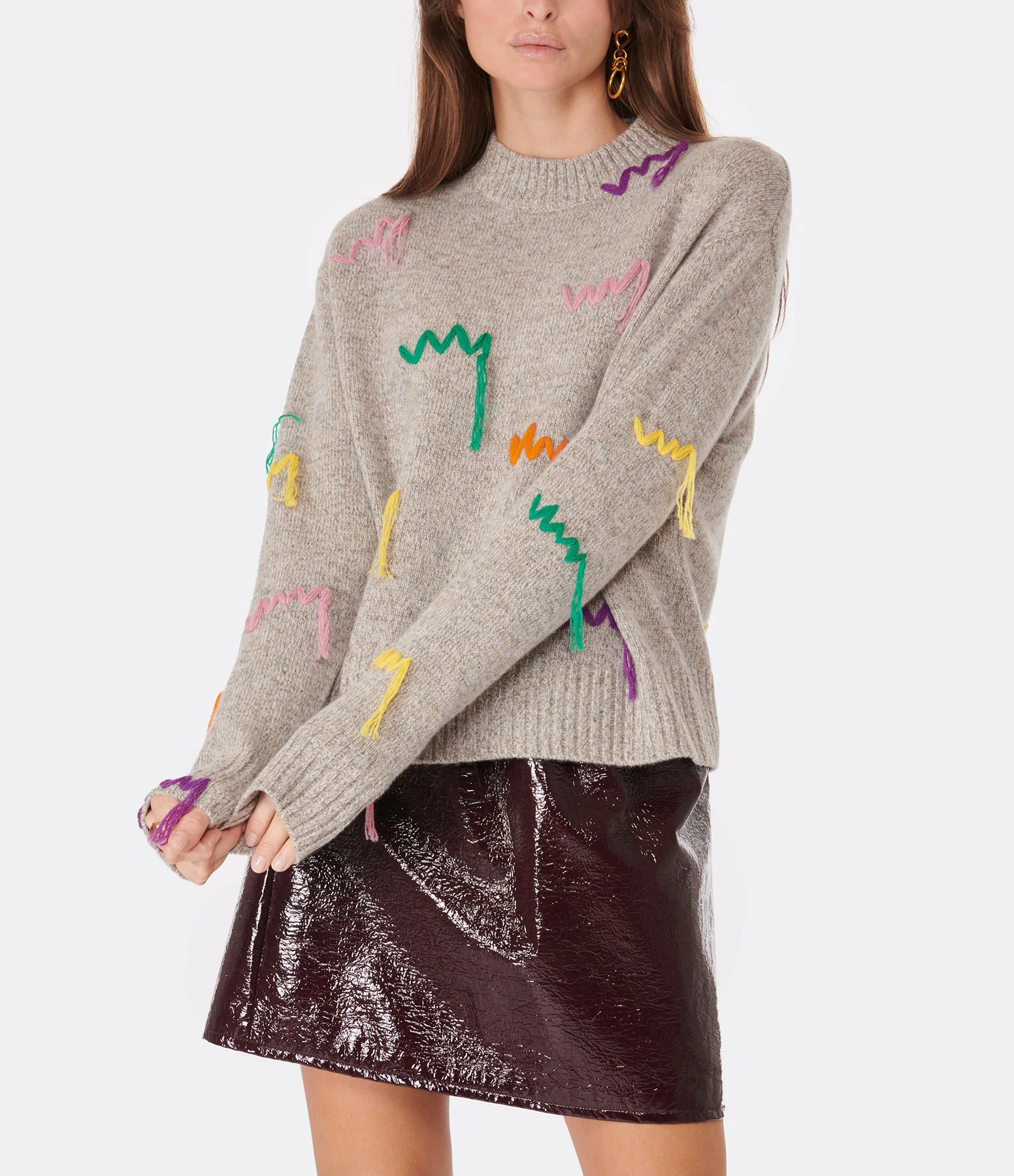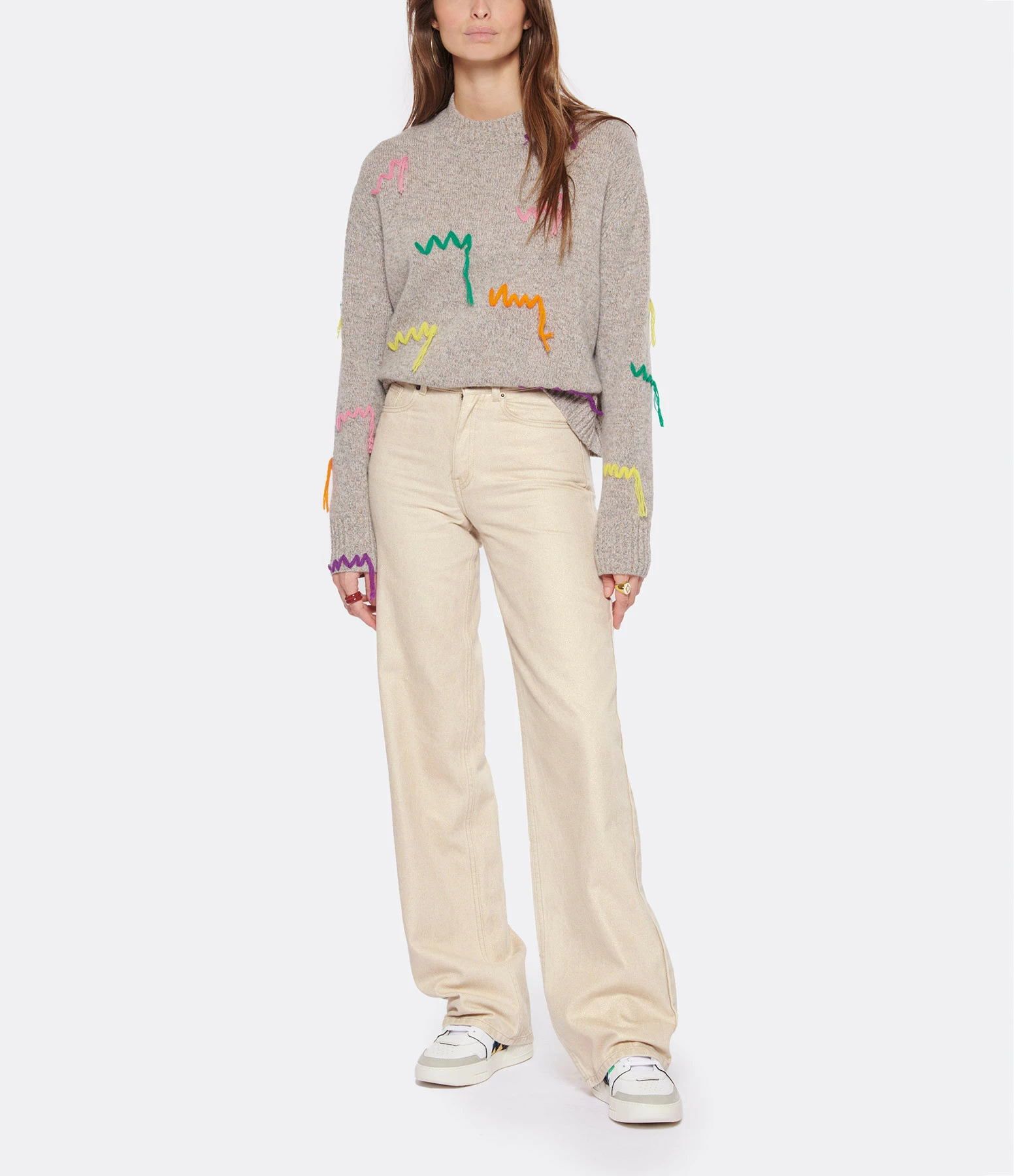 Pull en maille de laine mérinos gris chiné se démarquant par des broderies de fils lâches multicolores. Col rond côtelé. Manches longues avec poignets côtelés. Coup droite. Base droite côtelé.