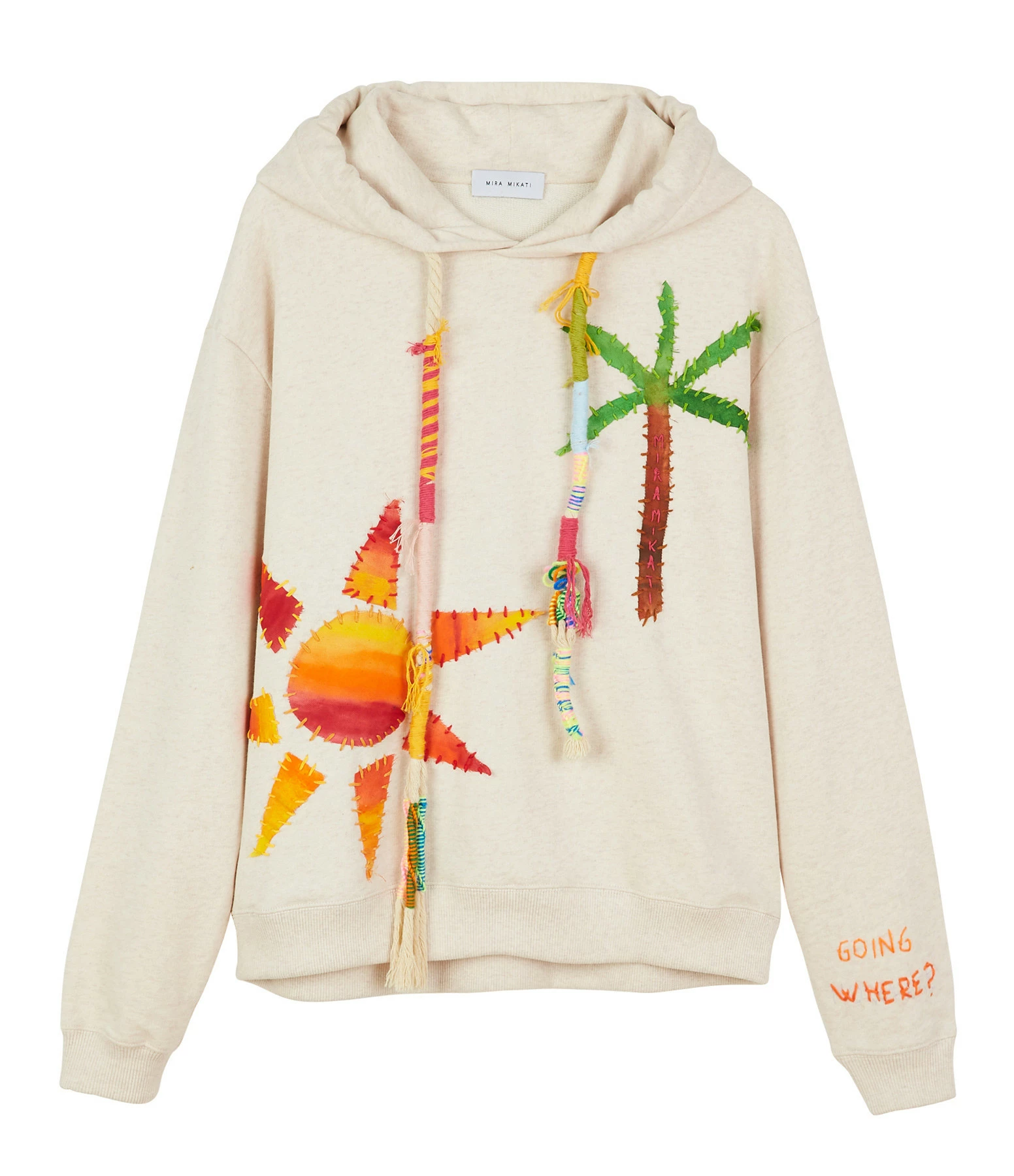 Sweatshirt à capuche en coton molletonné crème chiné avec patchs colorés imprimés brodés. Capuche avec double cordon de serrage multicolore et perles. Manches longues avec poignets côtelés. Inscription “GOING WHERE ?” brodée en orange sur la manche gauche. Coupe droite ample. Base droite côtelée. Non doublé.