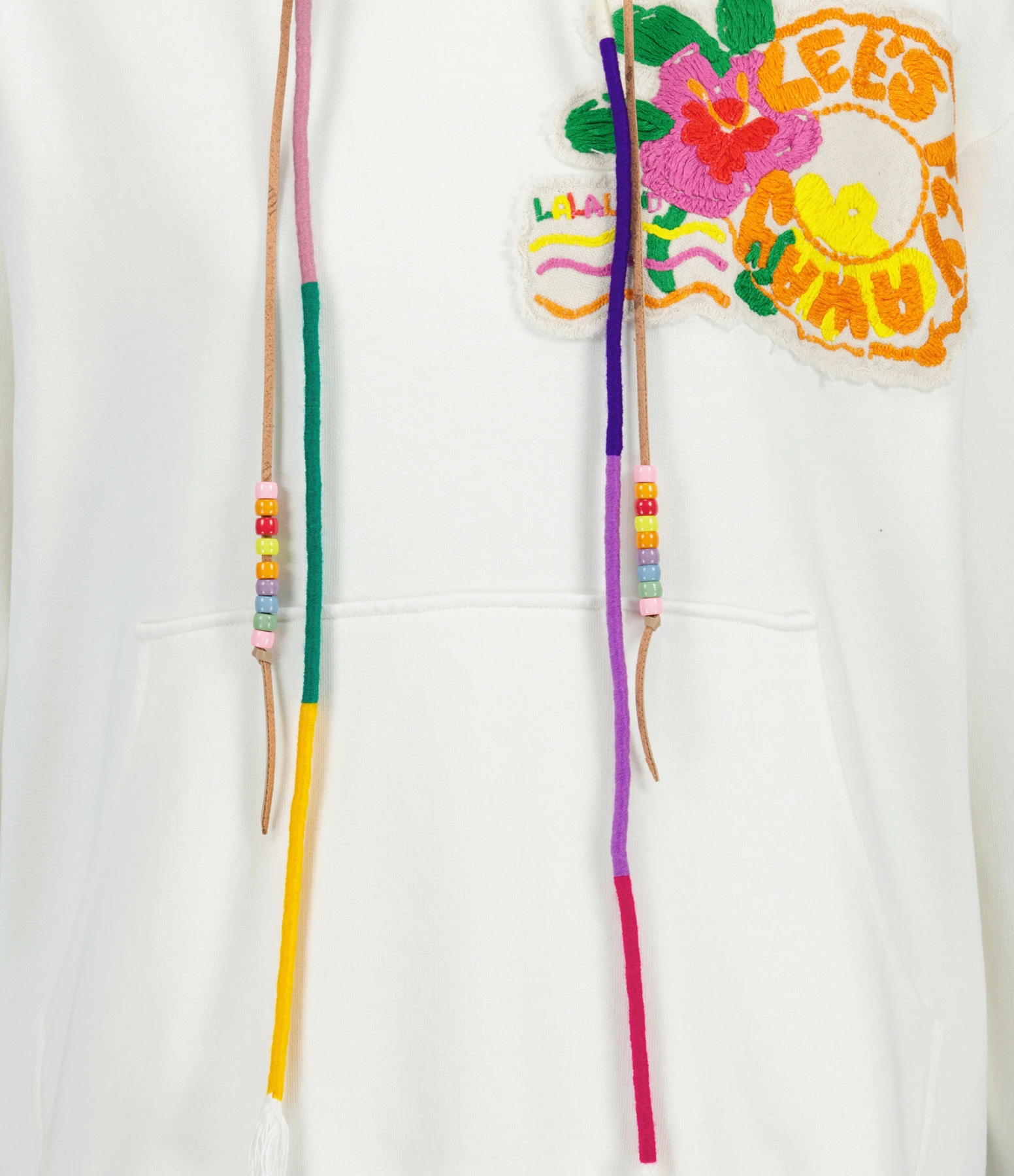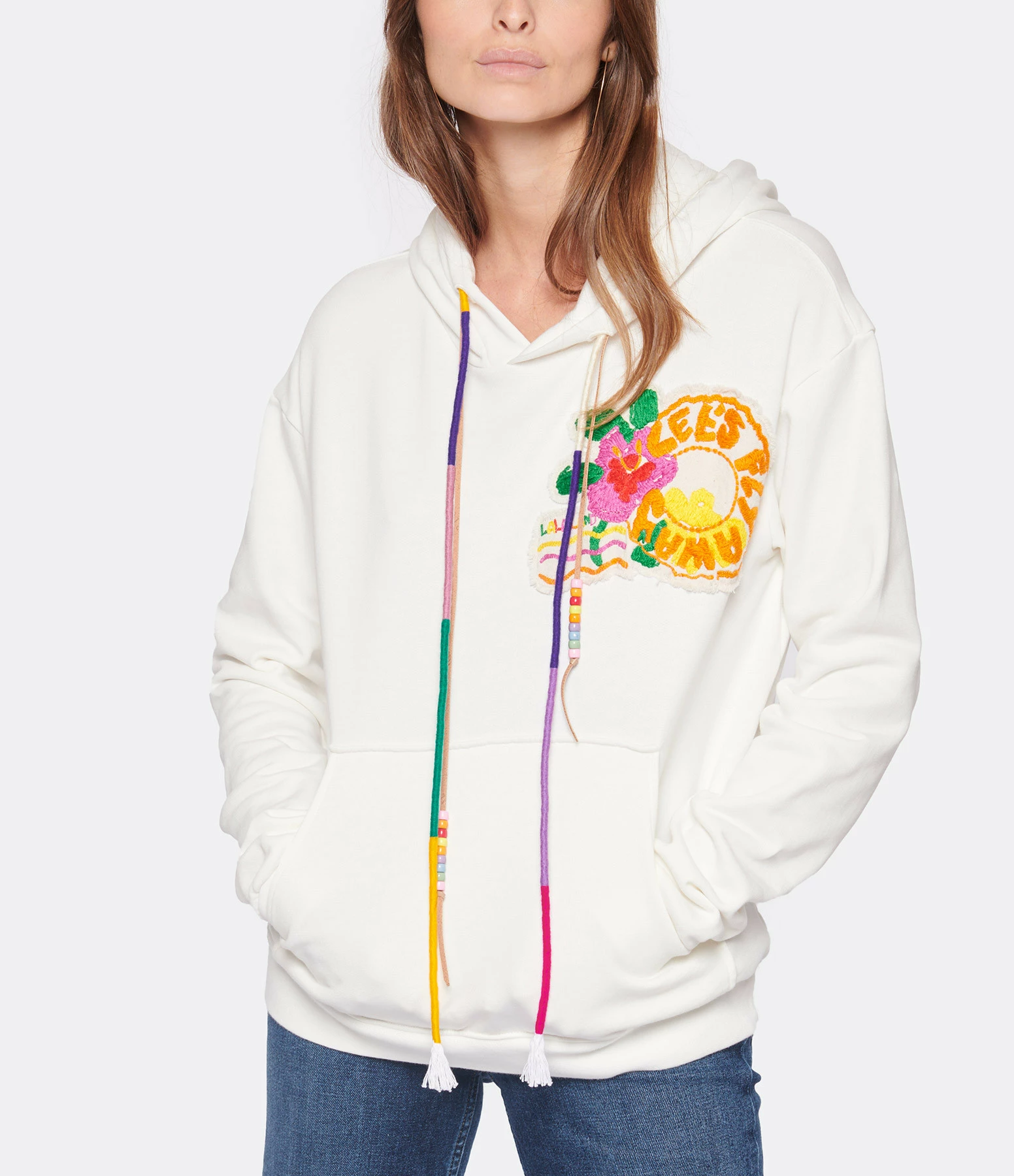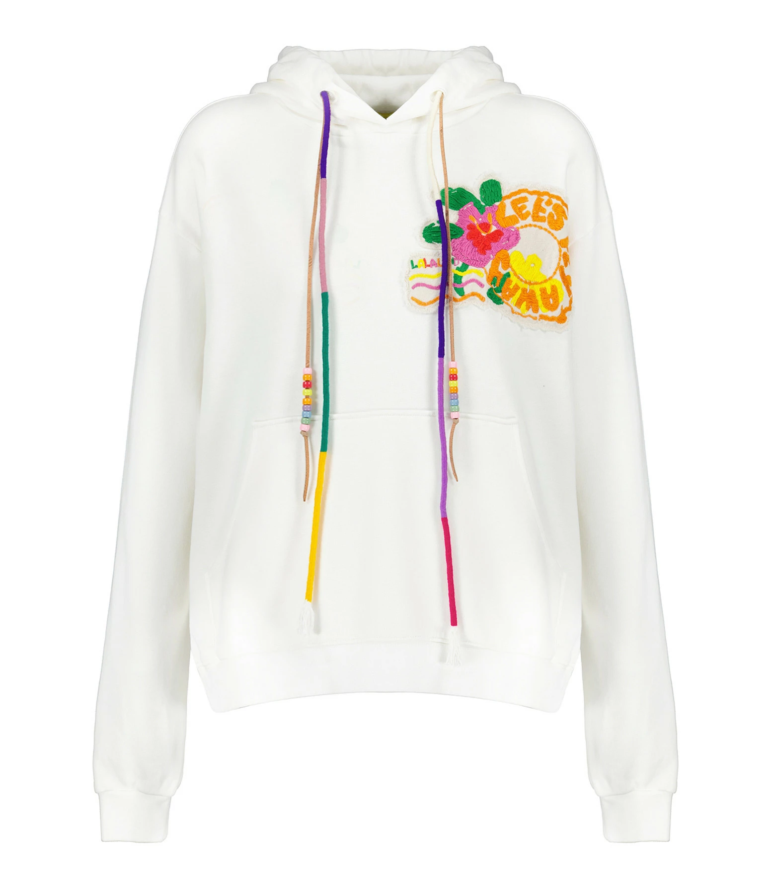 Sweatshirt en coton molletonné blanc orné d’un patch brodé d’un fleur hawaïenne et de l’inscription “Let’s fly away”. Col à capuche avec cordons de serrages multicolores avec des perles. Manches longues avec poignets côtelés. Poche kangourou sur le devant. Coupe droite. Base droite côtelée.