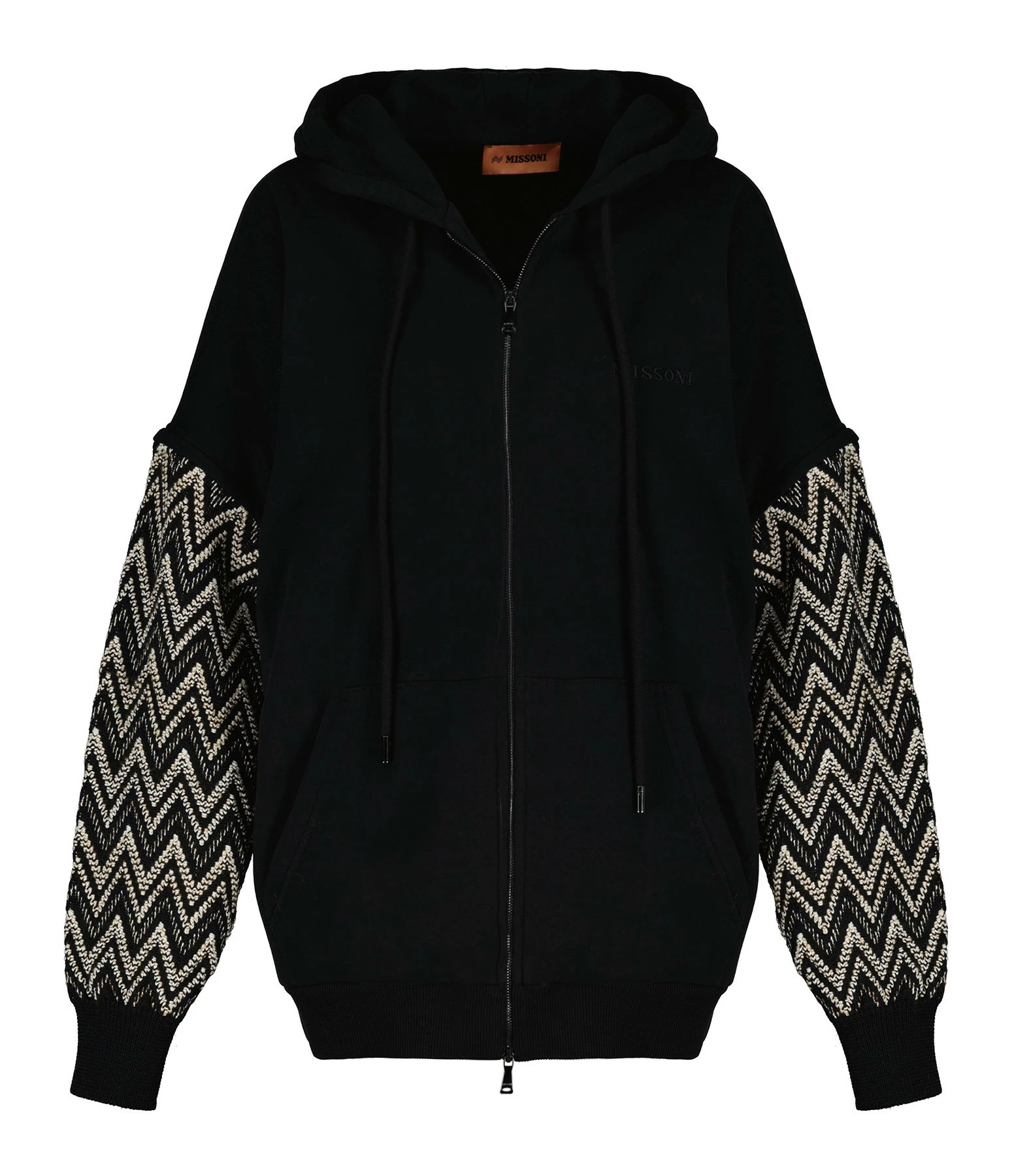 Gilet style sweatshirt en coton molletonné noir. Manches longues brodées écru et beige. Fermeture zippée. Empiècement “MISSONI” noir sur poitrine. Col à capuche avec liens de serrage. Poche kangourou à l’avant. Coupe droite. Base arrondie.