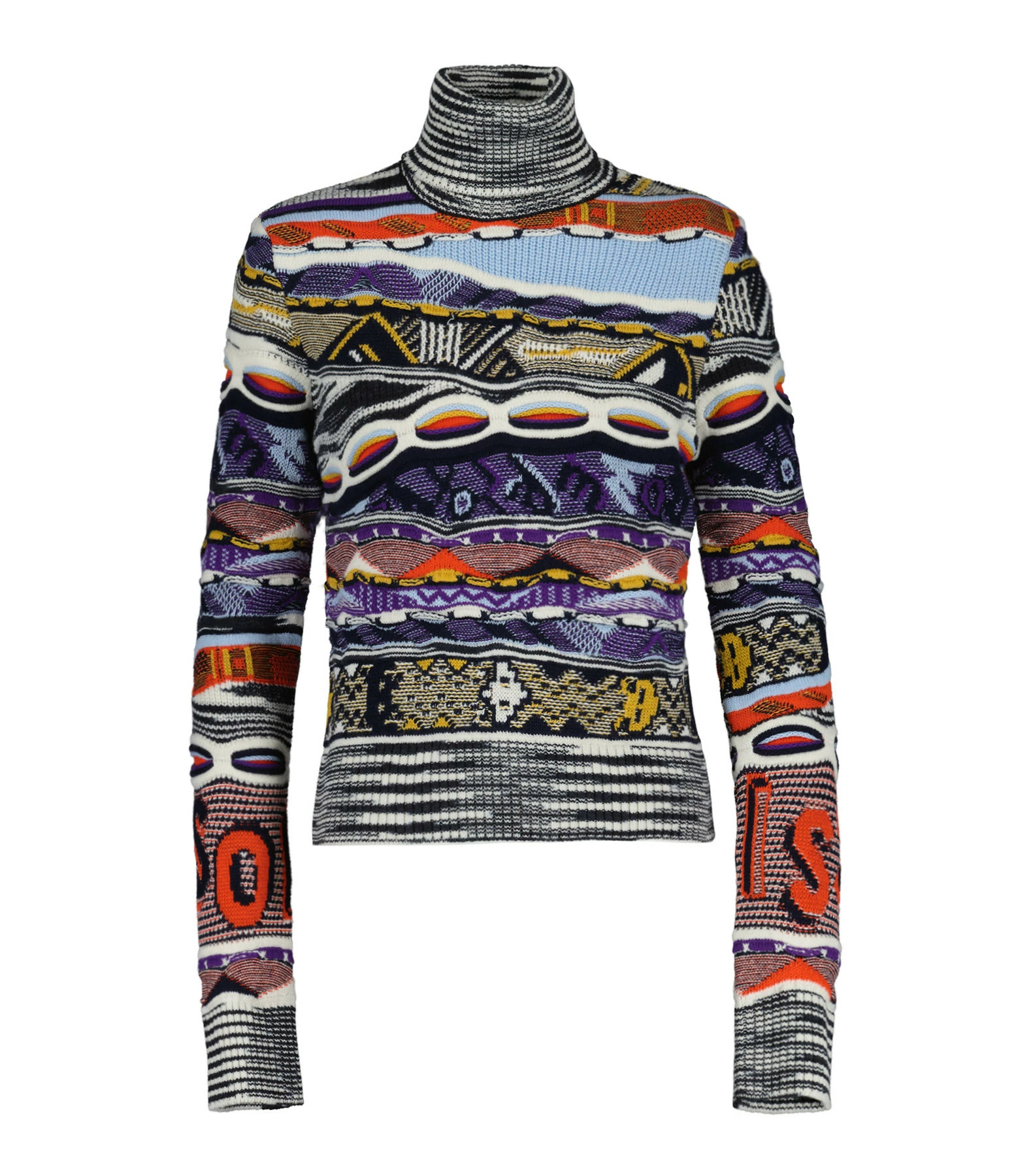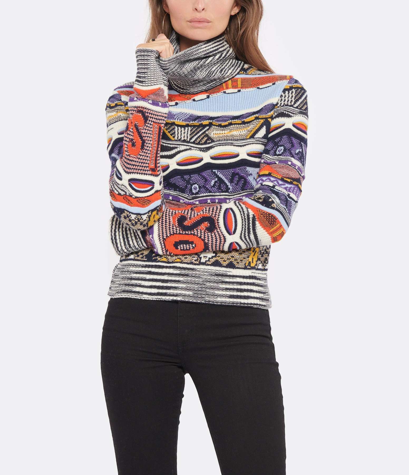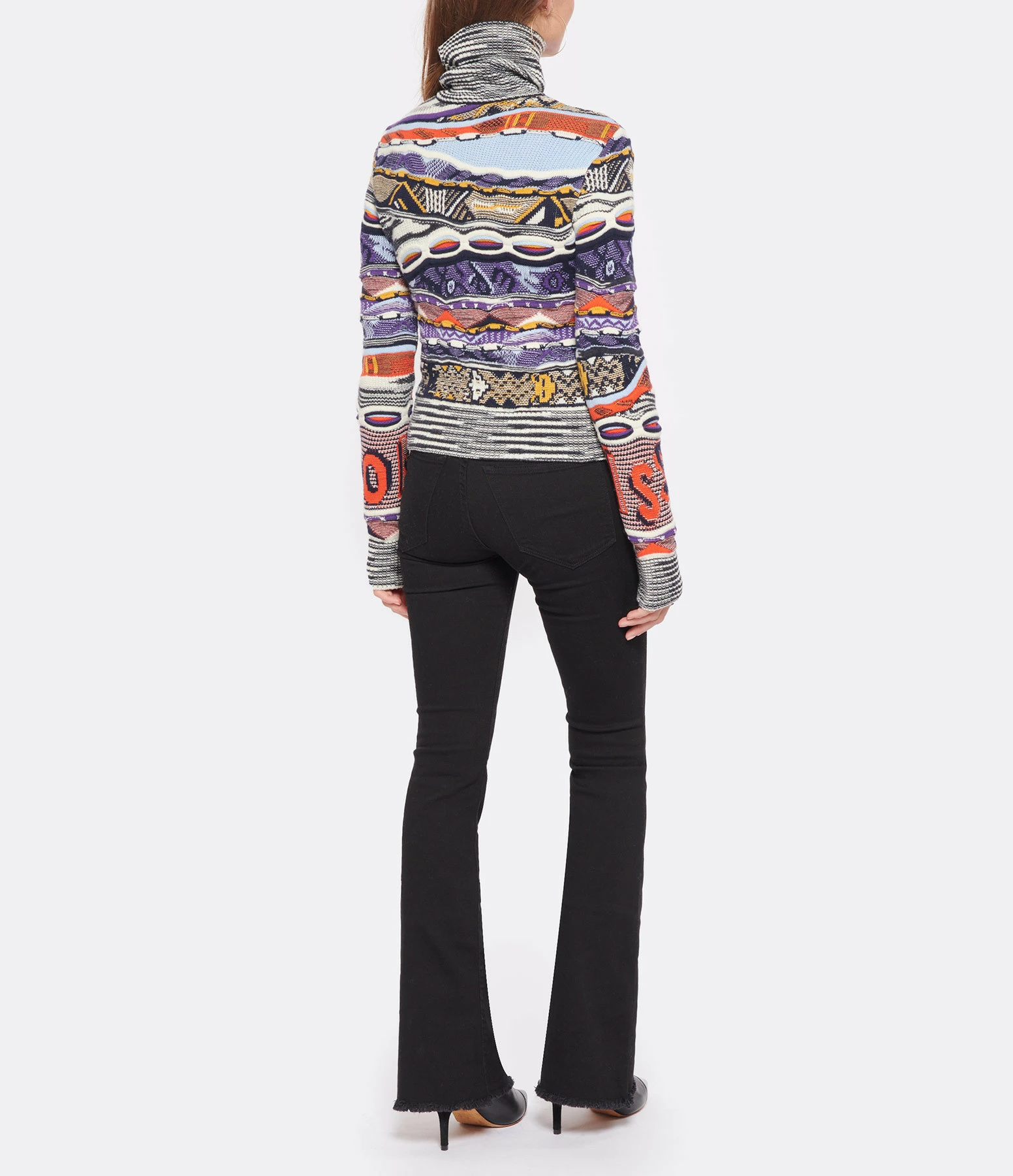 Pull en maille de laine multicolore. Col roulé côtelé. Manches longues. Coupe cintrée. Base droite côtelée.