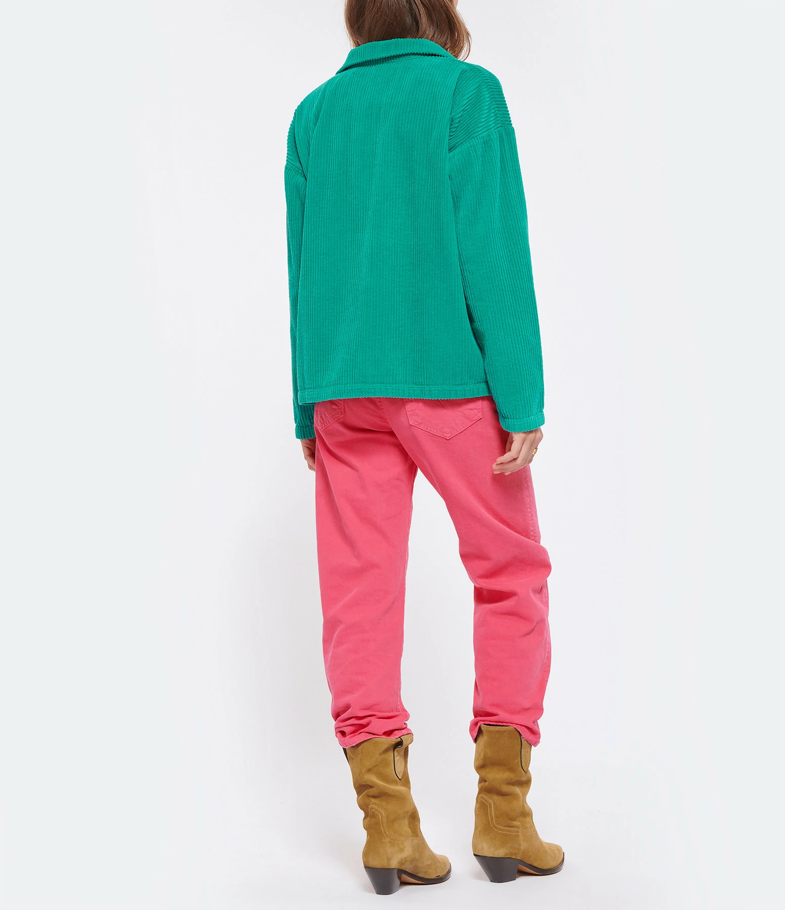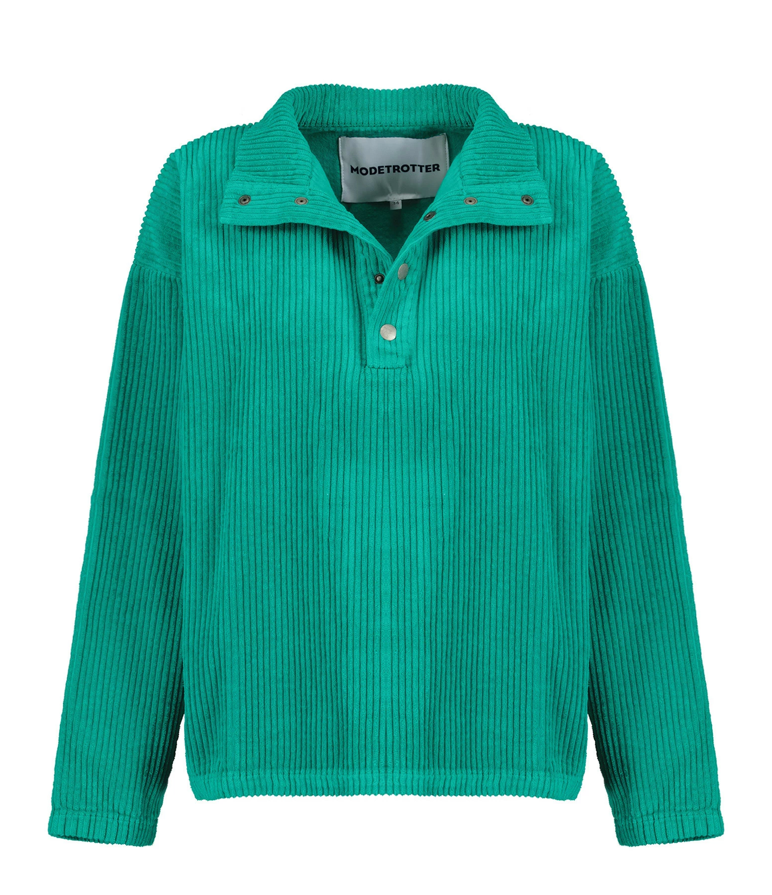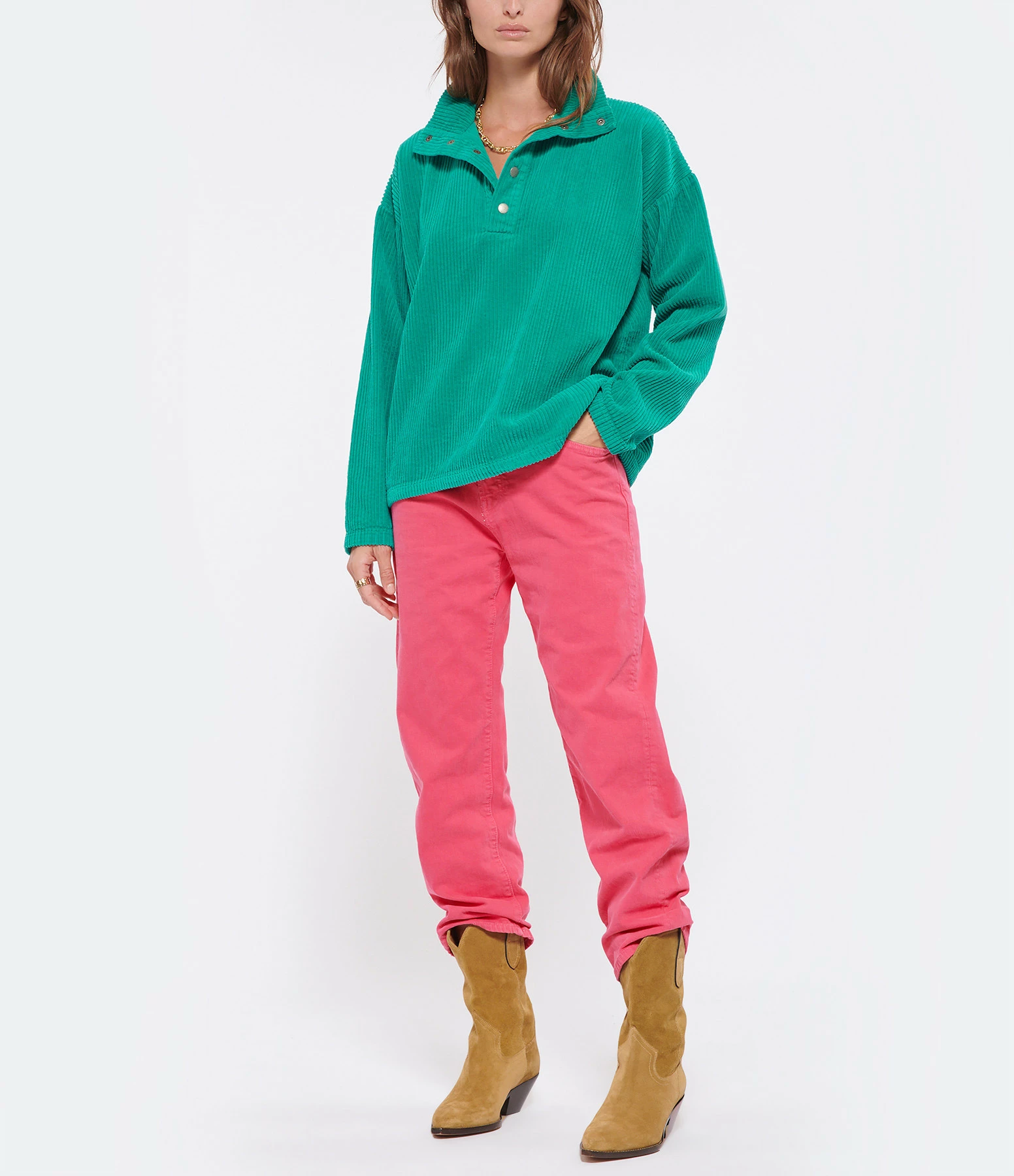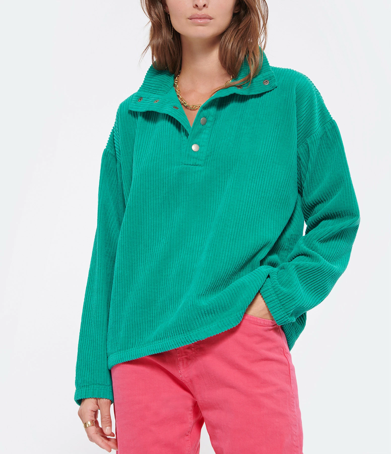 Pull en velours côtelé vert émeraude. Col camionneur à boutons. Manches longues. Coupe droite. Base droite.