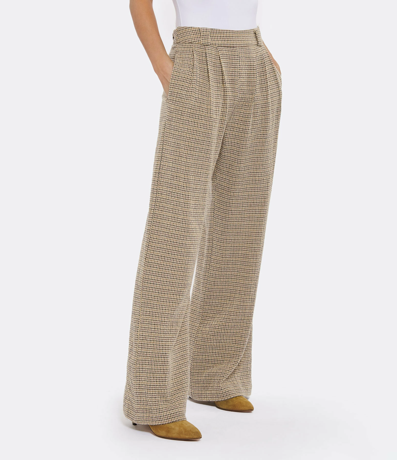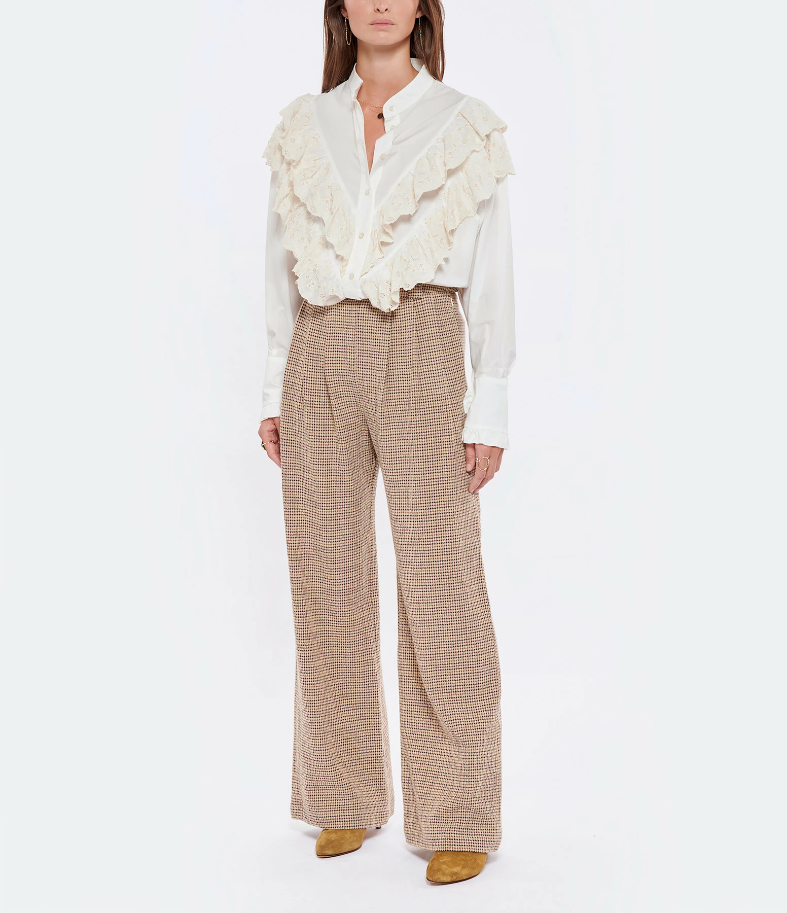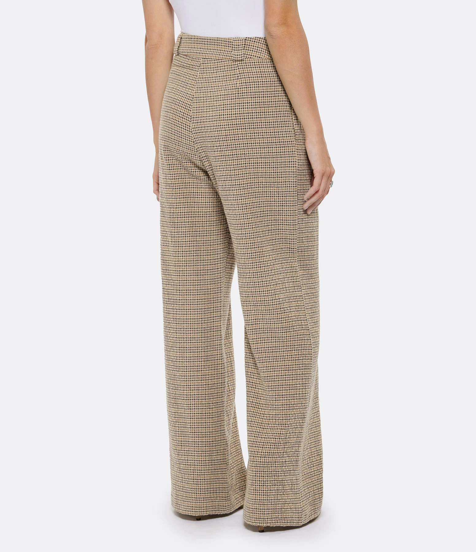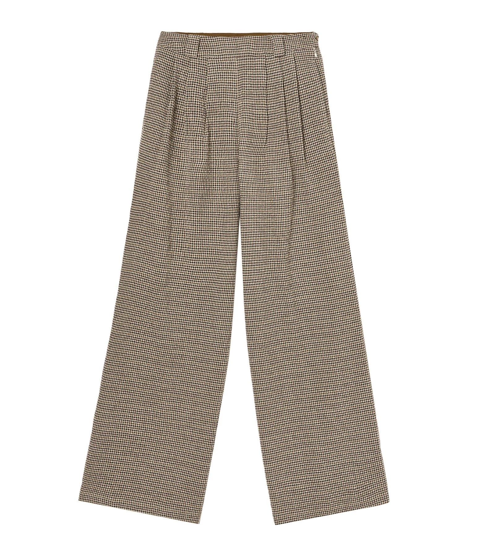 Pantalon large en laine à imprimé pied de poule beige et marron. Taille haute. Passants pour ceinture. Deux poches italiennes. Coupe large. Fermeture par zip.