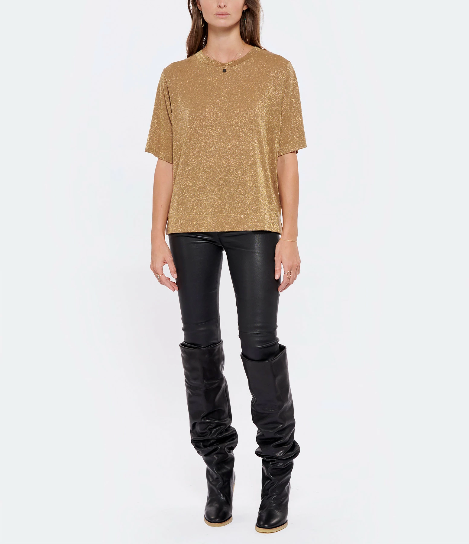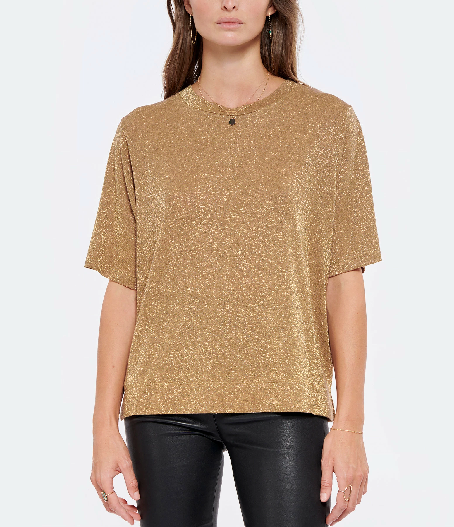 Tee-shirt doré pailleté. Col rond. Manches courtes. Coupe oversize et base droite. Légèrement fendu sur les côtés. Non doublé.