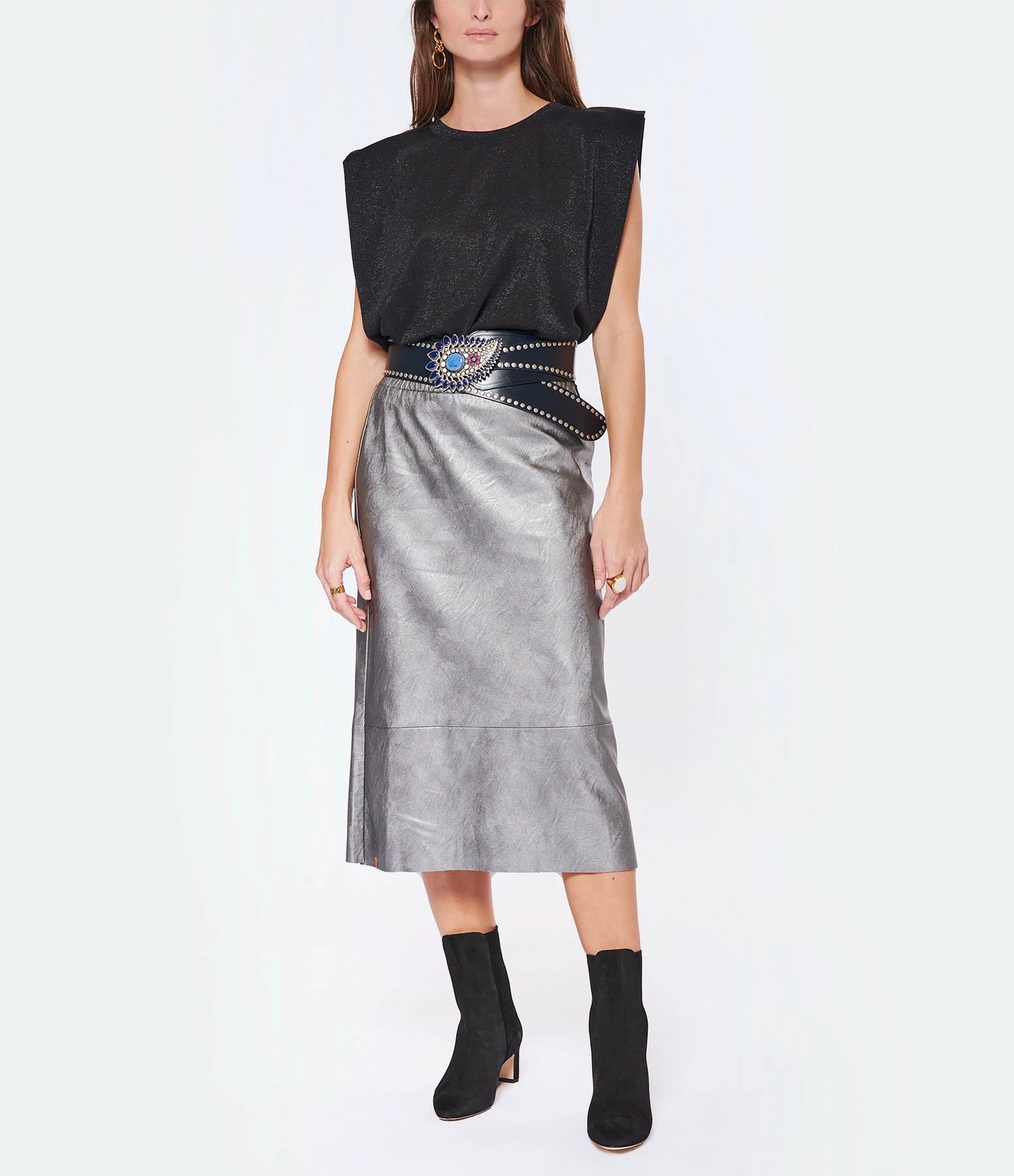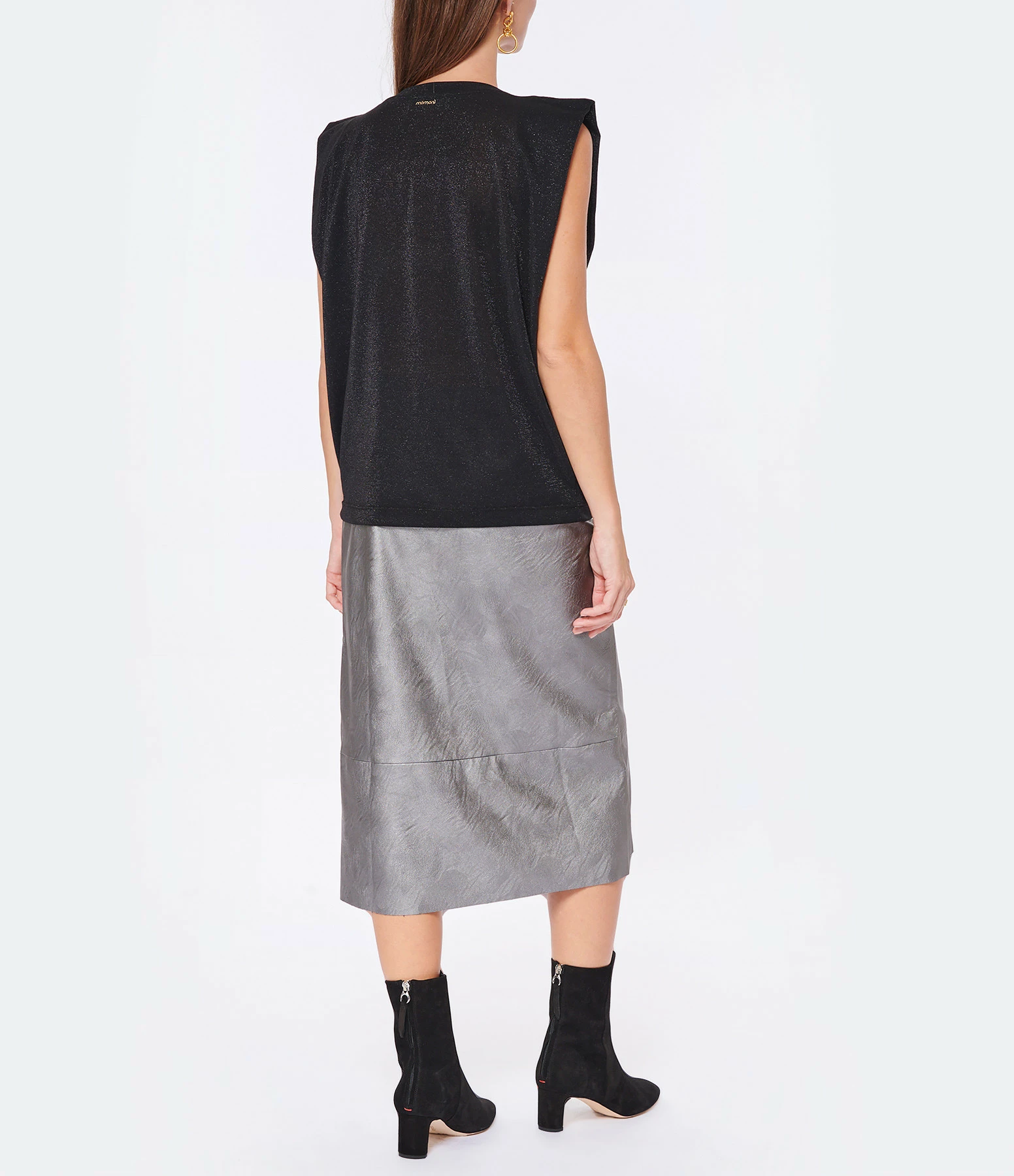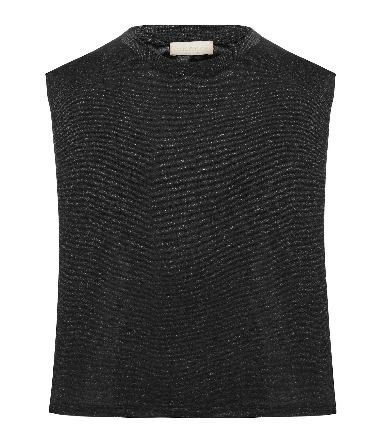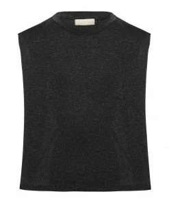 Top noir et lurex argenté. Col rond. Sans manches. Coupe droite. Base droite.
