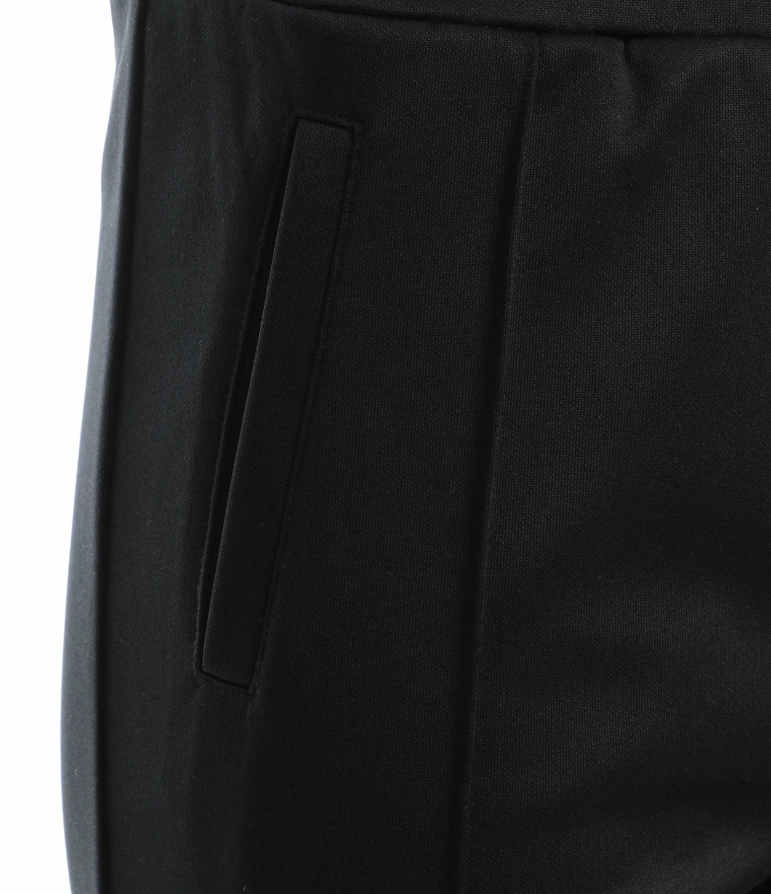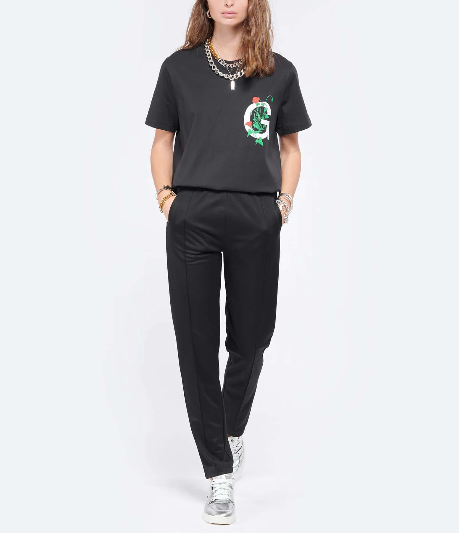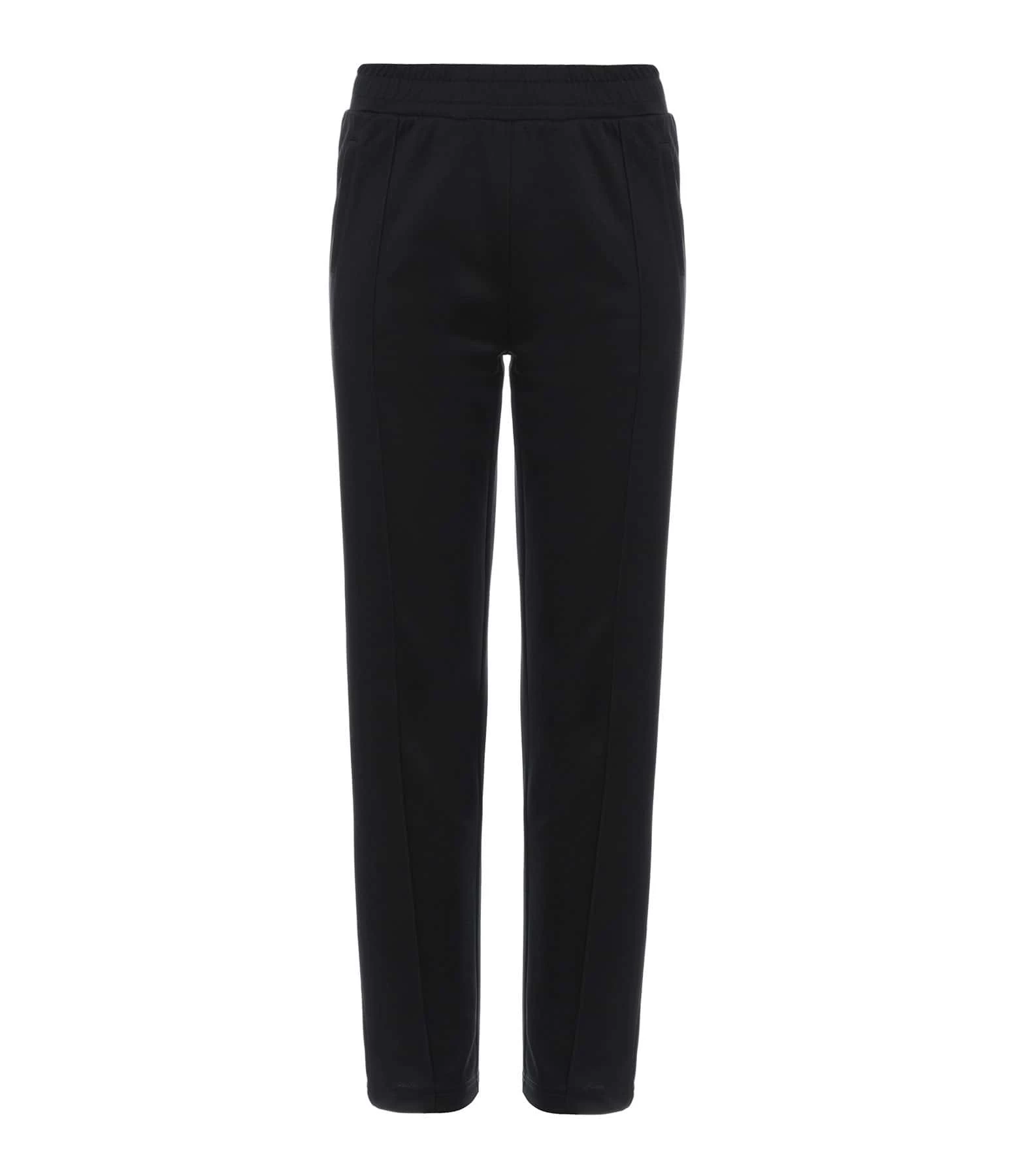 Jogging en tissu noir. Pli pressé à l’avant. Deux poches fendues sur les côtés. Taille élastiquée. Coupe droite.
