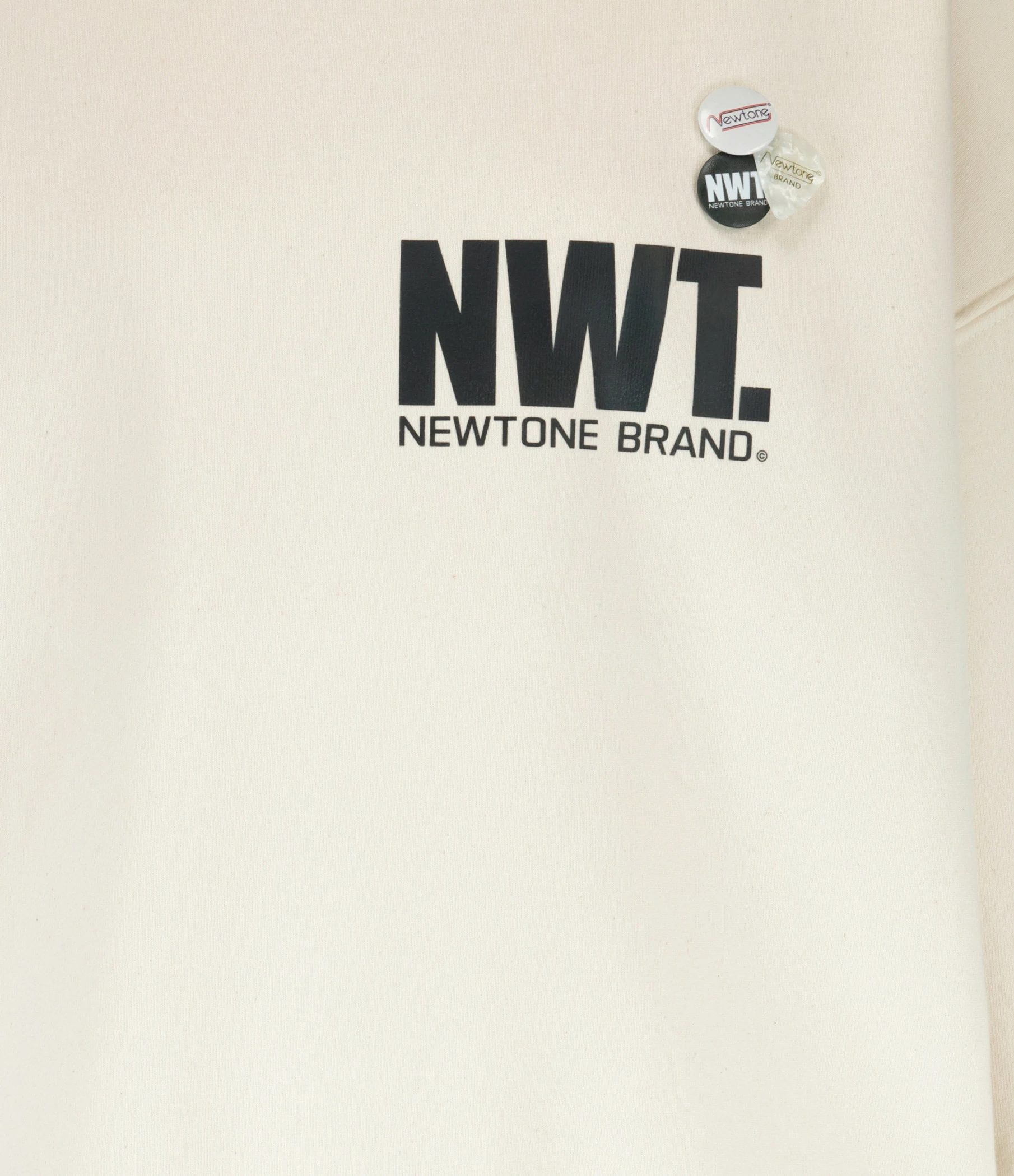 Sweatshirt en coton molletonné beige. Inscription “NWT Newtone Brand” flockée en noir sur le devant. Deux badges et un médiator sur le devant. Col rond côtelé. Manches longues avec poignets côtelés. Coupe ample. Base droite côtelée.