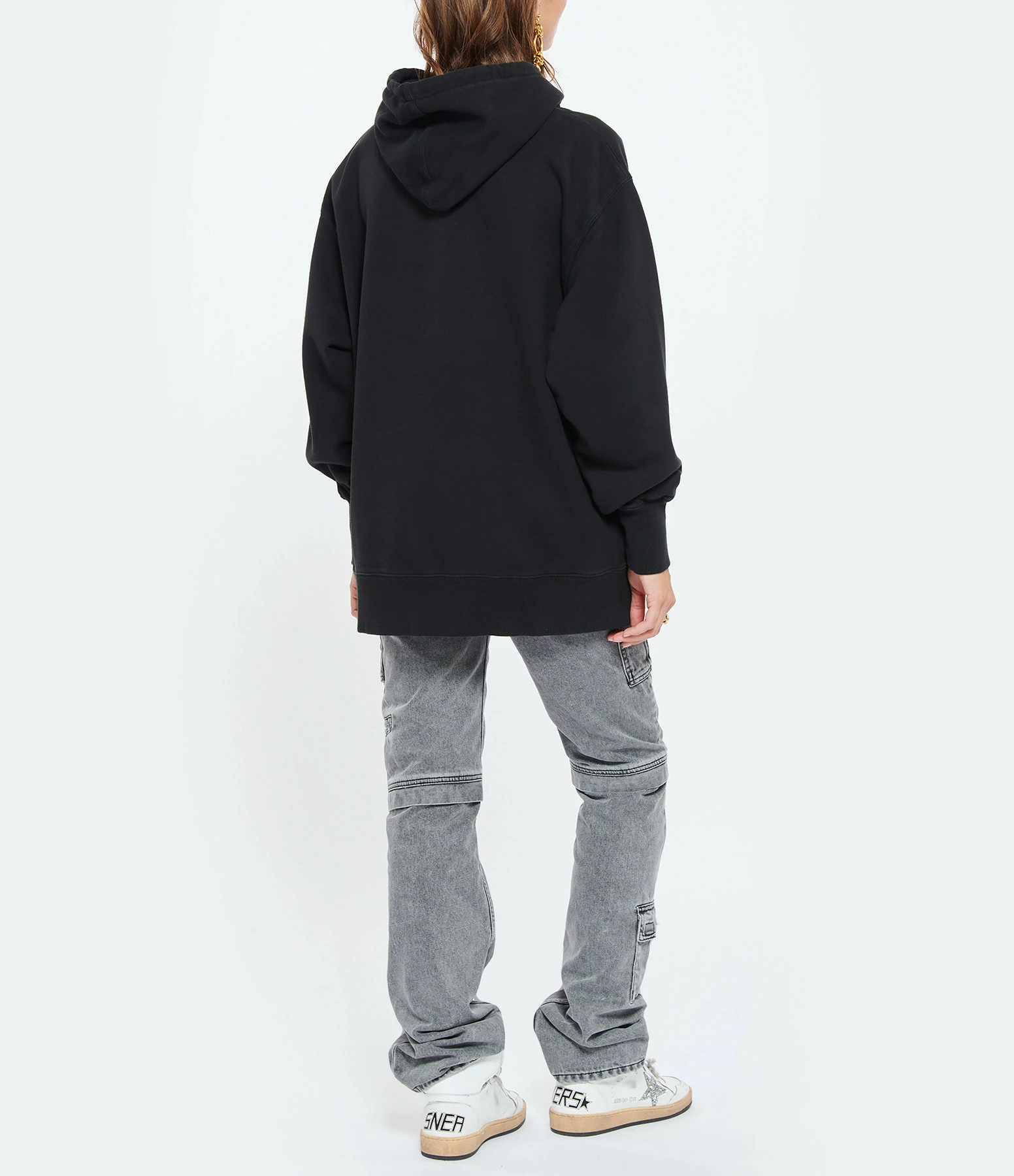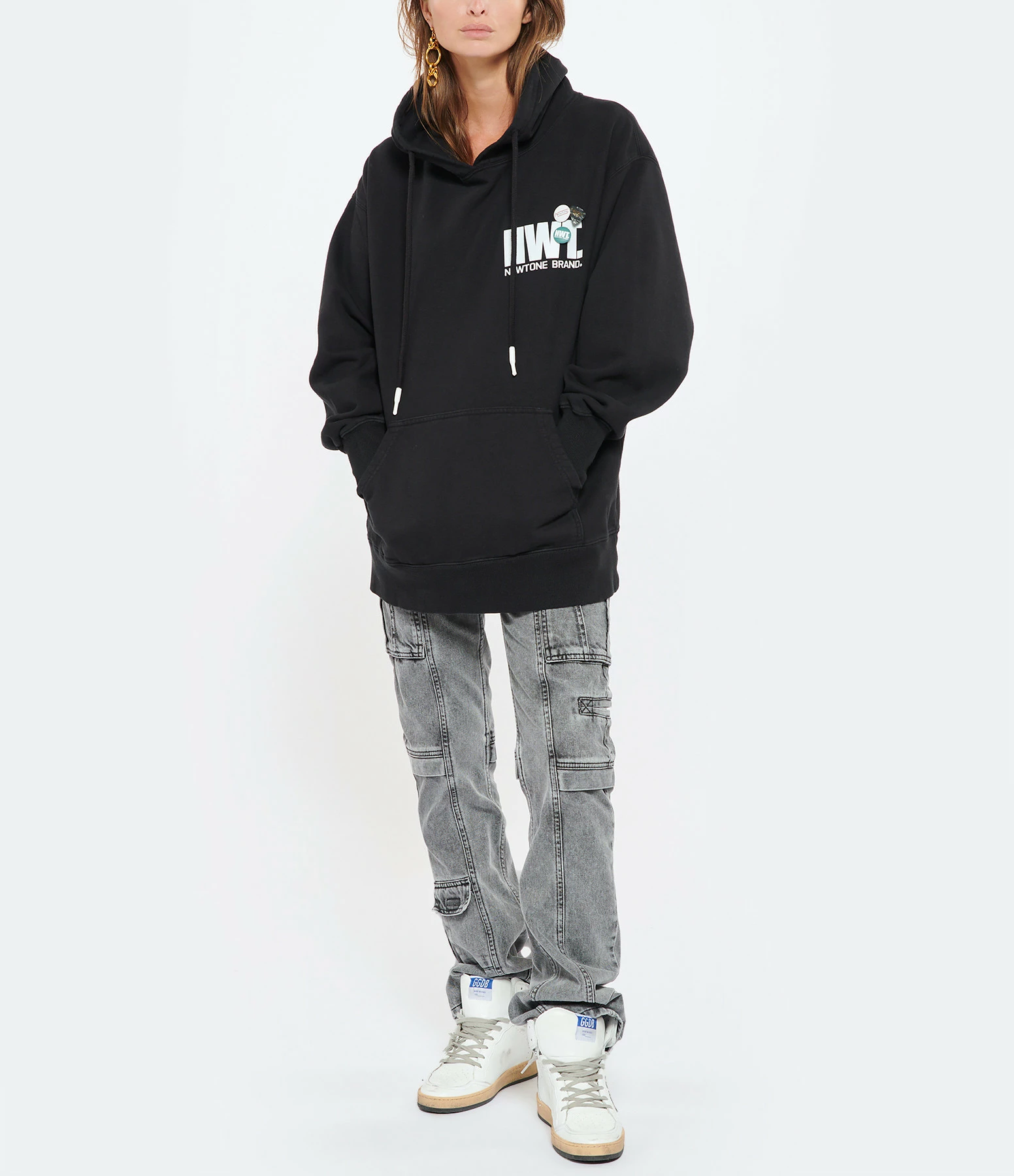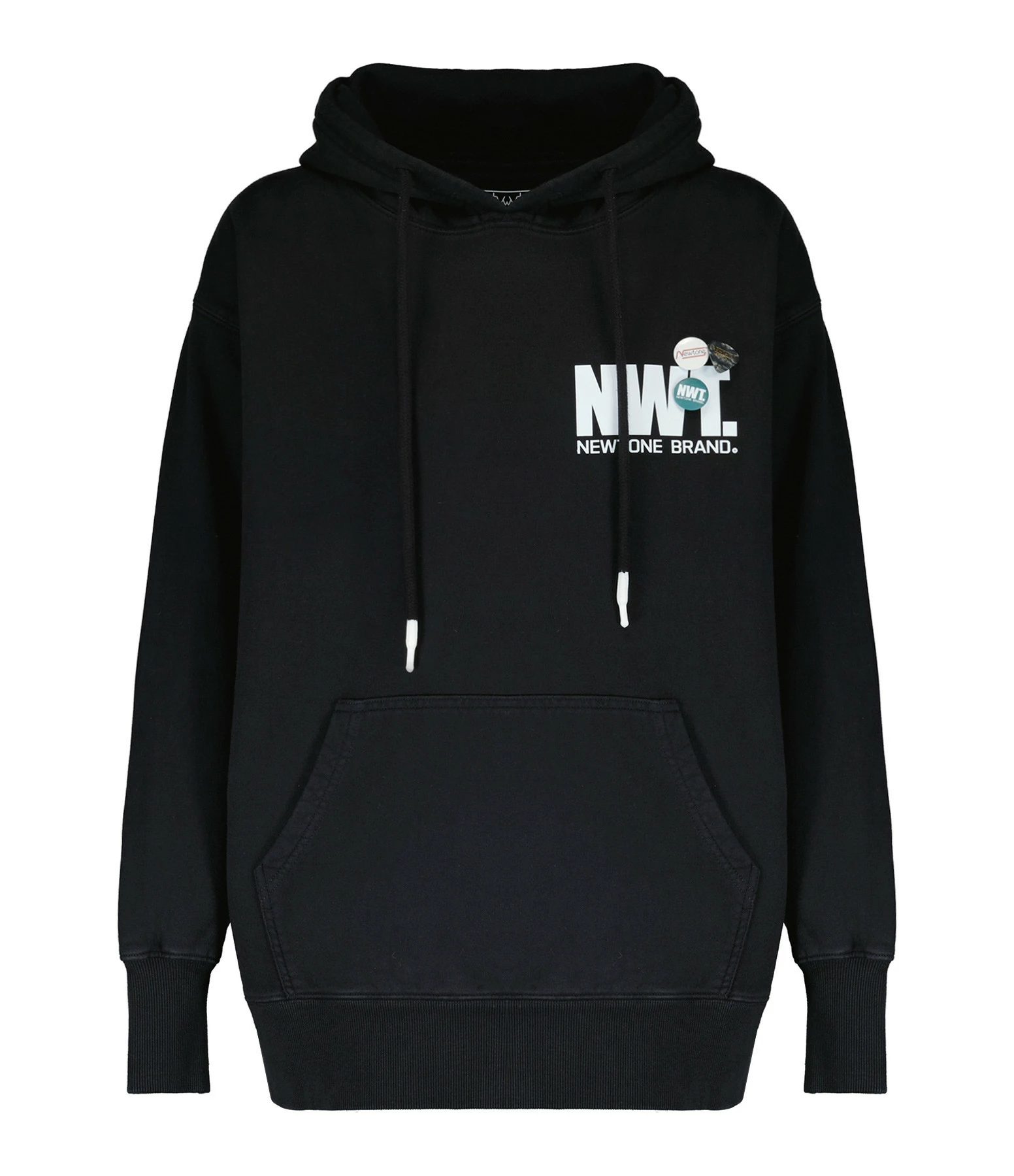 Sweatshirt à capuche en coton molletonné noir. Inscription “NWT Newtone Brand” flockée en blanc sur le devant. Deux badges et un médiator sur le devant. Col à capuche. Manches longues avec poignets côtelés. Une poche kangourou sur le devant. Coupe ample. Base droite côtelée.