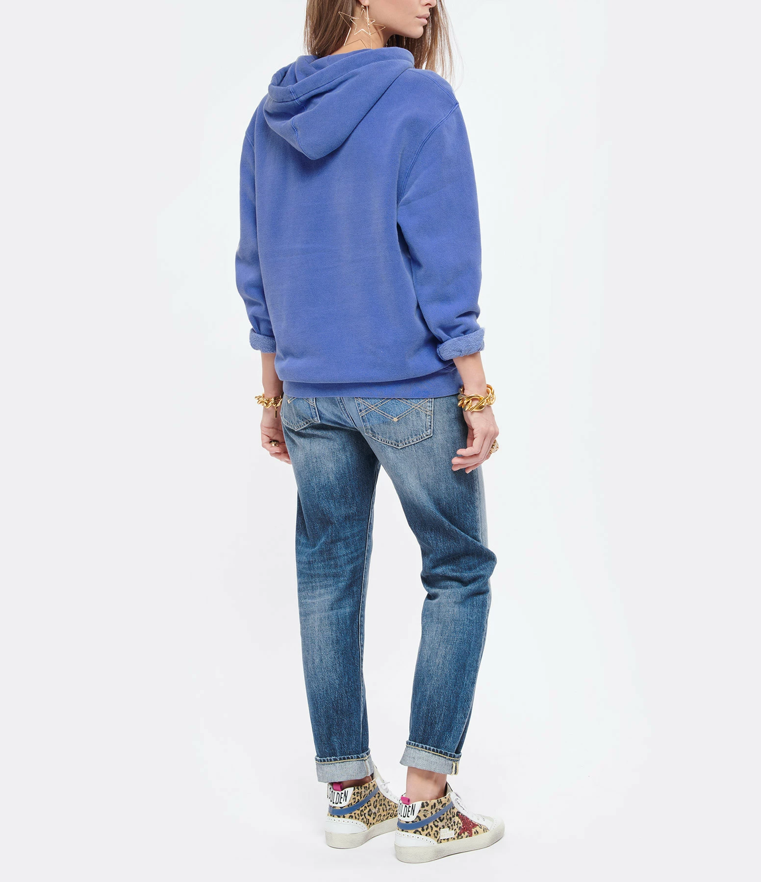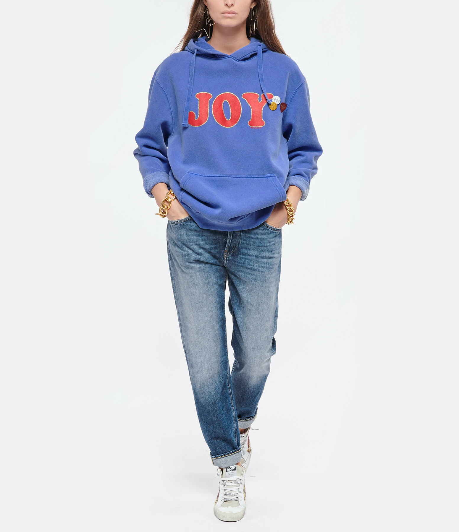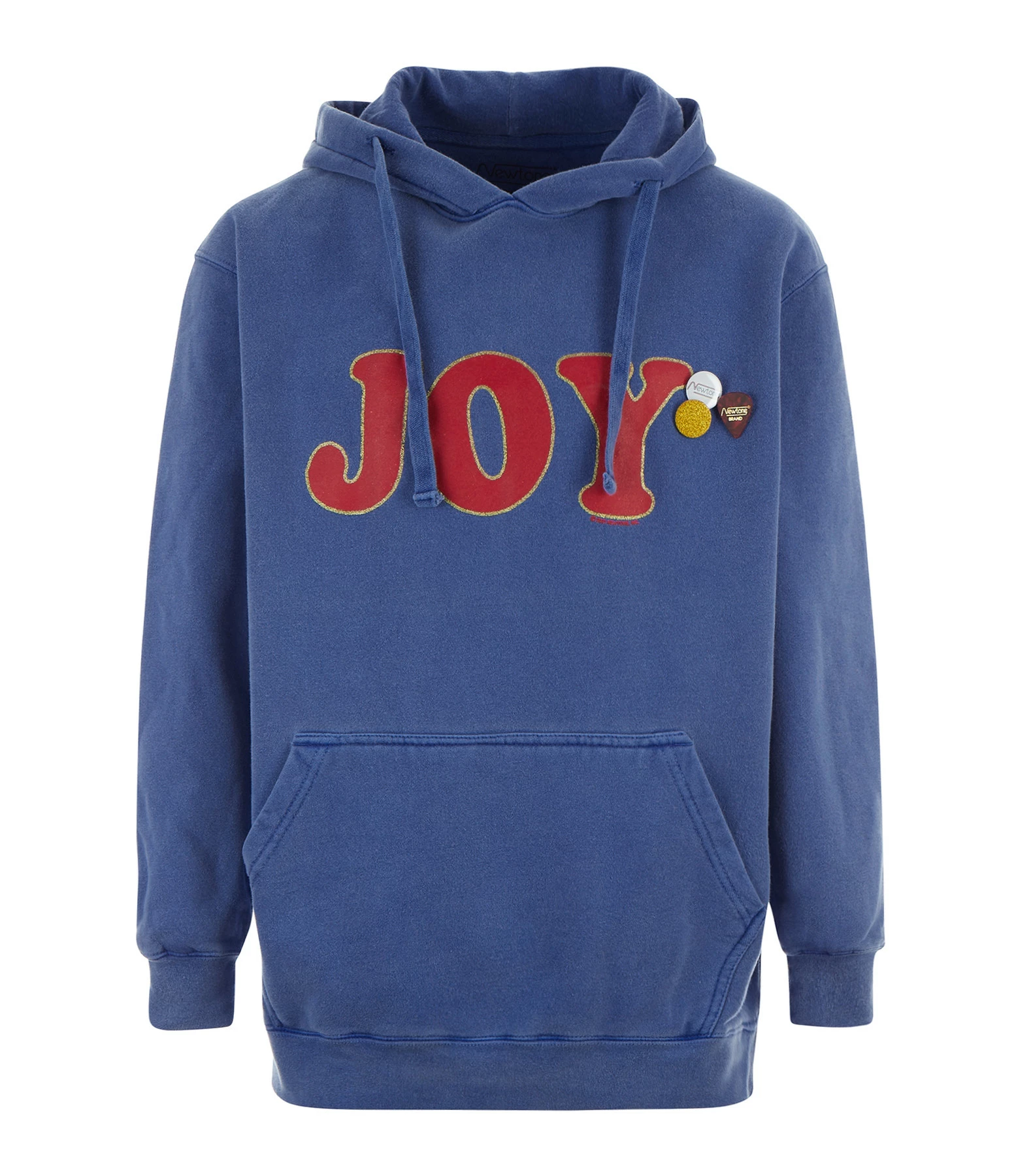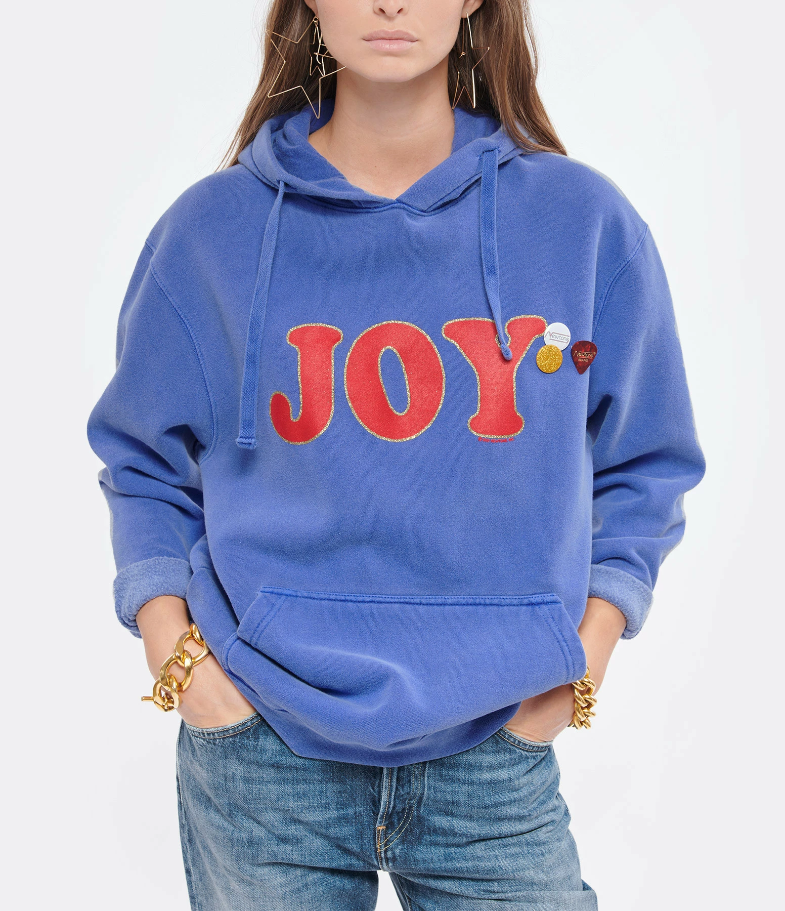 Sweatshirt à capuche en coton bleu délavé avec inscription “JOY” rouge et paillettes. Trois badges côté cœur. Poche kangourou. Manches longues. Base droite.