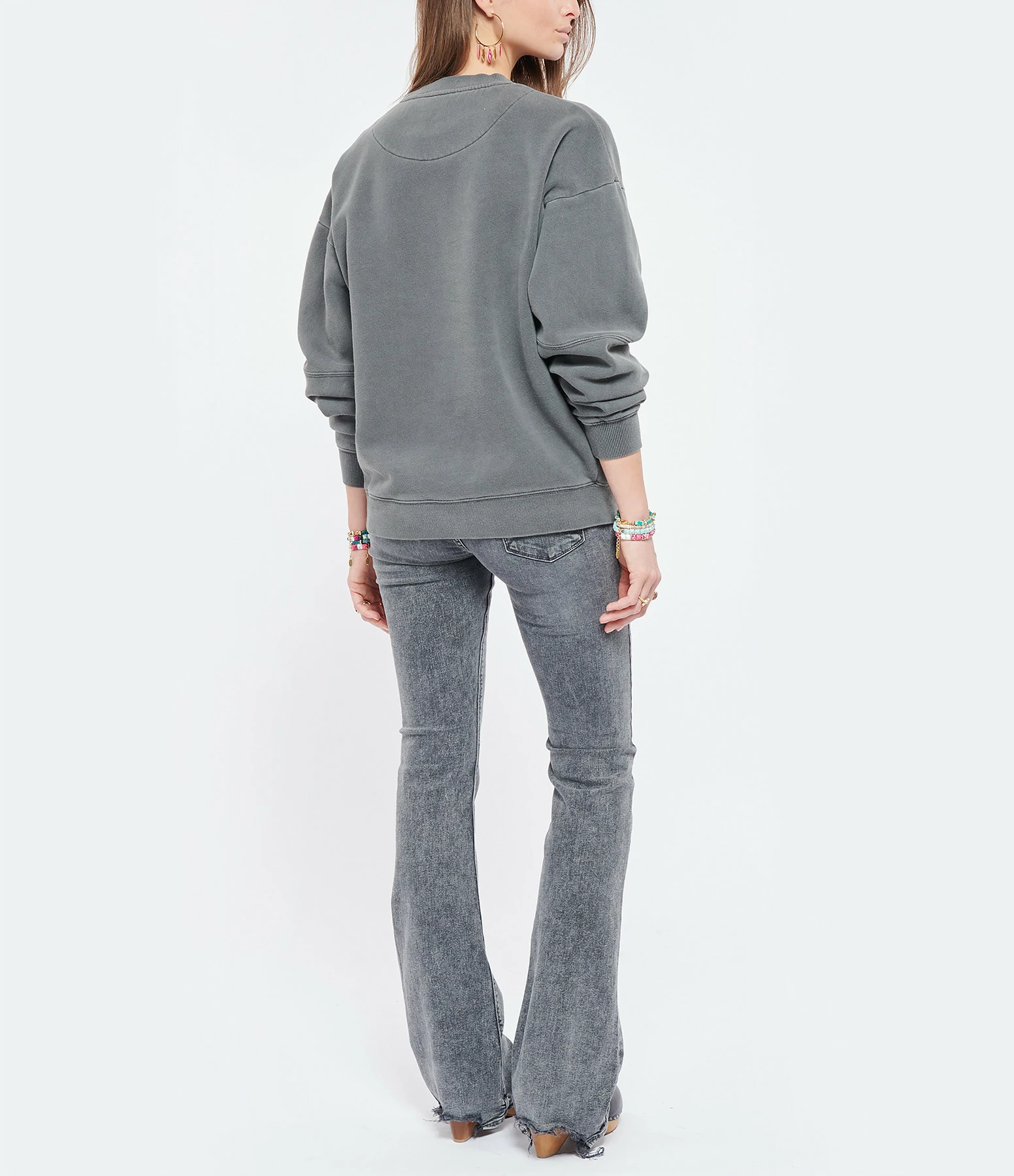 Sweatshirt oversize en coton gris sérigraphie “1970” doré. Trois badges décoratifs côté cœur. Col rond. Manches longues. Fini délavé aspect vintage. Base droite et coupe très ample. Non doublé.
