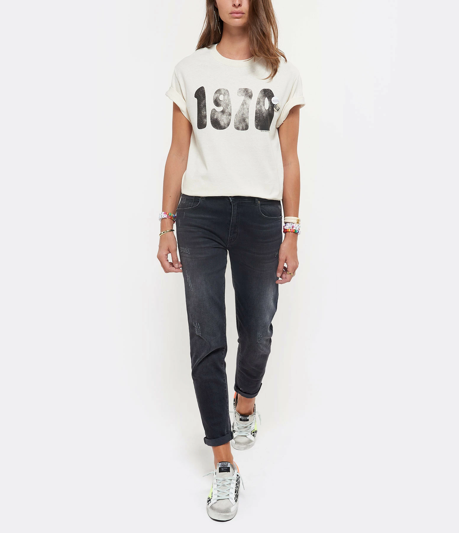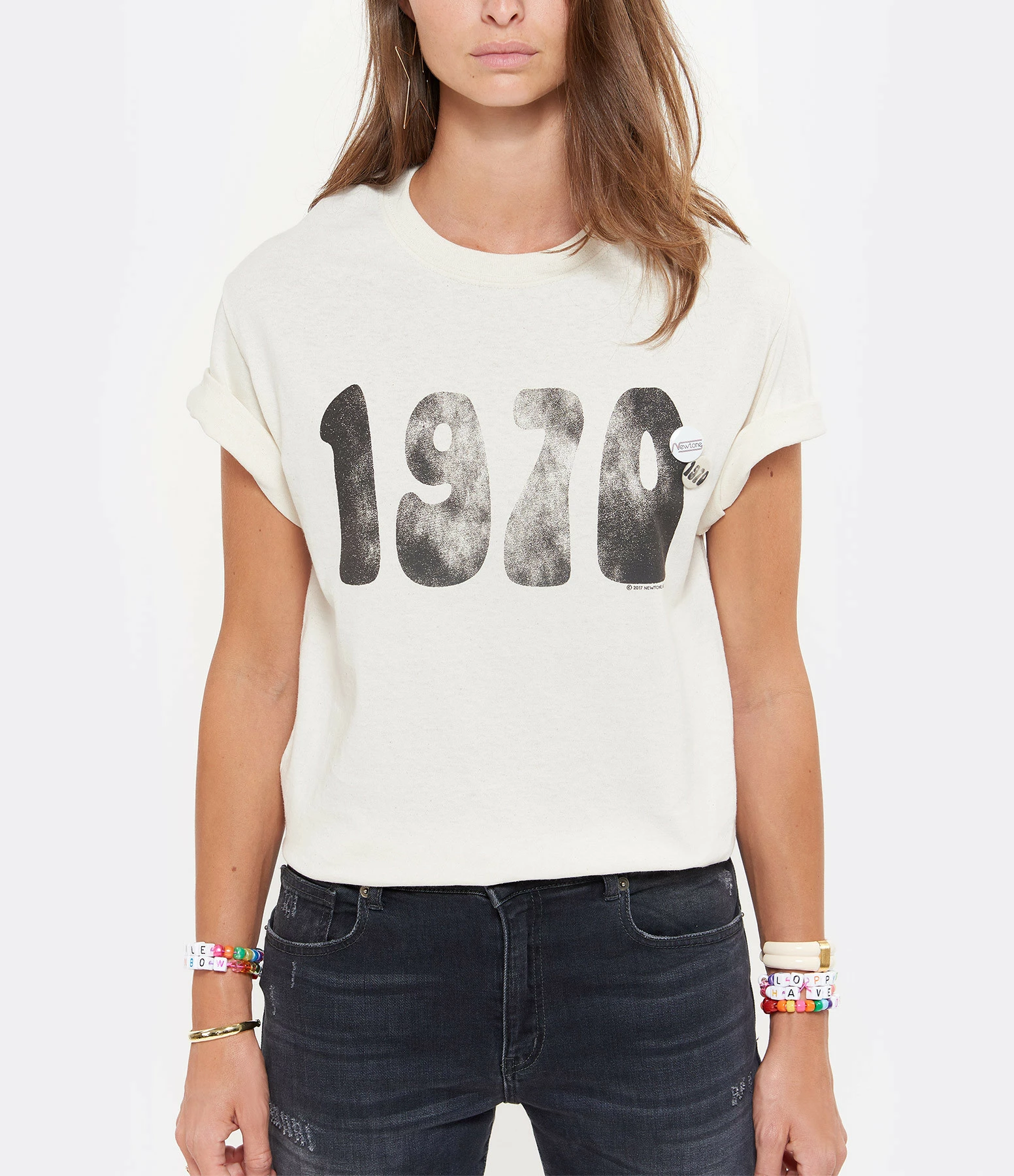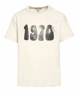 Tee-shirt en coton beige. Inscription “1970” en noir à l’avant. Col rond. Deux badges côté cœur. Manches courtes. Coupe droite.