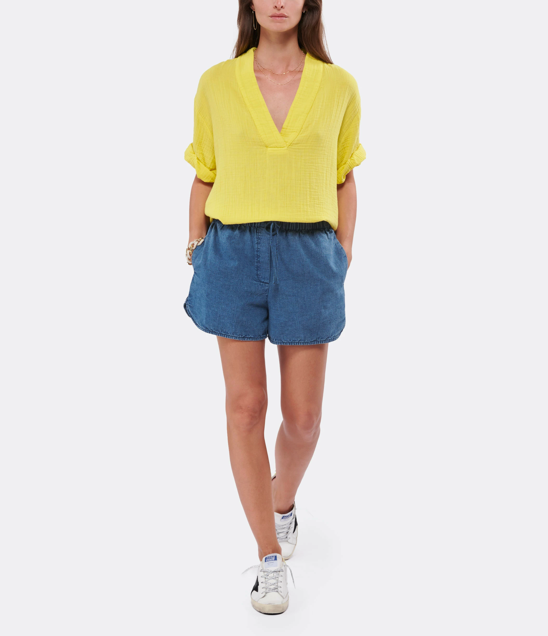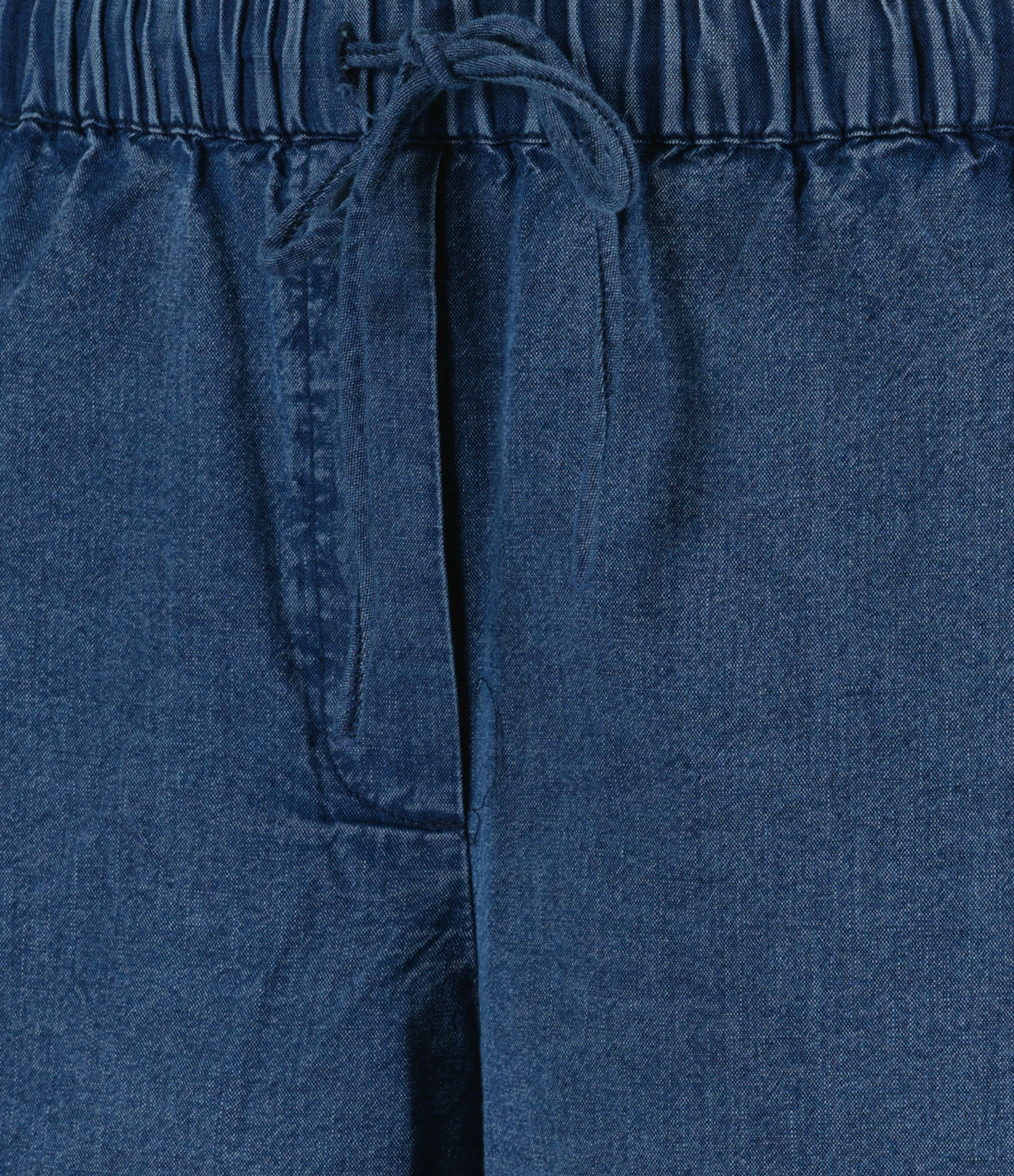 Petit short en denim souple, élastiqué à la taille avec lien de serrage. Bas de jambe arrondi. Deux poches fendues dans les coutures de côté.