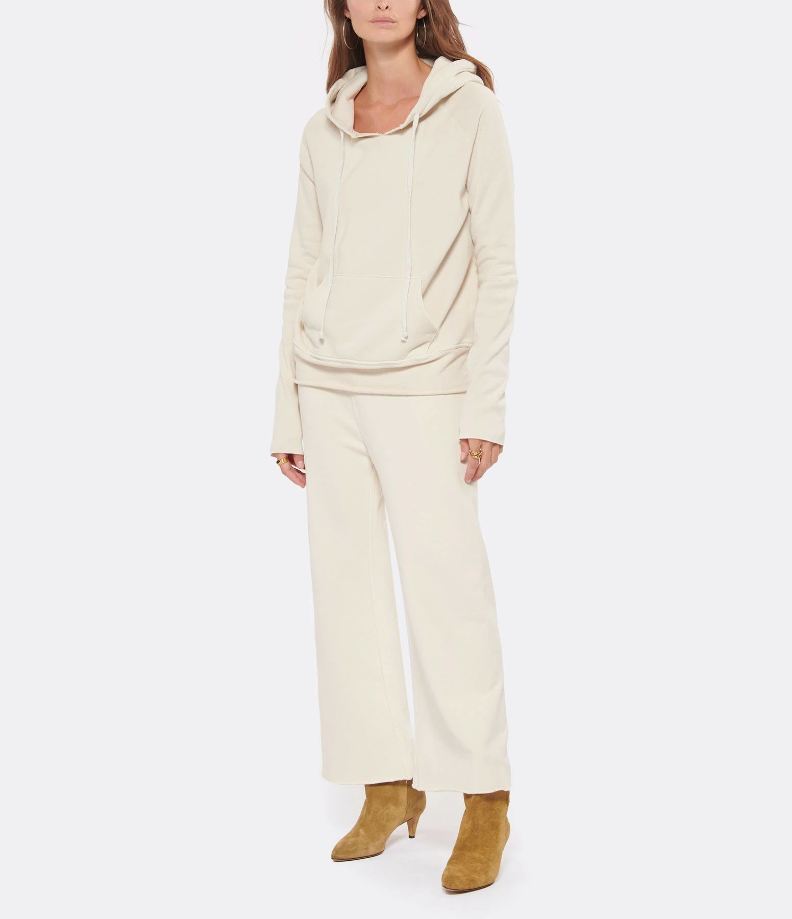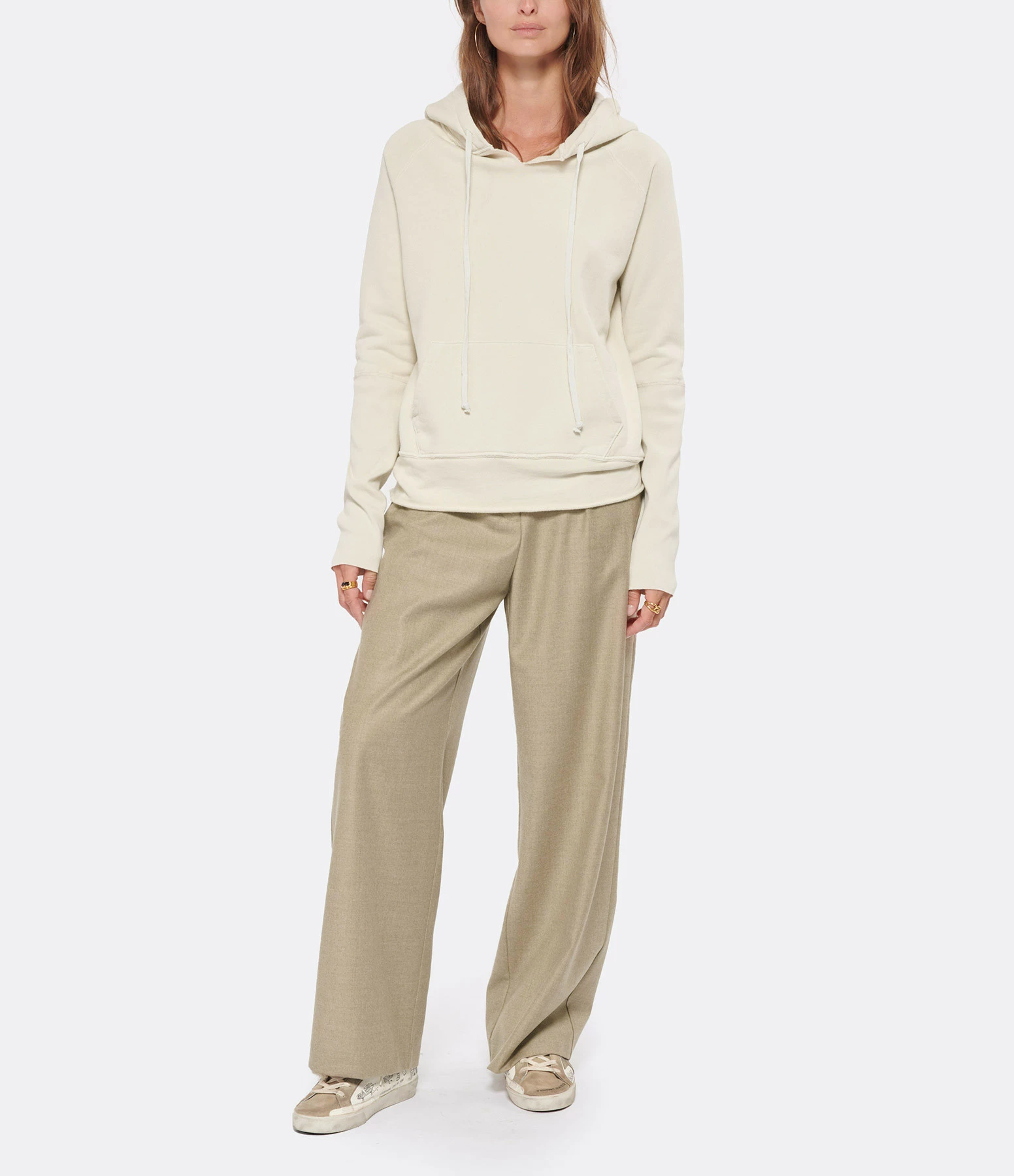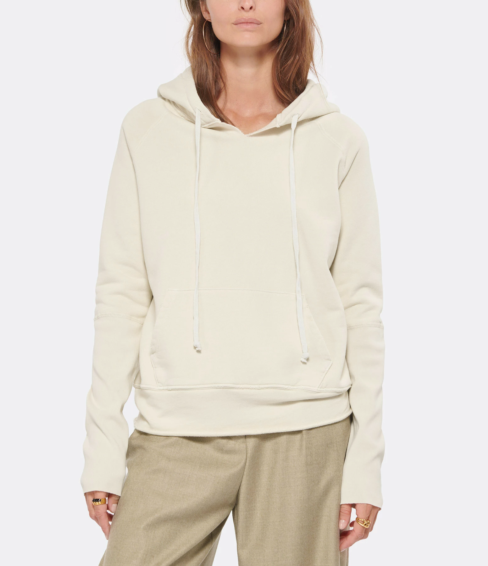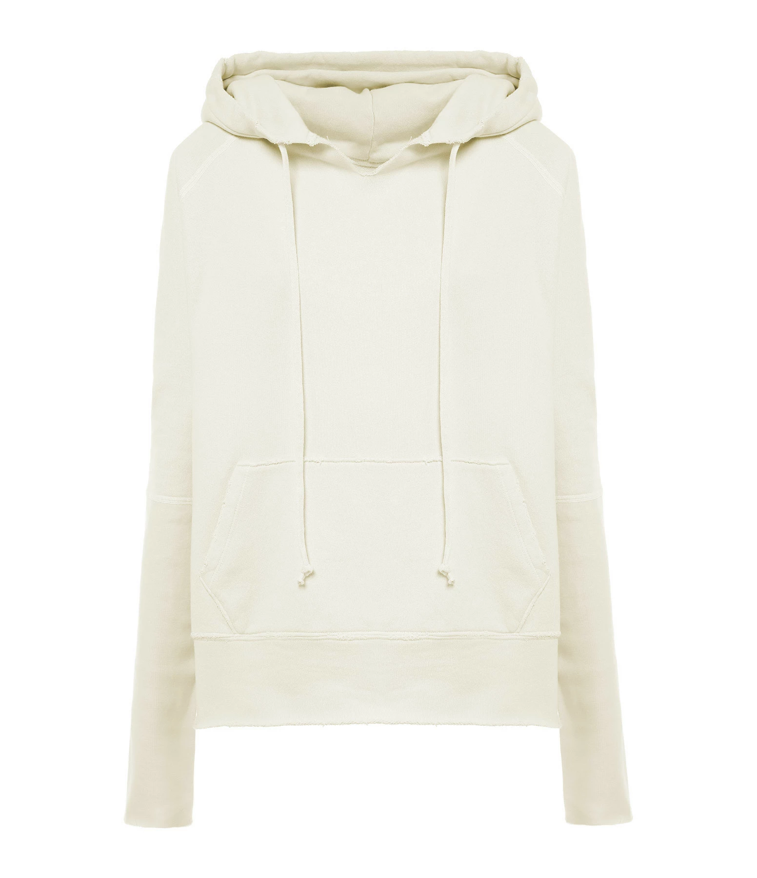 Hoodie à capuche en coton beige. Col légèrement fendu et capuche ajustable par lien de serrage. Manches longues. Une poche kangourou sur le devant. Coupe décontractée. Effets usés par endroits. Base droite roulottée. Non doublé.