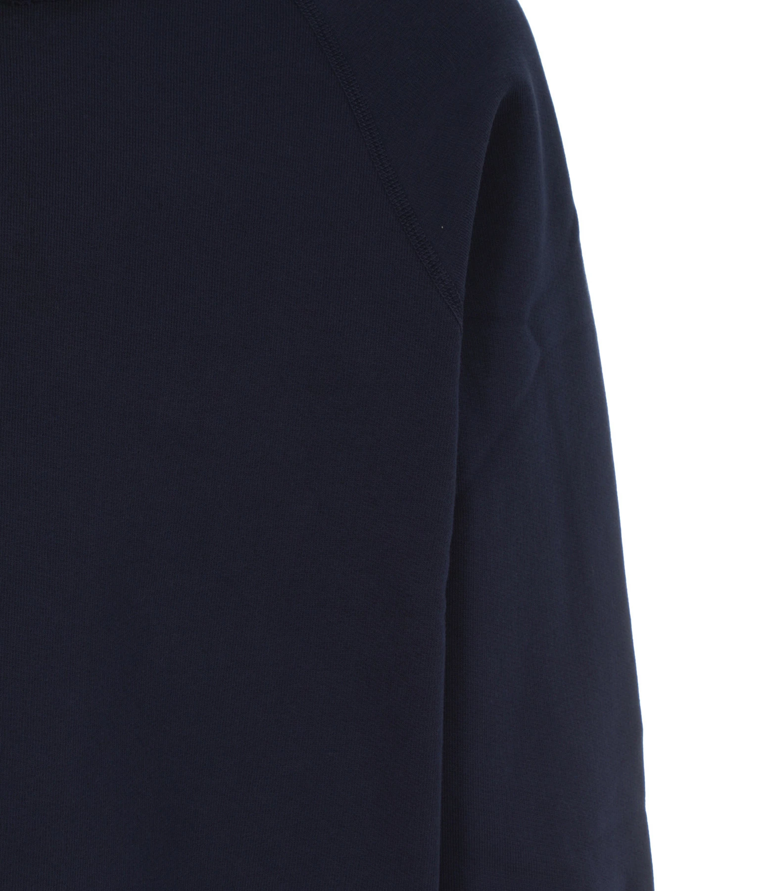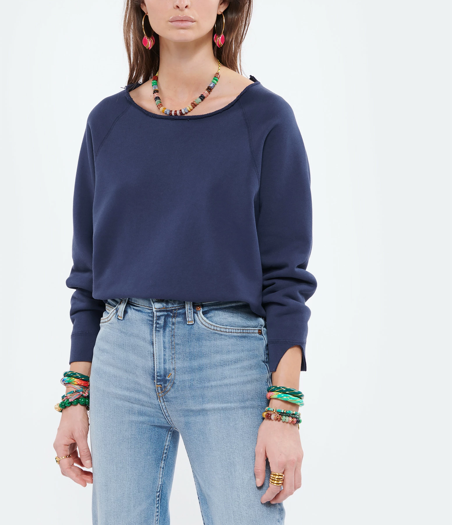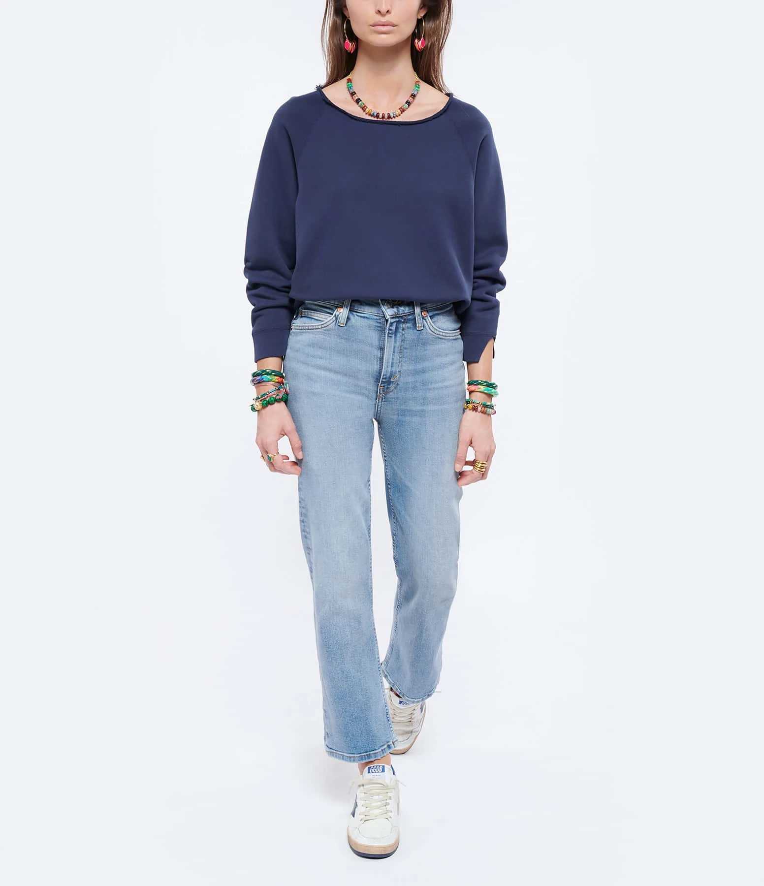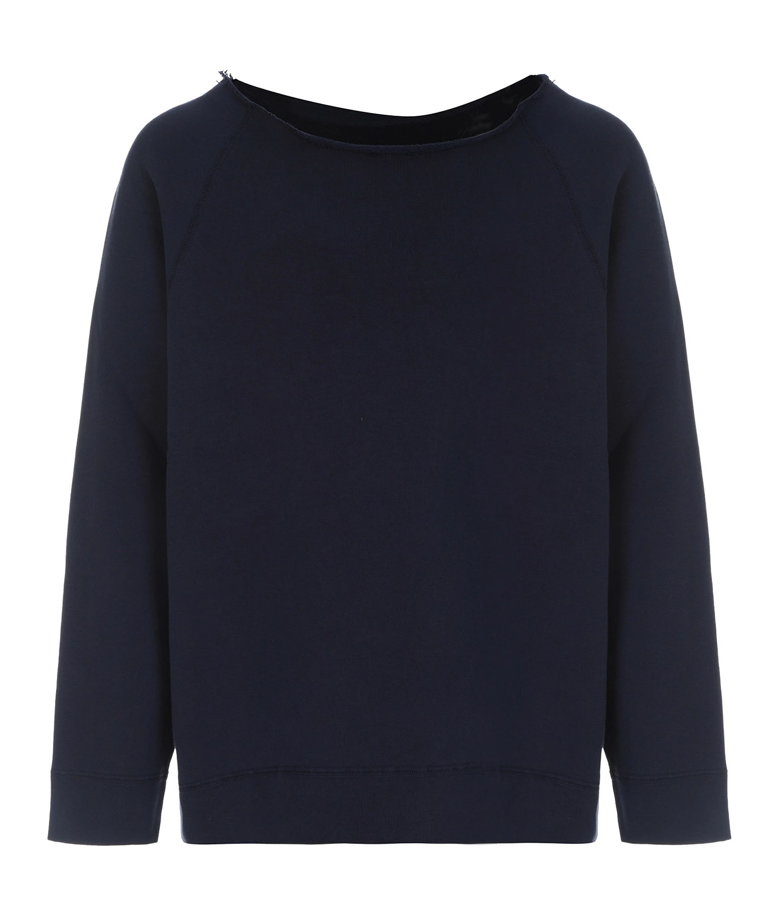 Sweatshirt en coton bleu marine. Coupe décontractée. Col rond coupé à cru. Manches longues avec poignets fendus. Effets volontairement usés par endroits. Base droite.