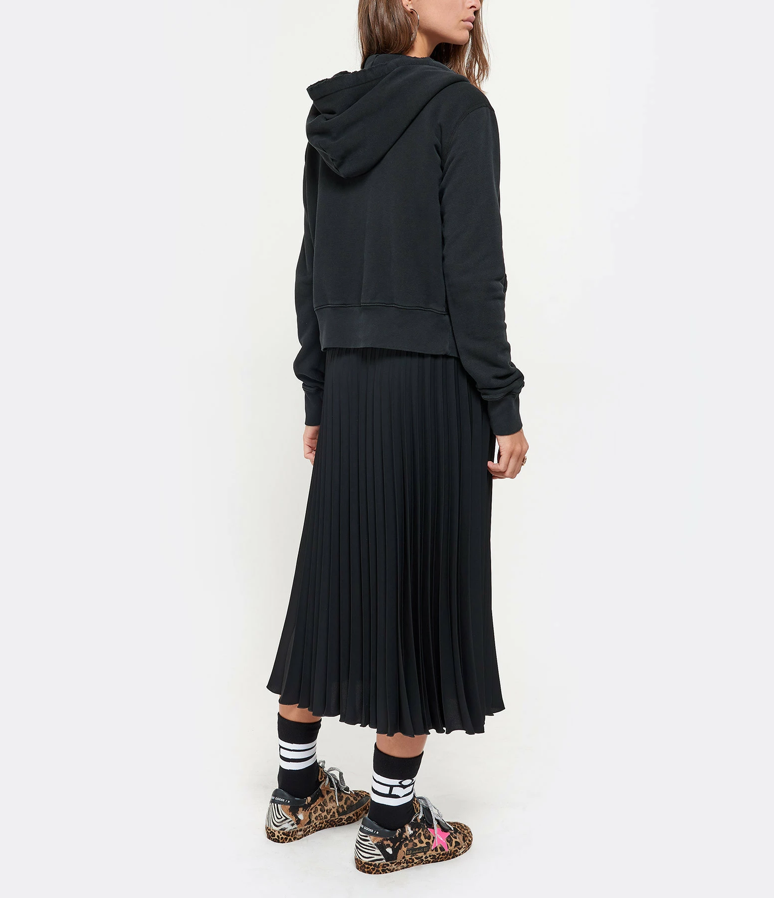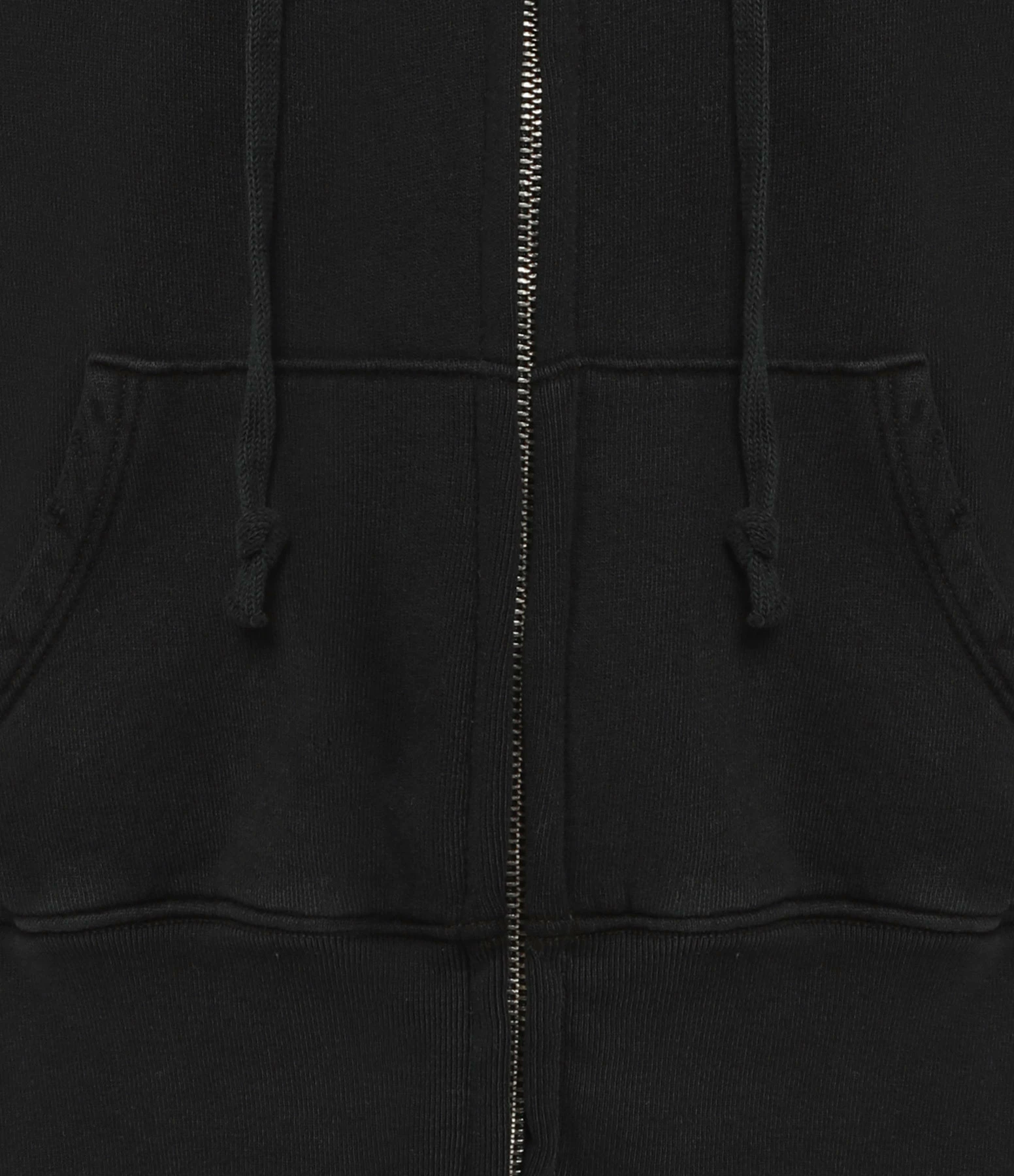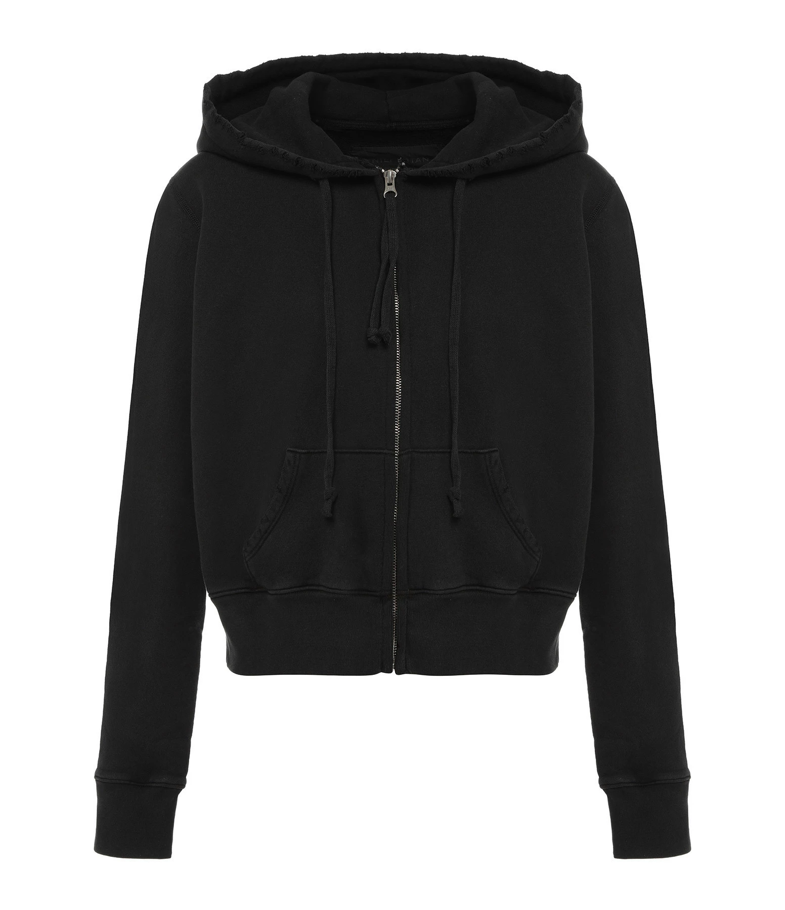 Hoodie à capuche en coton noir pour femme. Coupe décontractée courte. Fermeture par zip et capuche ajustable par liens de serrage. Manches longues. Une poche kangourou. Effets usés par endroits. Base droite et élastiquée. Non doublé.