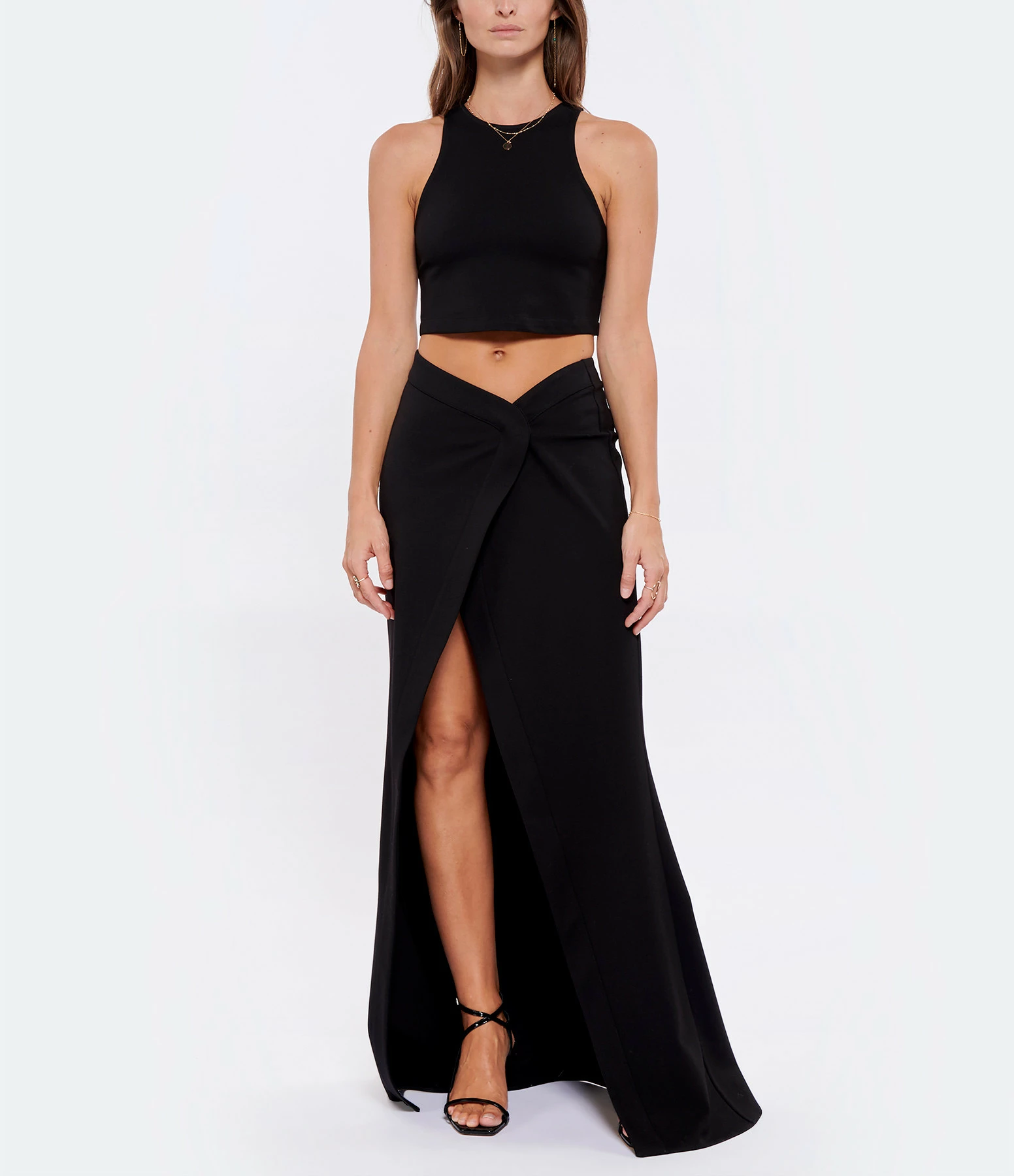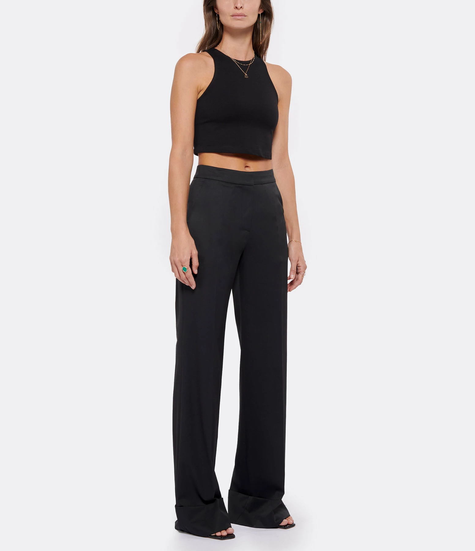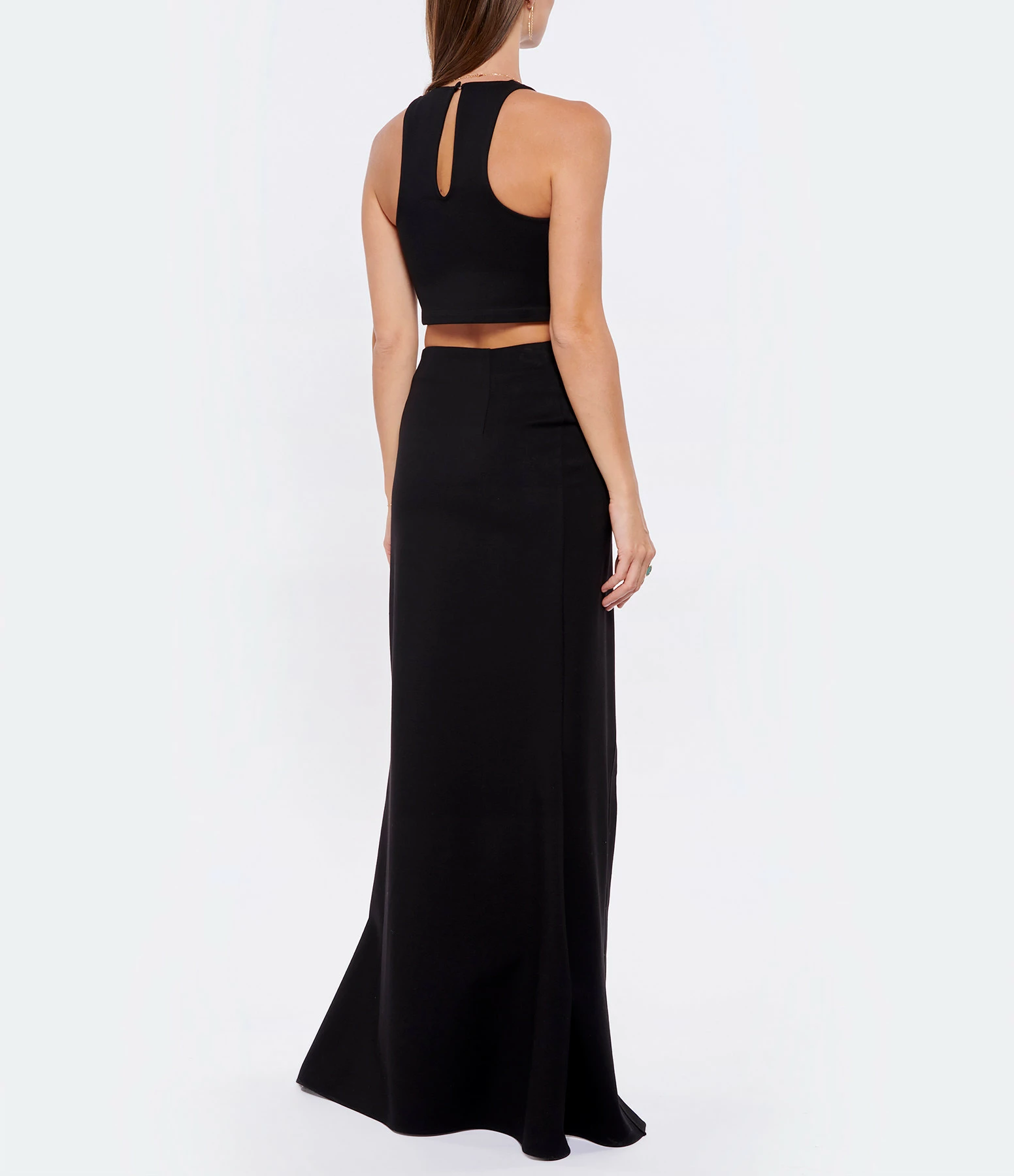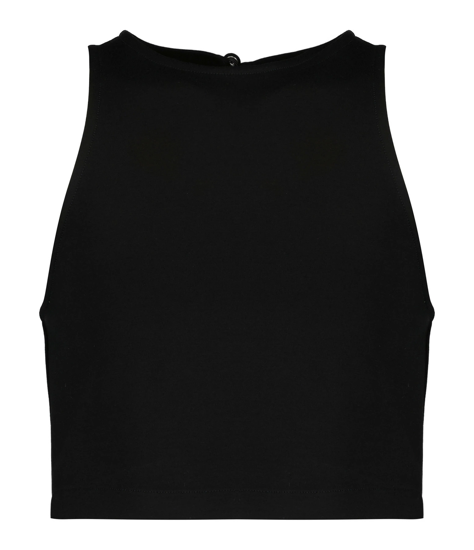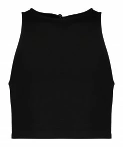 Crop top noir. Col rond. Décolleté dos en goutte d’eau. Sans manches. Coupe droite près du corps. Base droite. Non doublé.