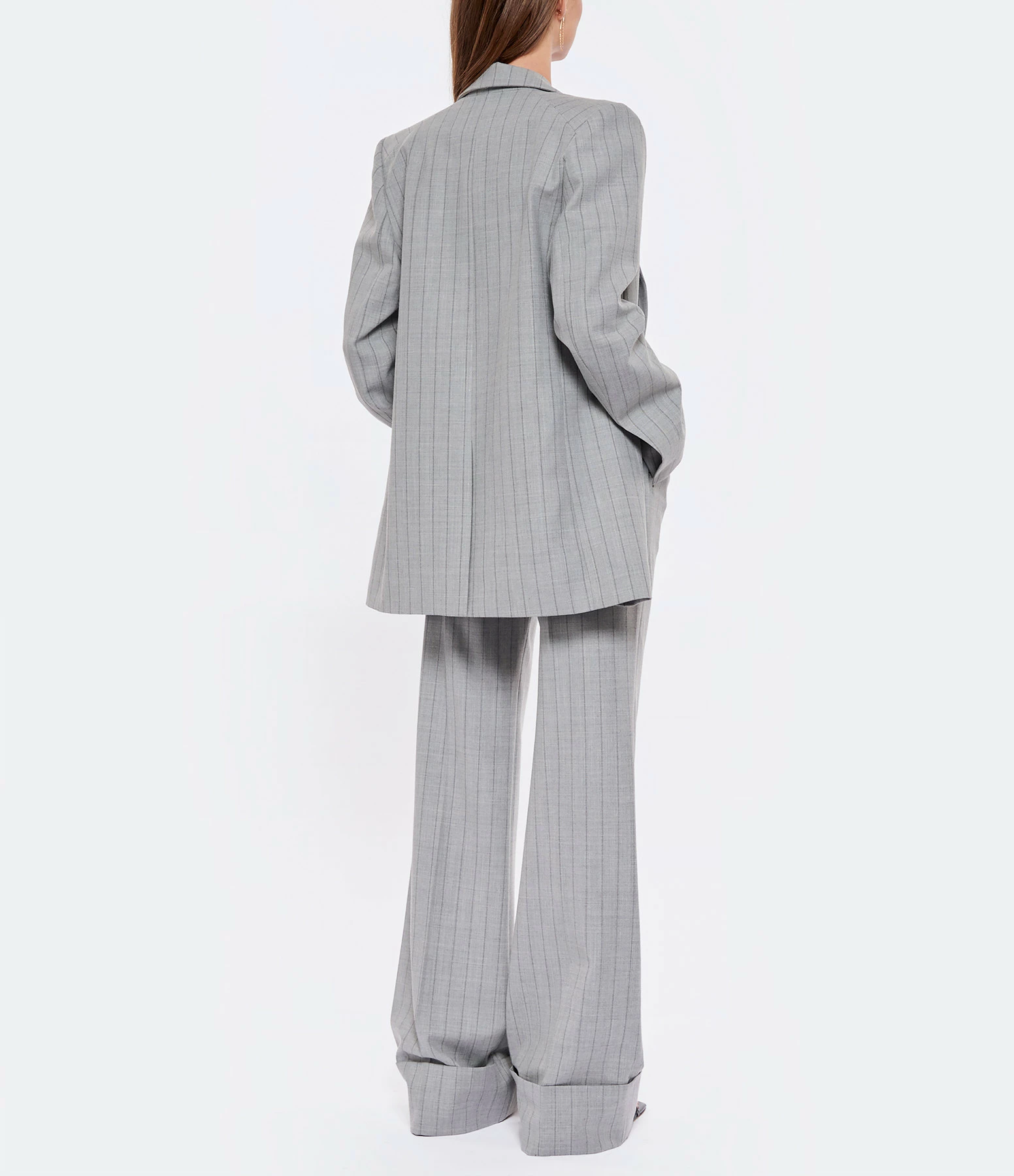 Veste blazer en laine mélangée grise à rayures. Col tailleur en pique. Fermeture boutonnée sur le devant : simple boutonnage avec un bouton bijou. Manches longues tailleur avec fentes. Epaulettes. Deux fausses poches passepoilées sur le devant. Une fente au milieu dos. Coupe droite ample. Base arrondie. Doublée.