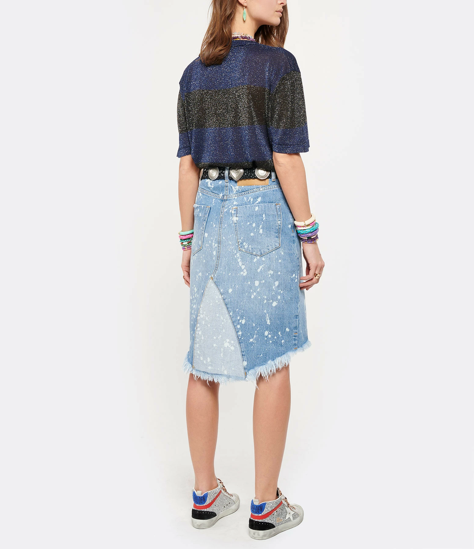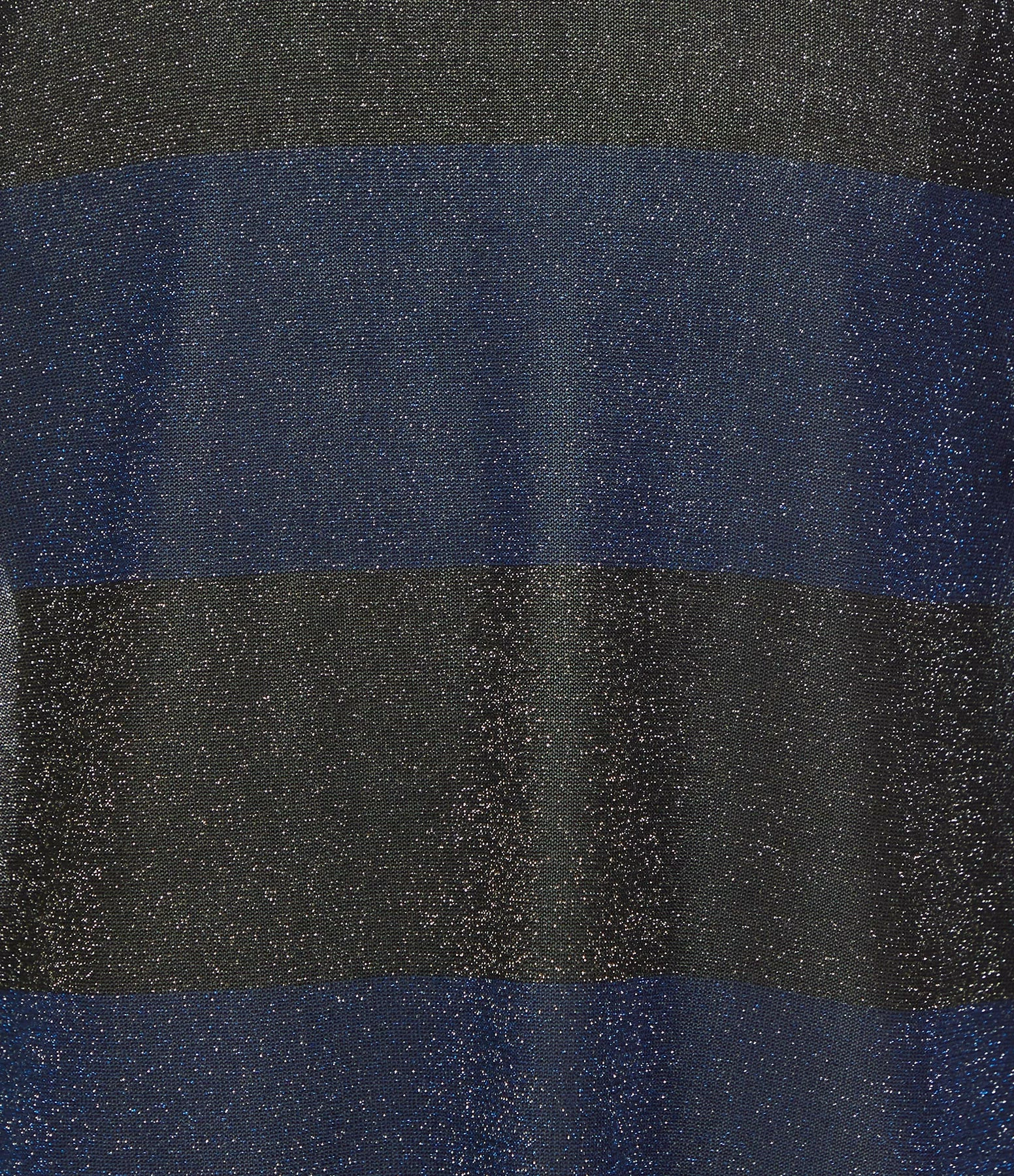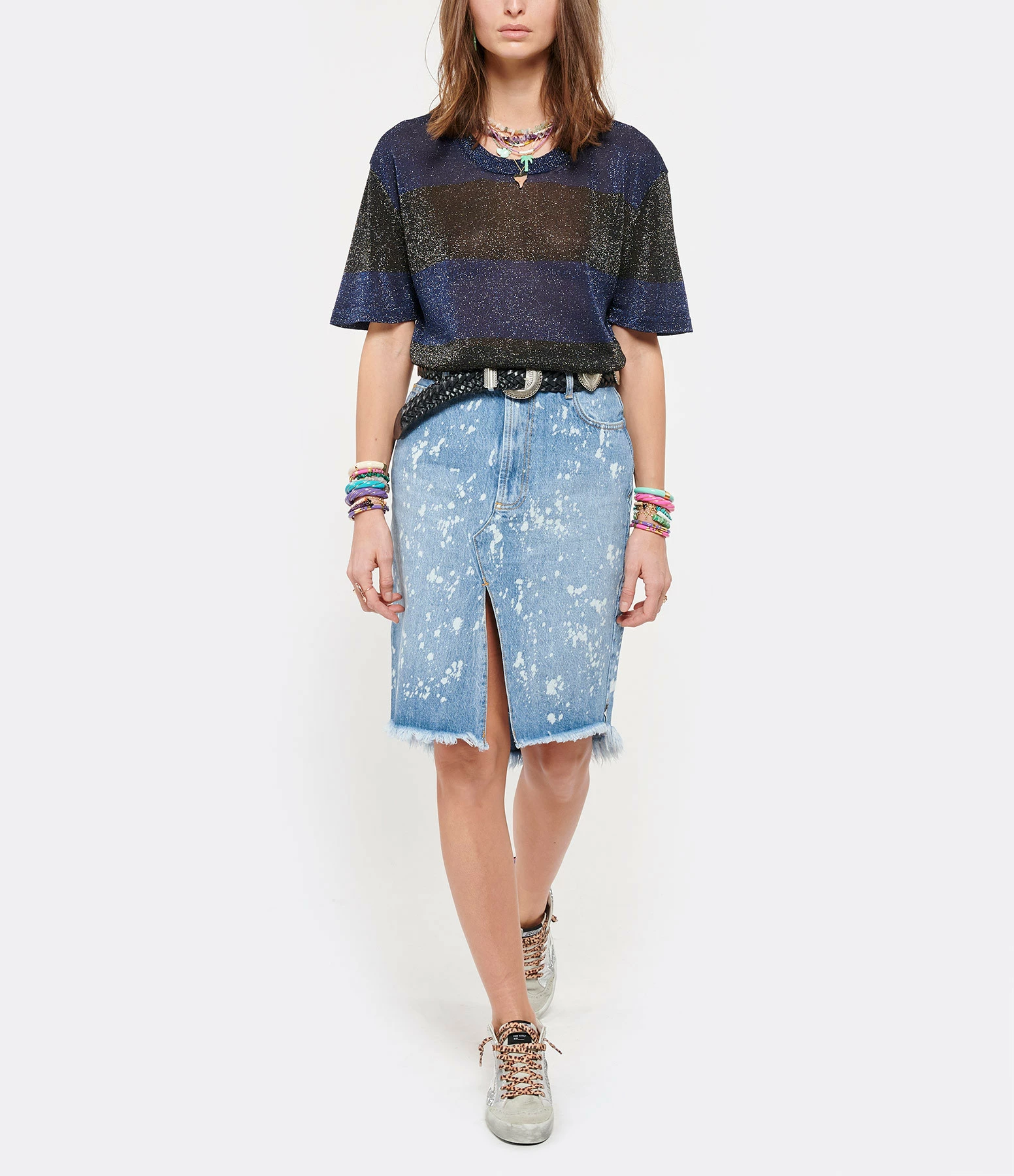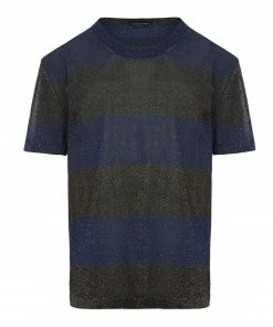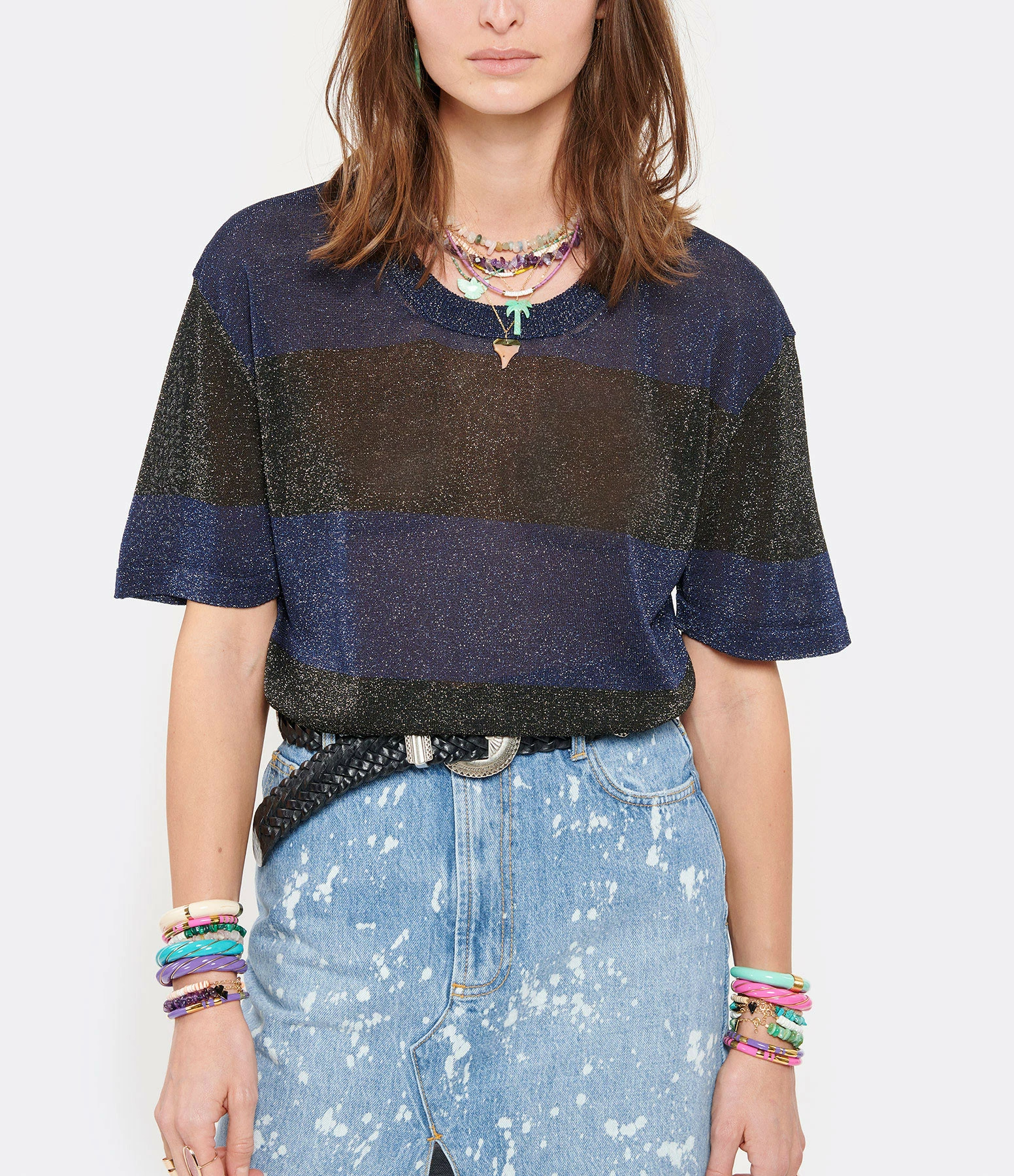 Tee-shirt pull léger bleu et noir à paillettes. Manches courtes. Col rond. Coupe droite. Base droite. Non doublé.
