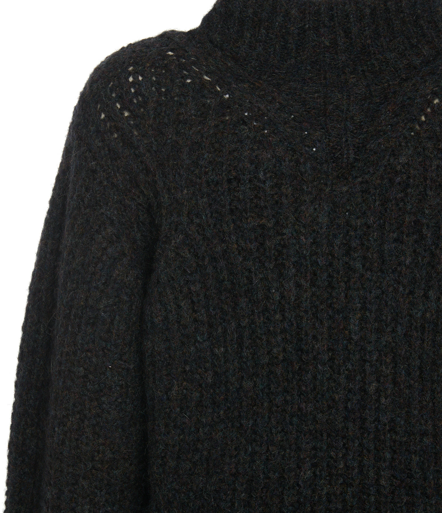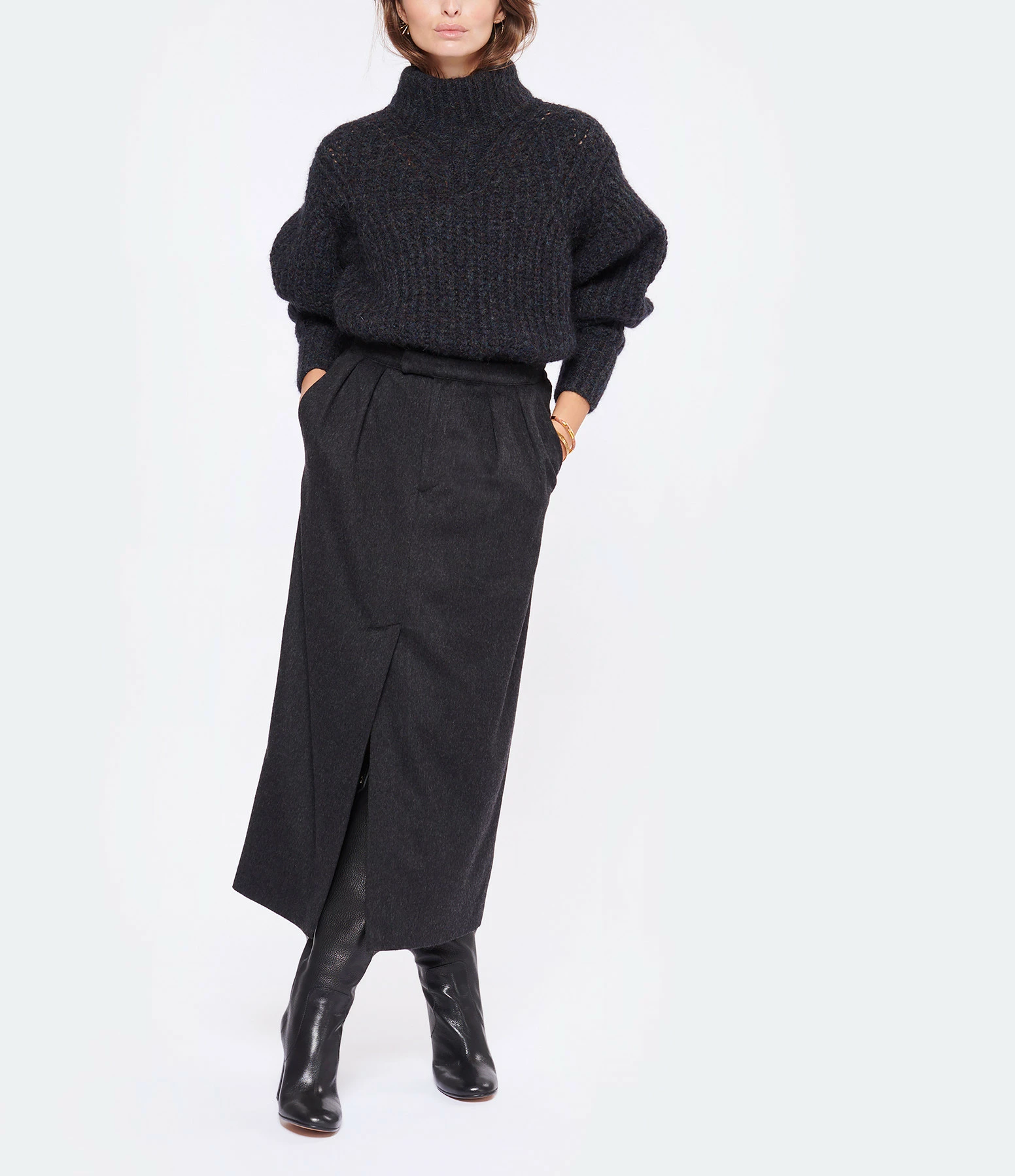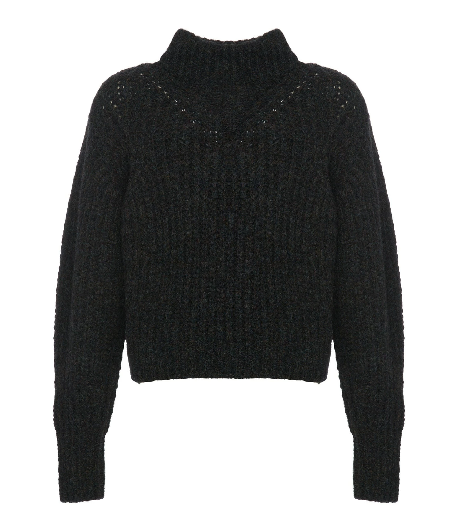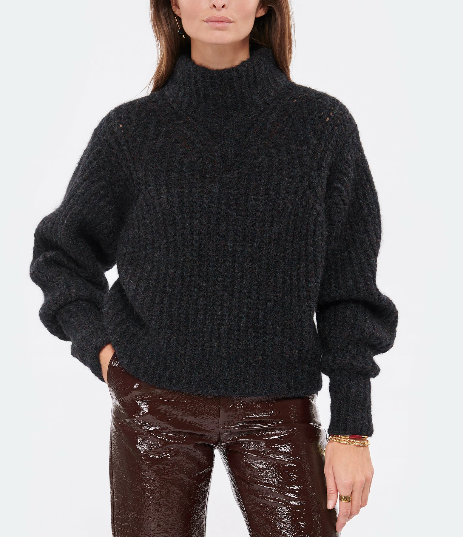 Pull en maille côtelée bleu-gris foncé chiné. Col montant. Manches longues bishop. Coupe ample. Longueur raccourcie. Base droite.