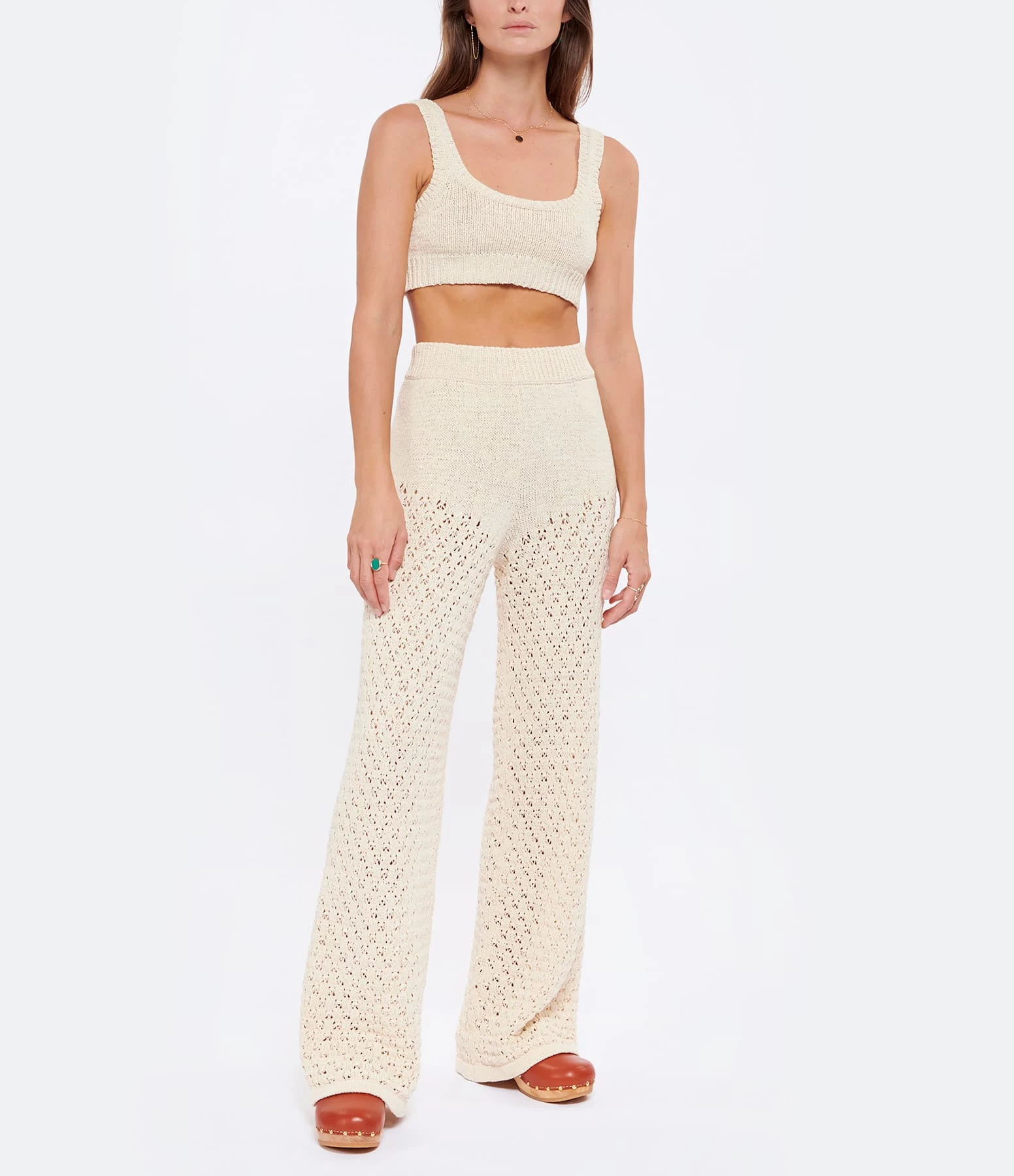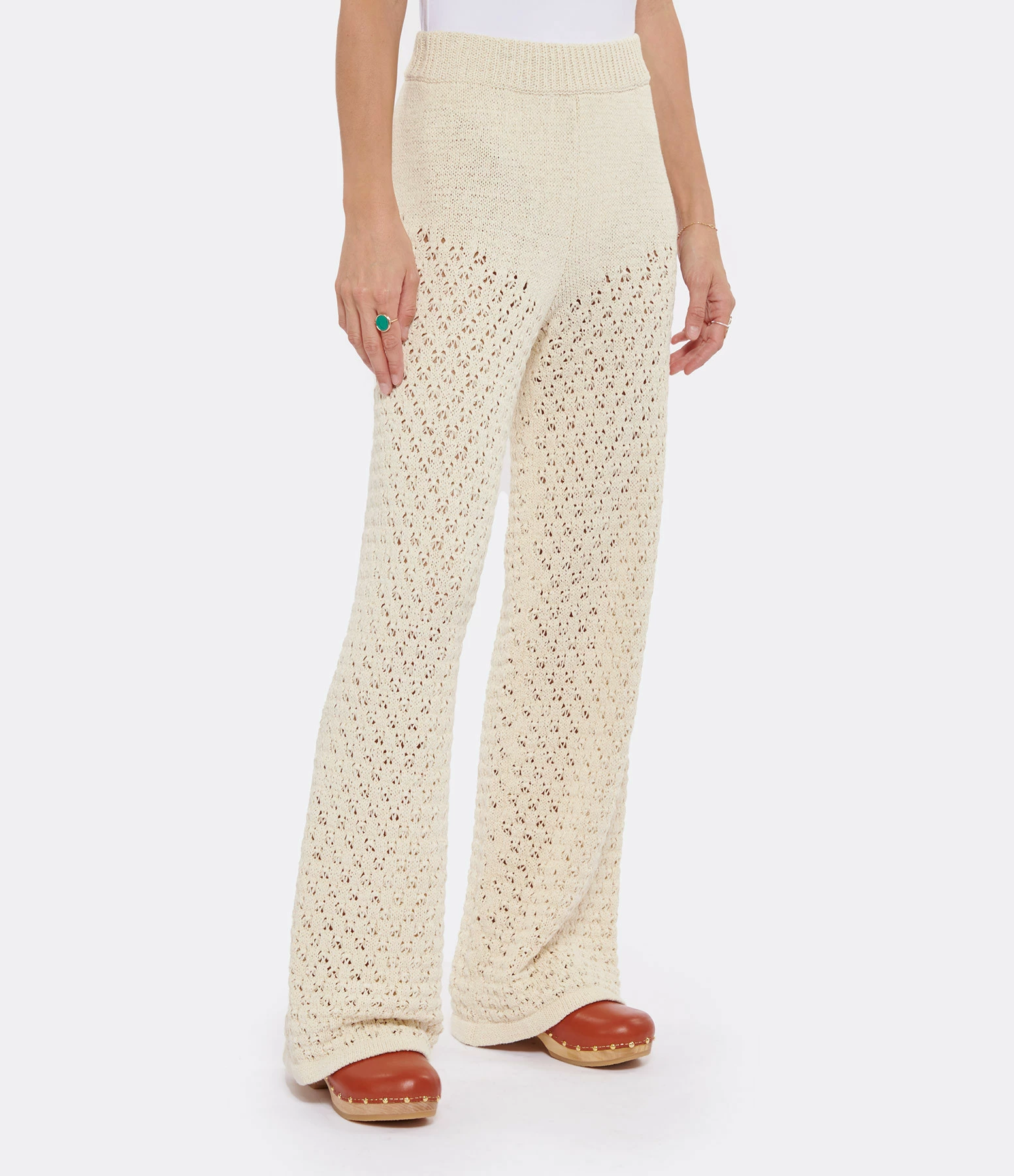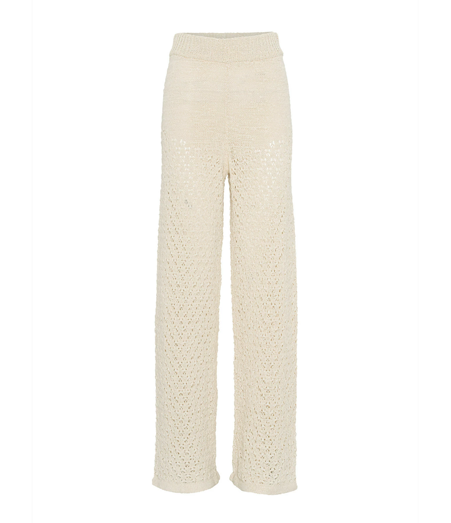 Pantalon en maille de coton mélangé beige. Taille haute élastiquée et côtelée. Partie supérieure en tricot côtelé. Partie inférieure en maille ajourée. Coupe large. Base droite côtelée.