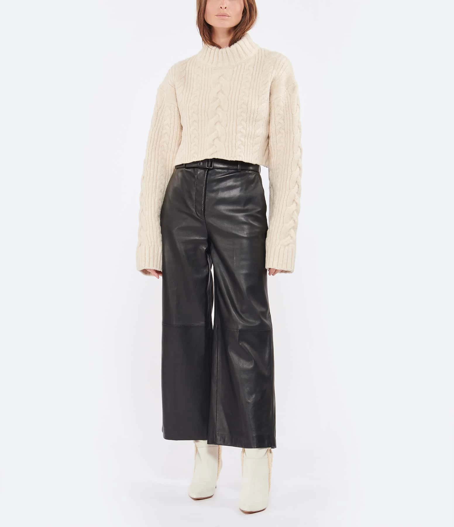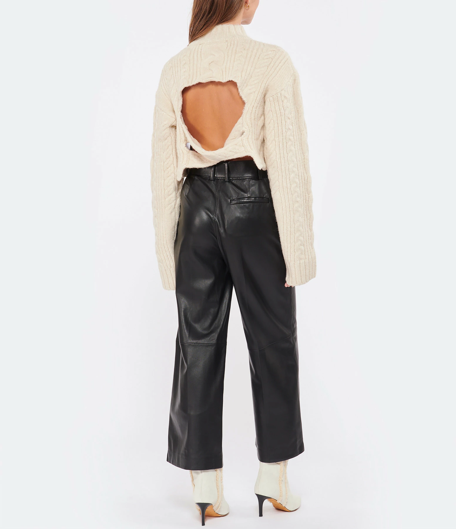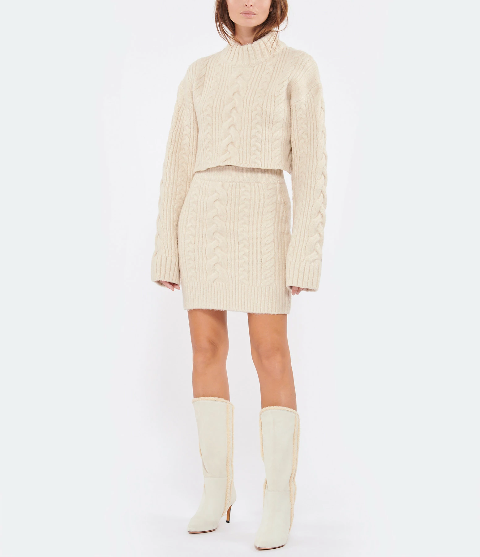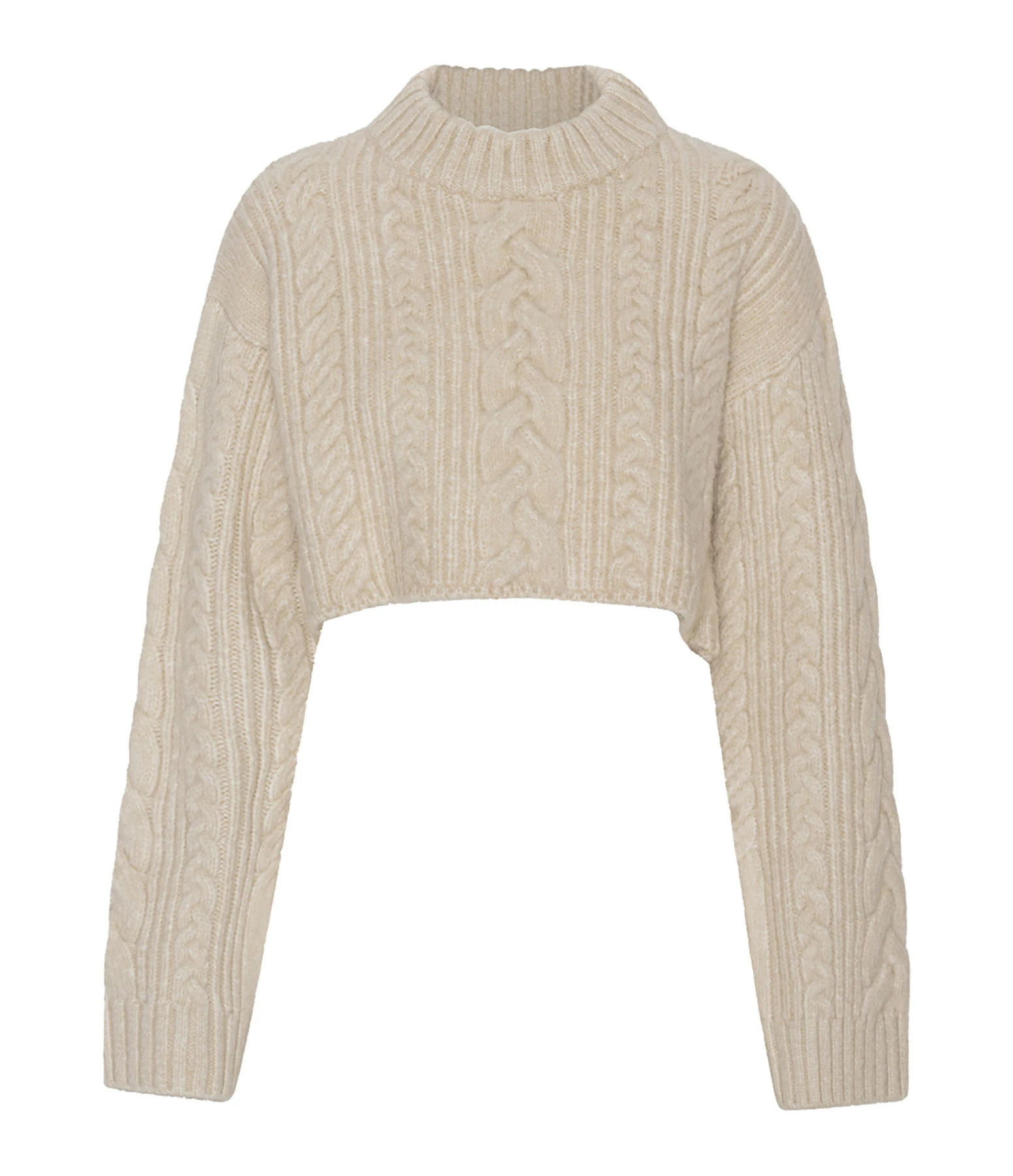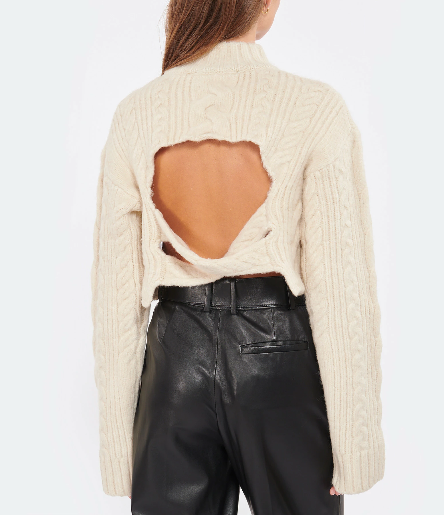 Pull crop en tricot torsadé beige. Col montant. Découpe dans le bas du dos avec jeu de croisement. Manches longues avec poignets côtelés. Coupe droite. Base droite.