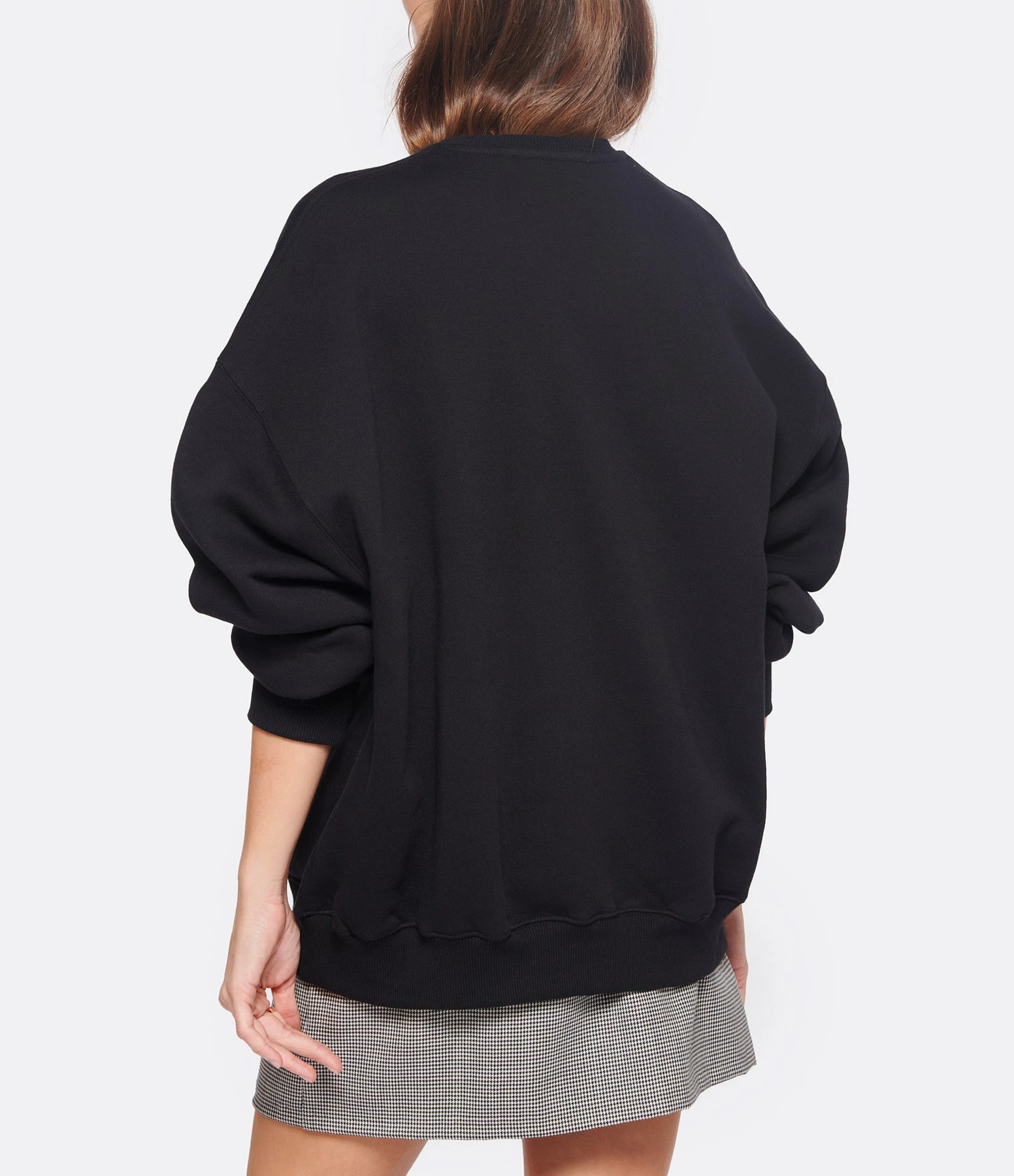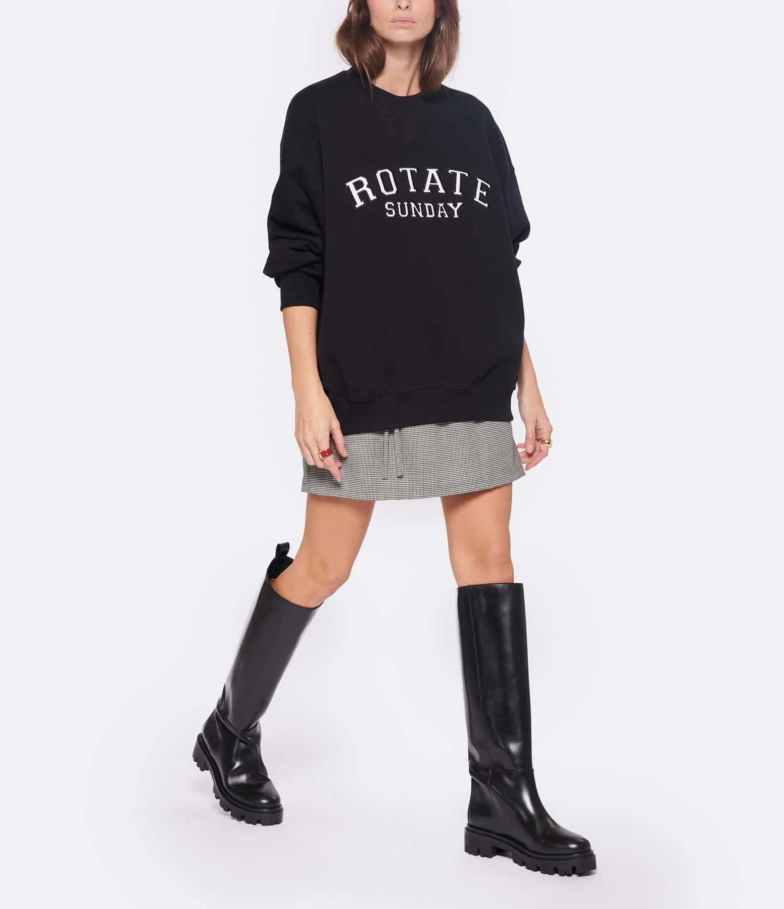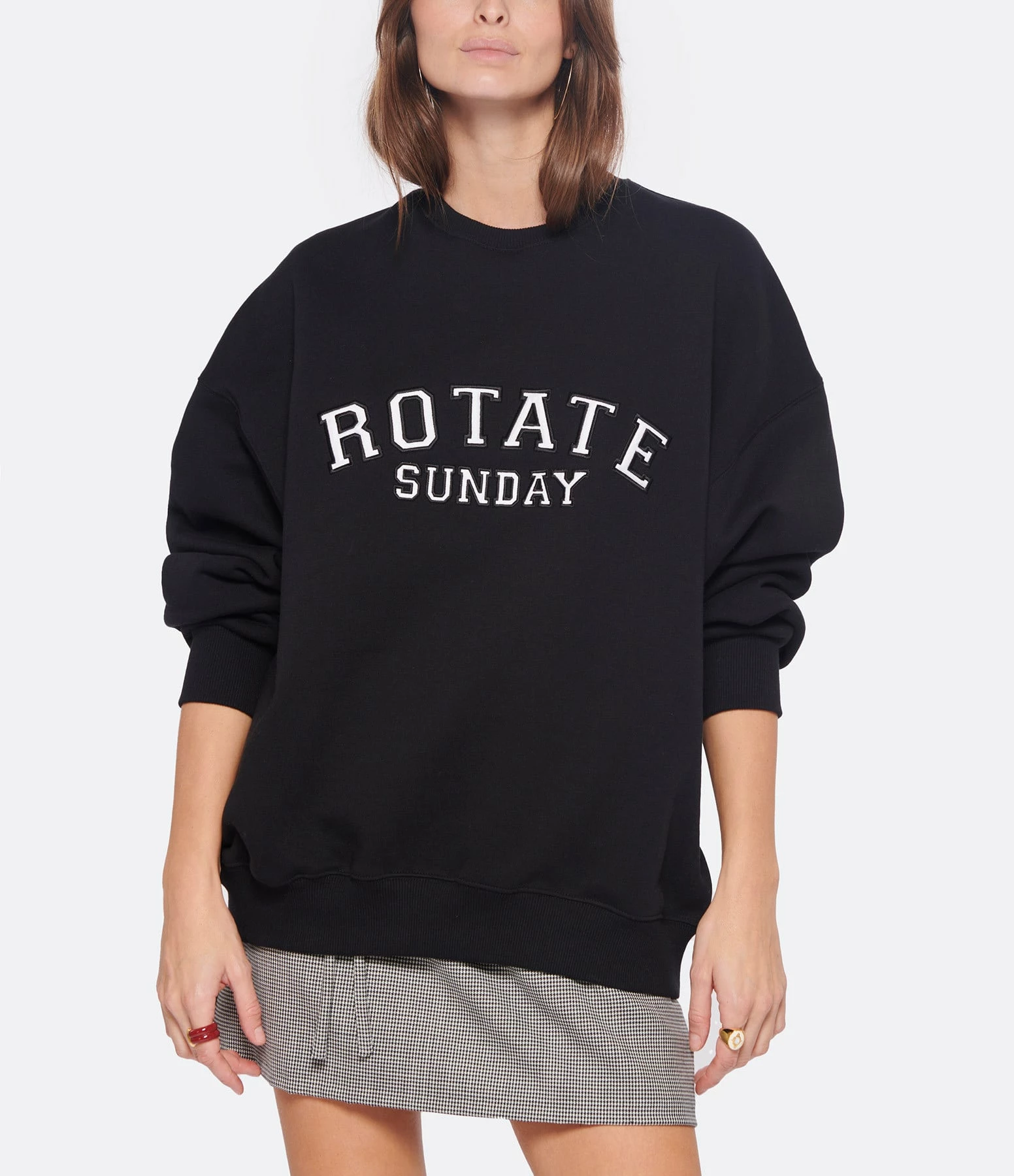Sweatshirt en coton molletonné noir avec l’inscription “Rotate Sunday” brodée en blanc sur le devant. Col rond côtelé. Manches longues avec poignets côtelés. Coupe oversized. Base droite côtelée.