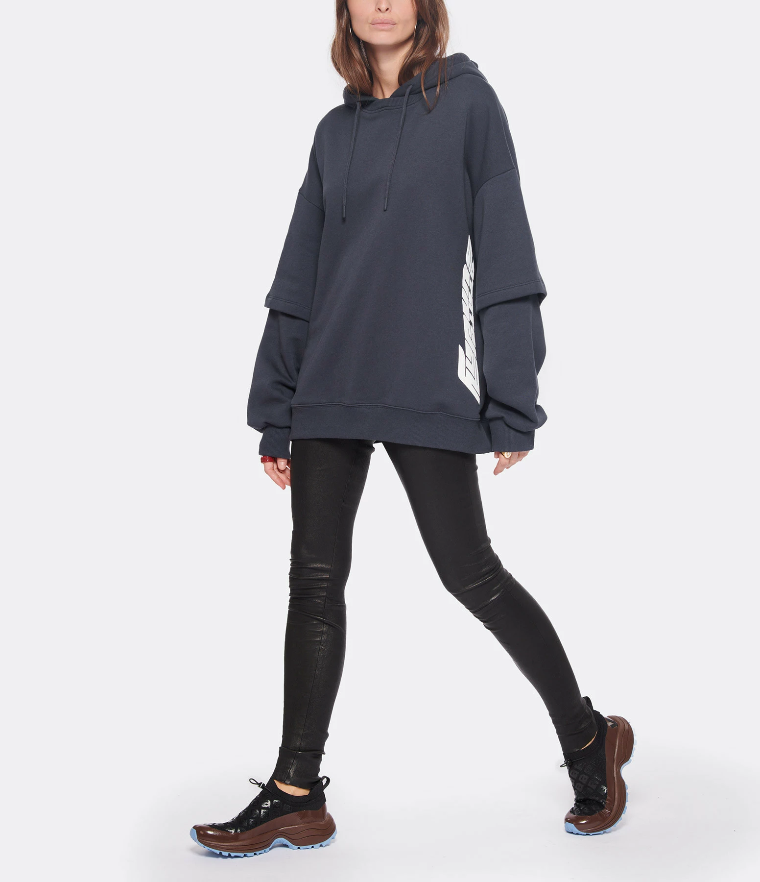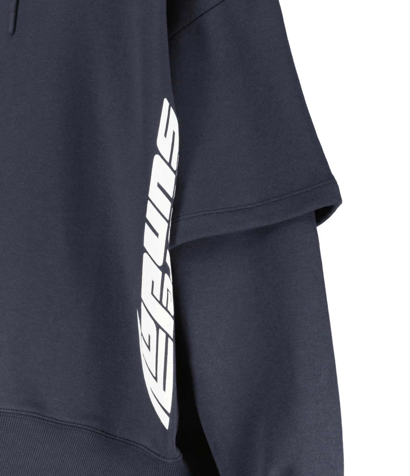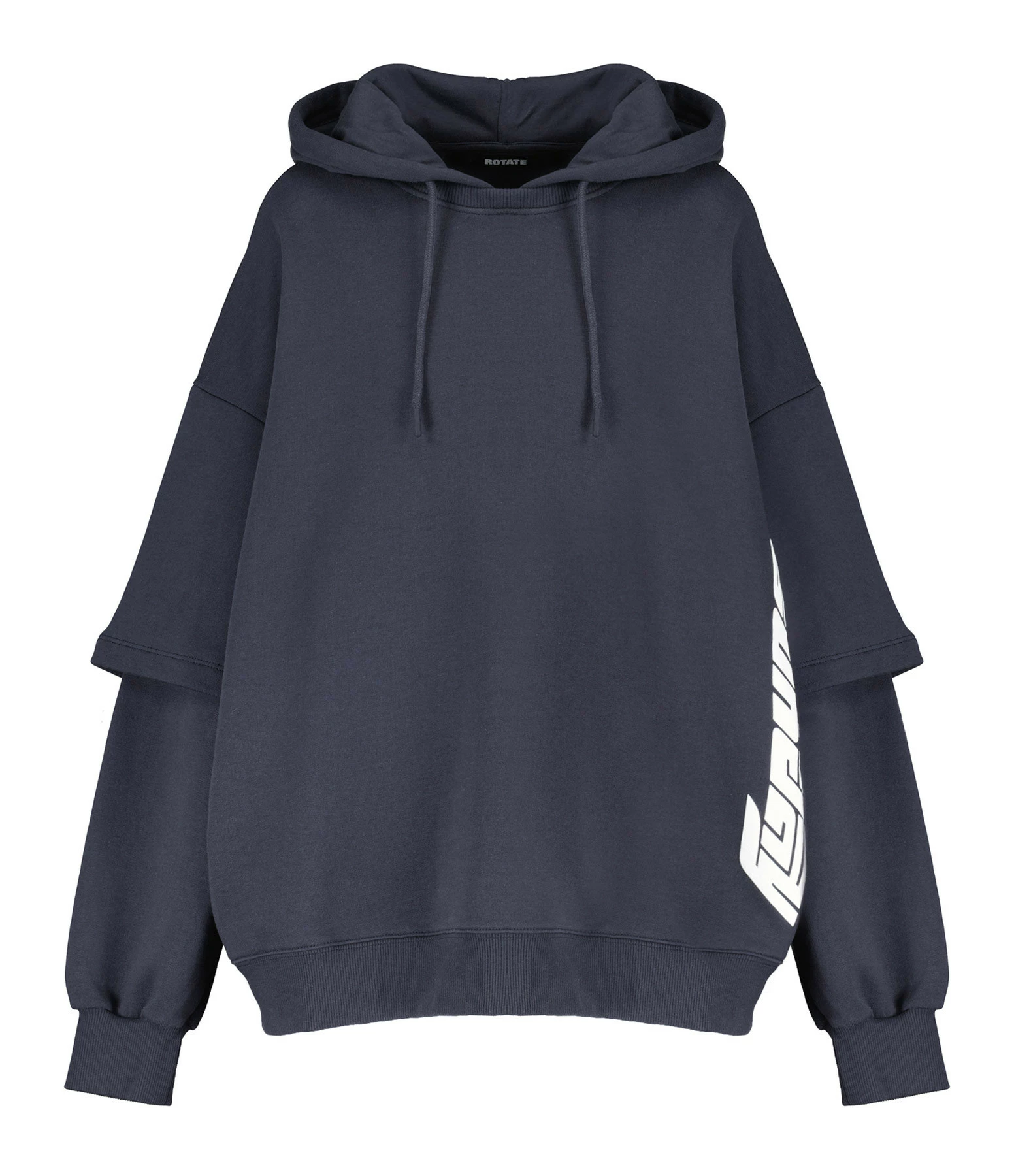 Sweatshirt en coton molletonné bleu nuit avec l’inscription “Rotate Sunday” flockée en blanc sur le devant. Col côtelé à capuche avec cordons de serrage. Manches superposées : une manches courtes sur une manche longue avec poignets côtelés. Coupe oversized. Base droite côtelée. Effet usé par endroits.