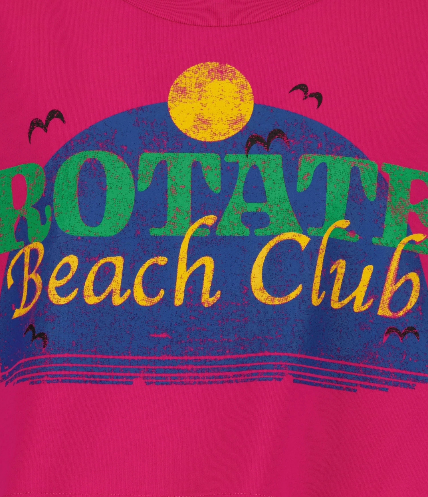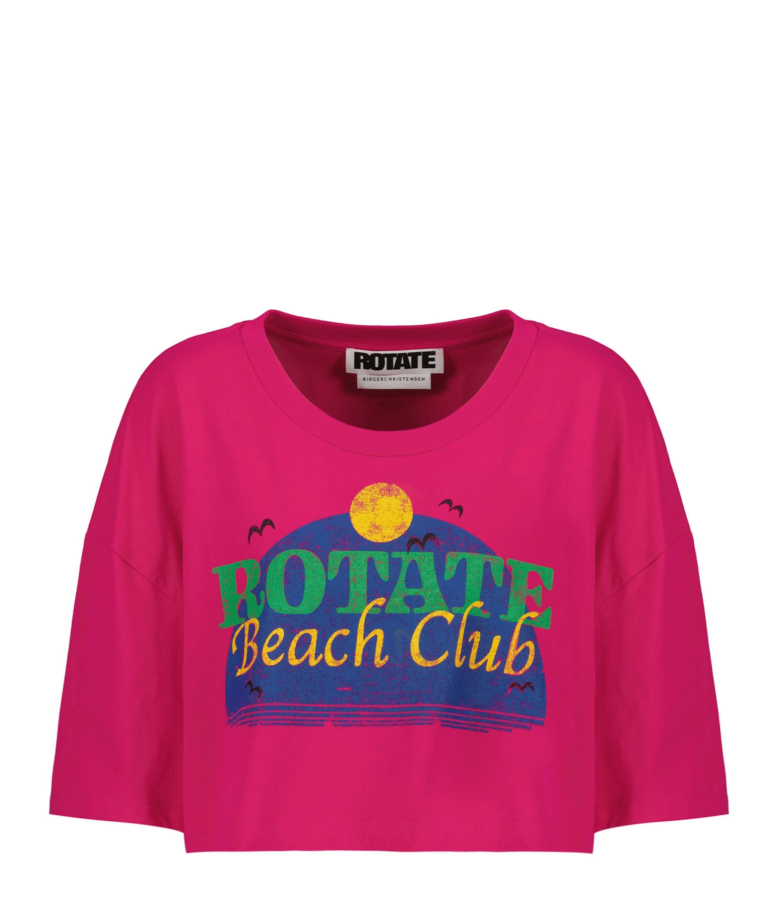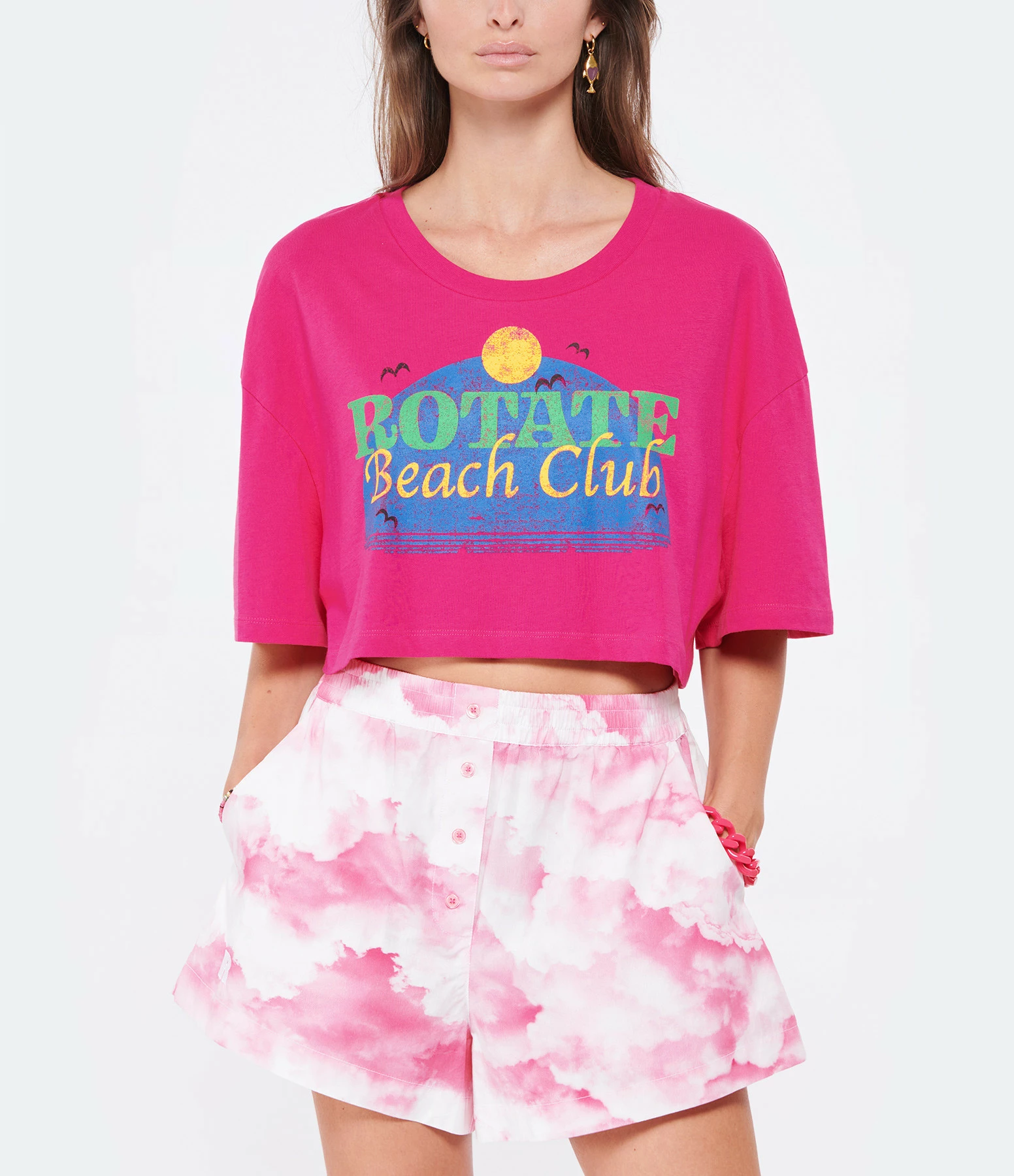 Tee-shirt court en coton rose avec sérigraphie multicolore “Rotate Beach Club” floquée à l’avant. Col rond. Manches courtes. Coupe ample. Base droite.