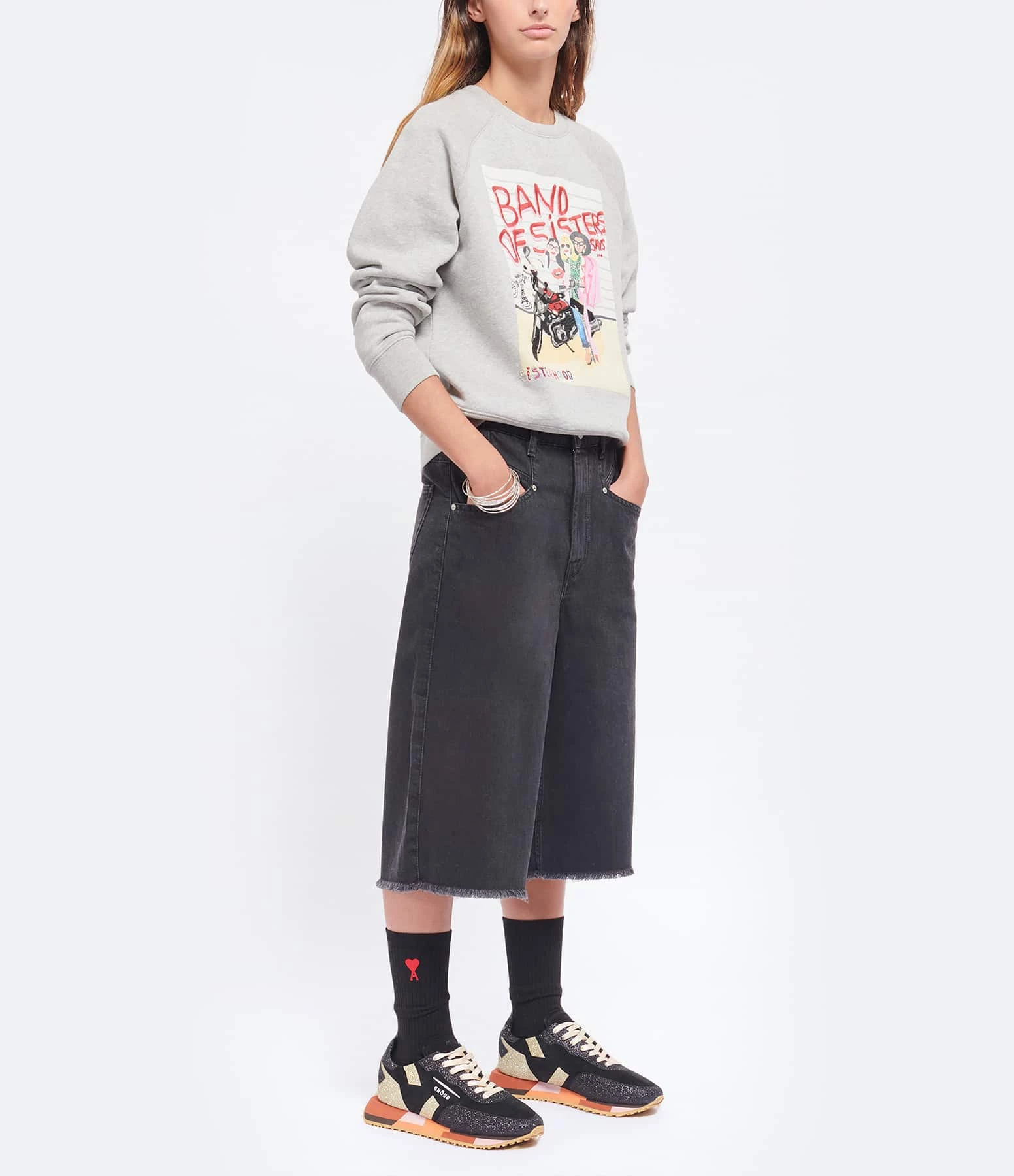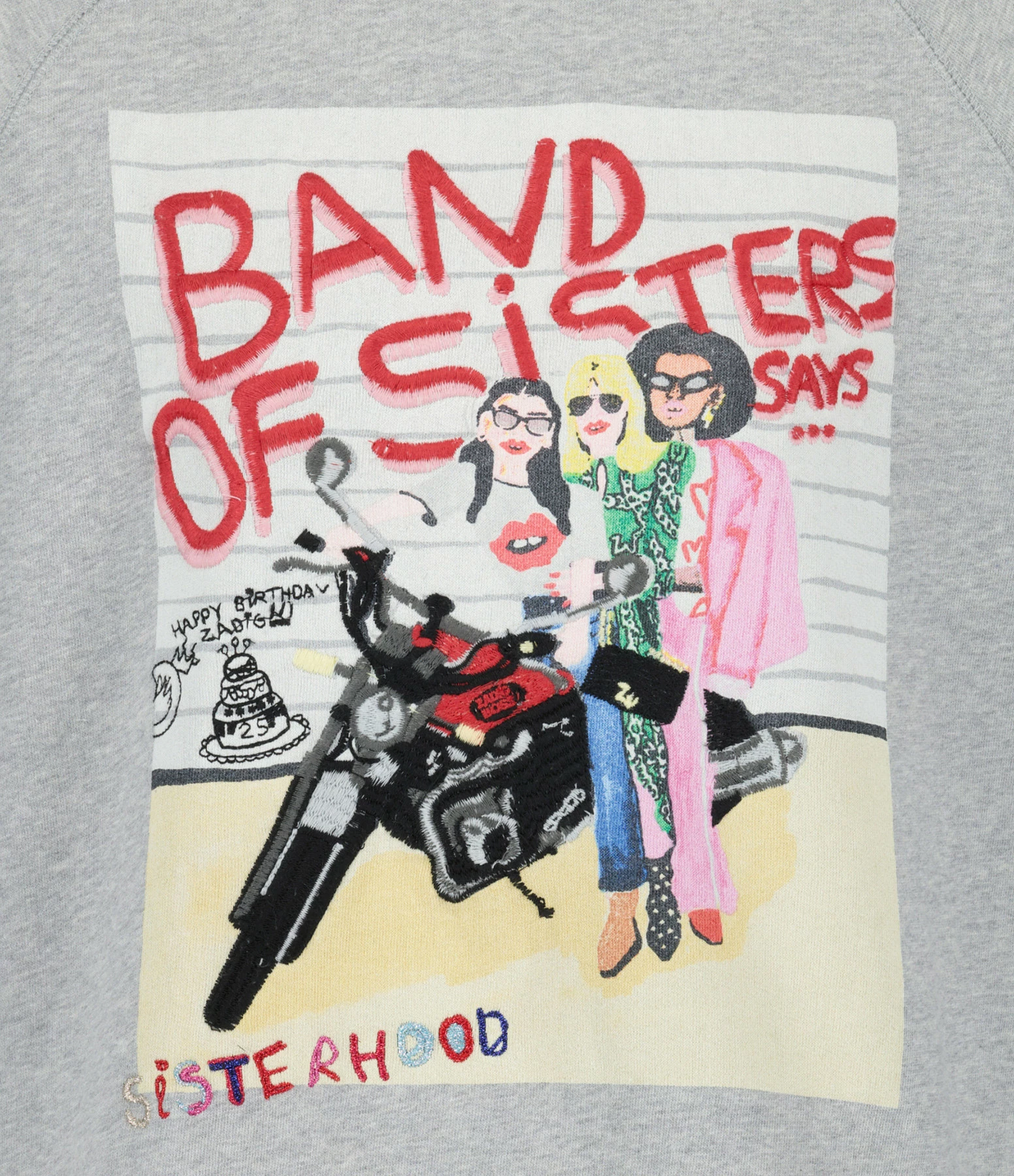 Sweatshirt en coton gris avec imprimé affiche “Band of sisters”. Col rond côtelé. Manches longues. Coupe droite. Base droite côtelée. Broderie noire dans le dos. Ce produit est une collaboration.