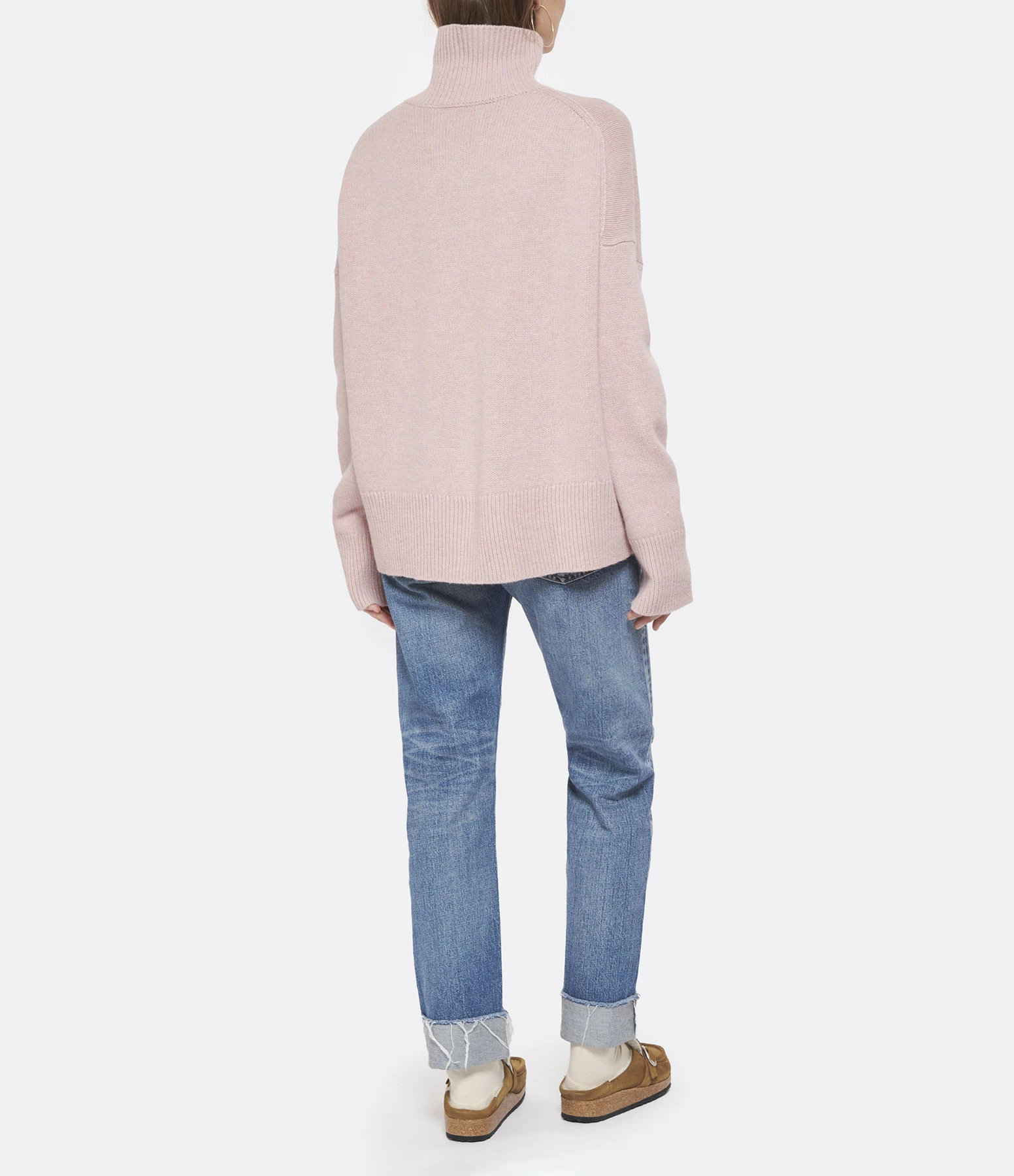 Pull en laine rose poudré. Col roulé côtelé. Manches longues avec poignet côtelé. Coupe droite large. Base droite côtelée.