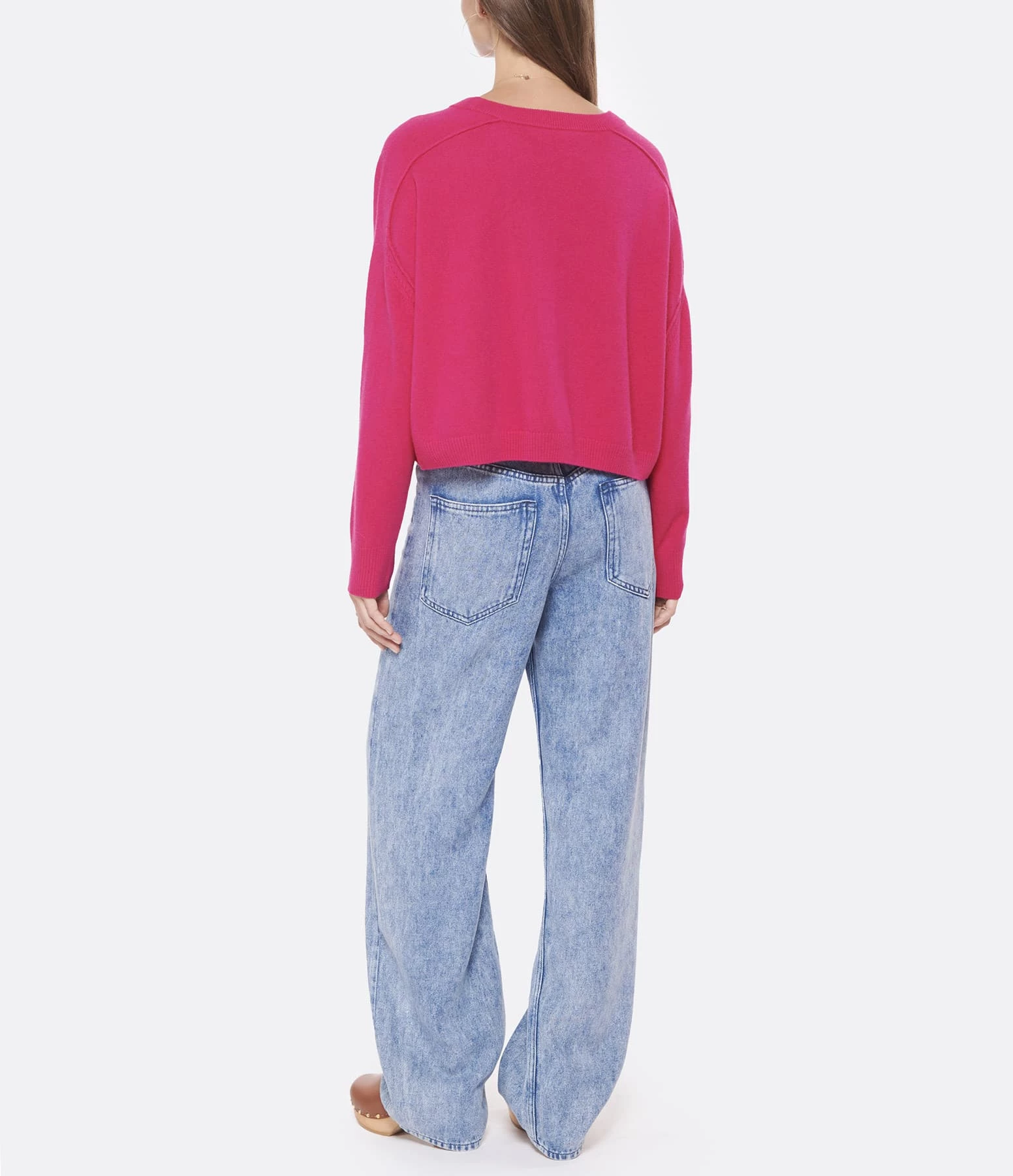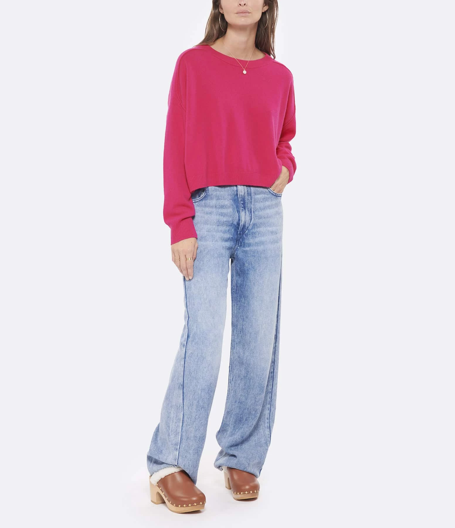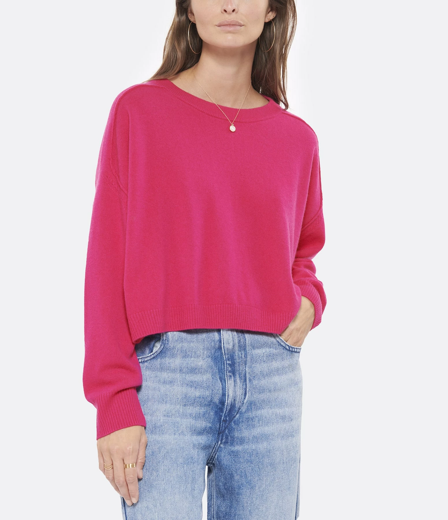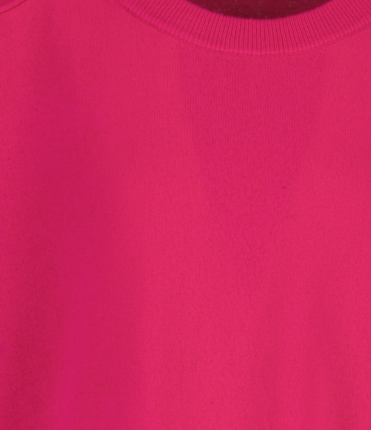 Pull en laine fuchsia. Col bateau. Manches longues resserrées aux poignets. Coupe ample. Base droite.