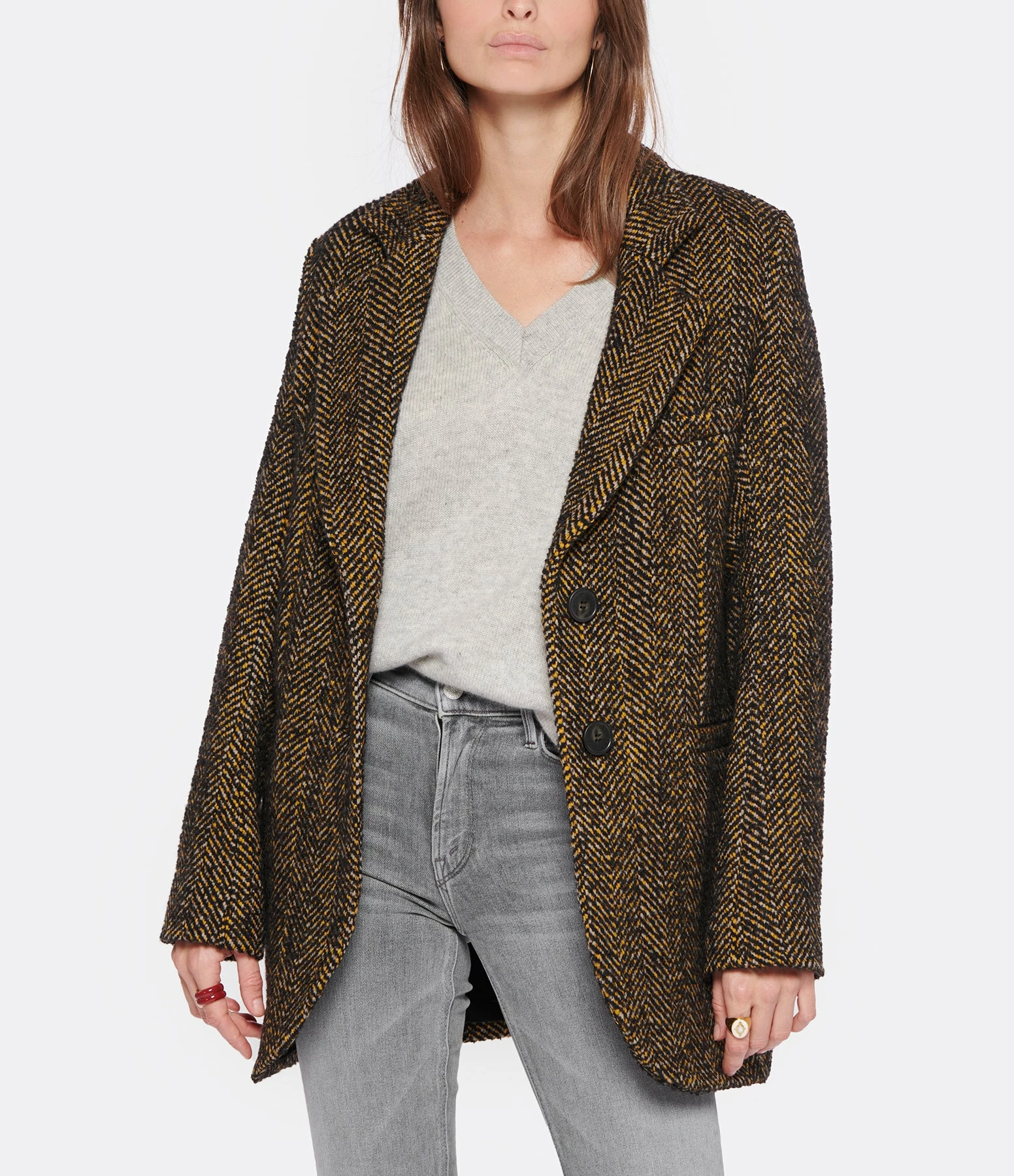 Veste blazer en laine mélangée à motifs chevrons noir et marron. Col tailleur cranté. Manches longues tailleur. Fermeture boutonnée simple sur le devant. Boutons noir effet corne. Trois poches raglan sur le devant. Une fente milieu dos. Coupe droite. Base arrondie. Doublée.