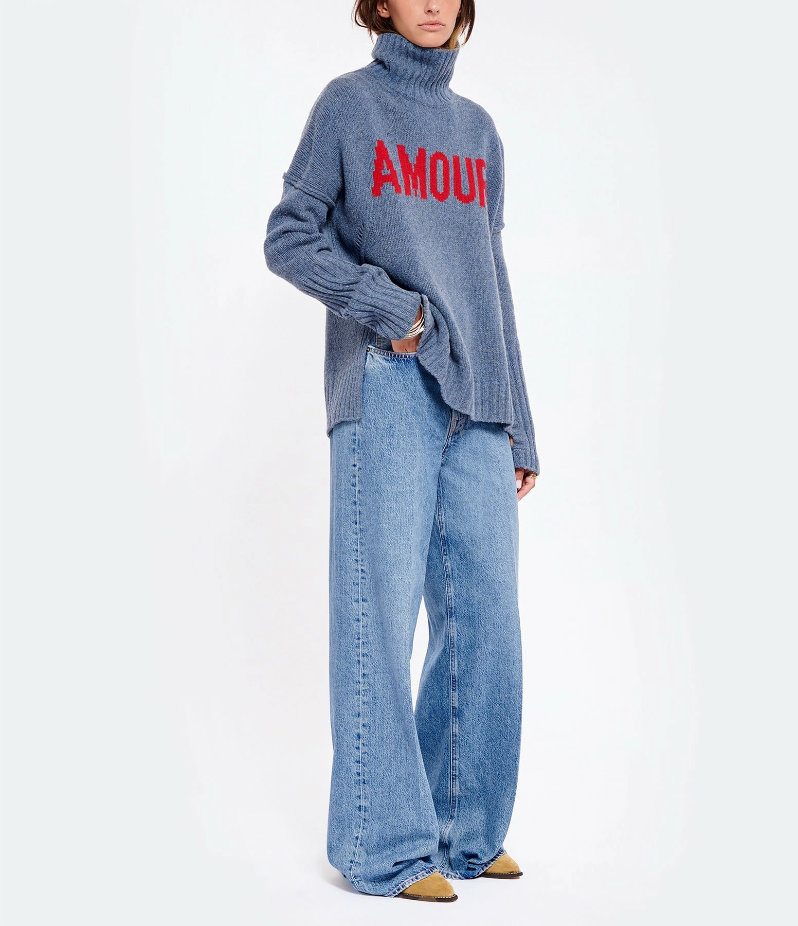 Pull en laine maille de laine bleu. Détails ajourés et inscription “Amour” en rouge sur le devant. Col roulé côtelé. Manches longues. avec longs poignets côtelés et passe-pouce. Deux fentes latérales. Coupe droite. Base droite côtelée. Non doublé.