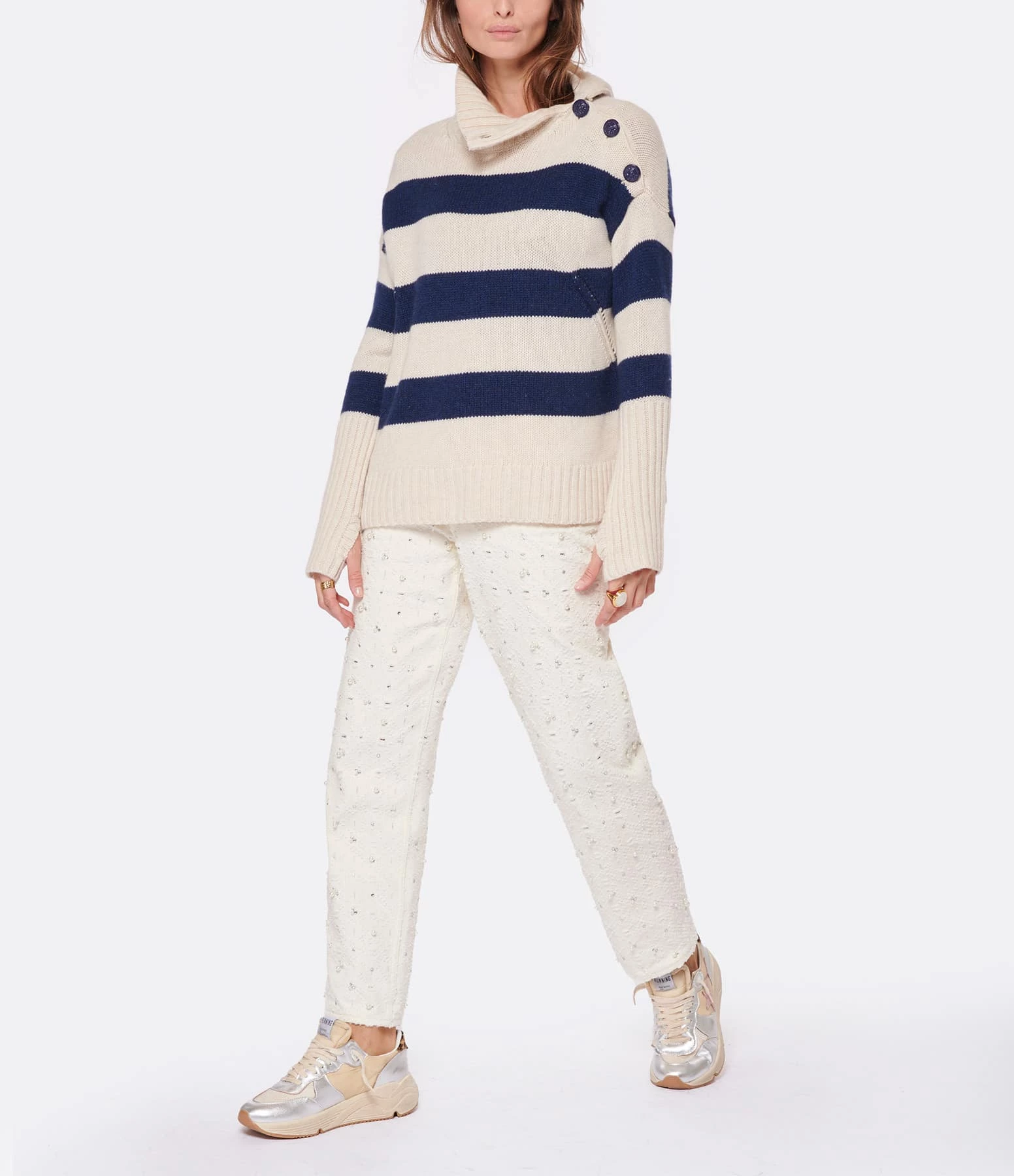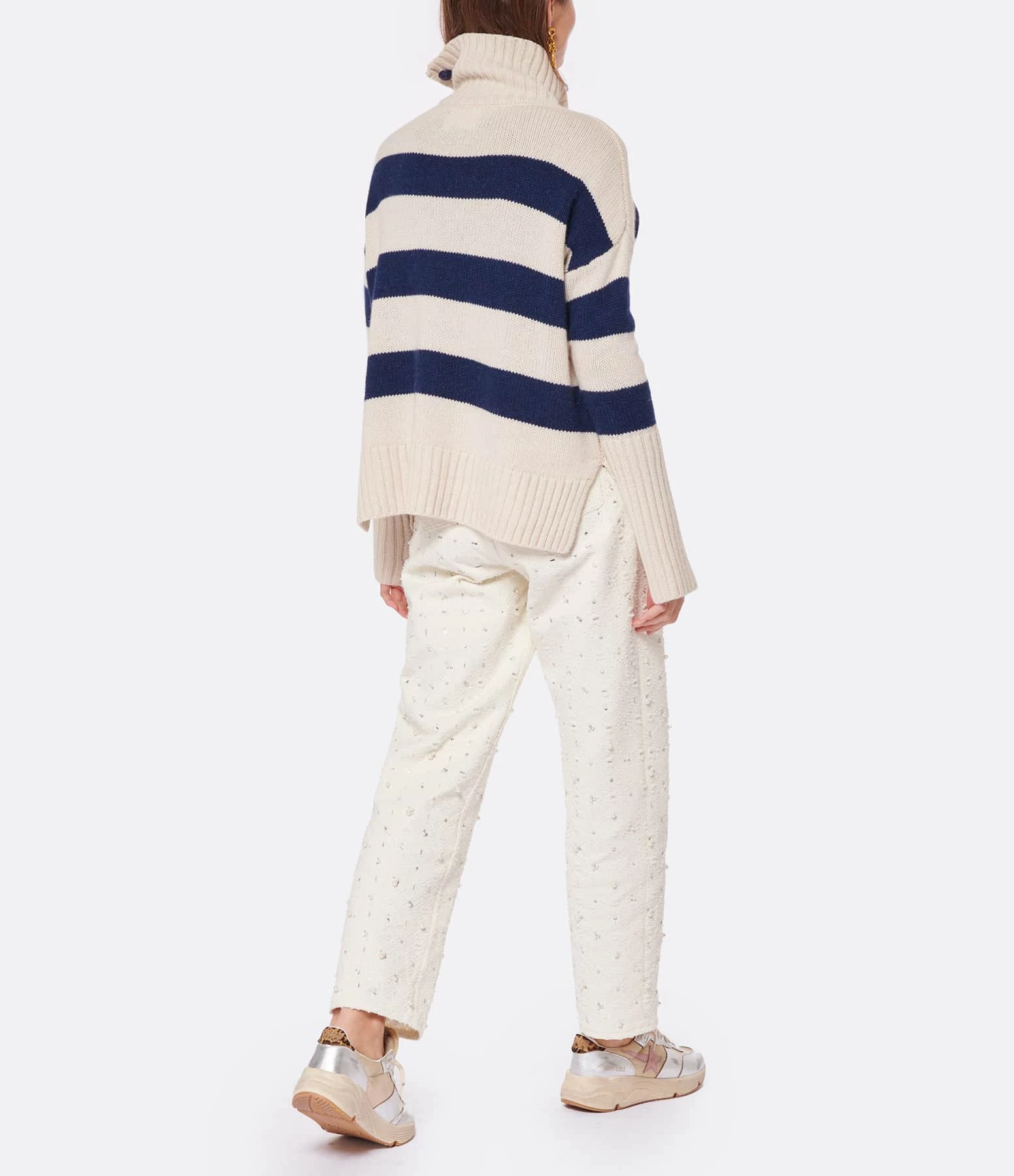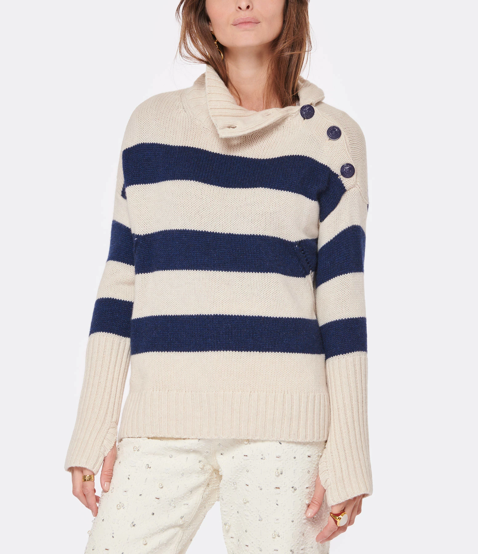 Pull en cachemire à rayures écru et bleu. Col roulé. Boutons contrastés. Manches longues. Col, poignets et taille côtelés. Trous pour les pouces. Coupe droite. Base droite. Non doublé.