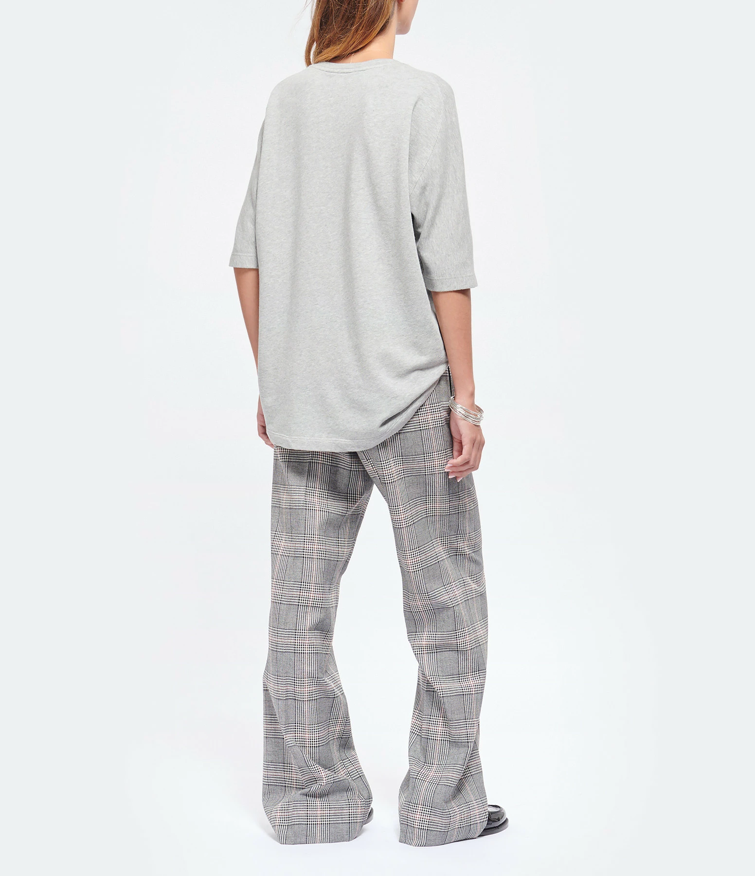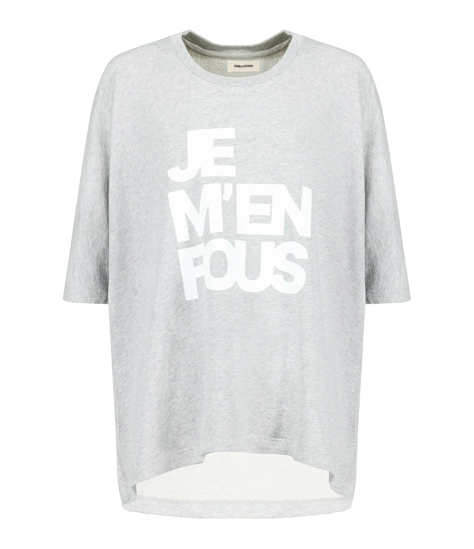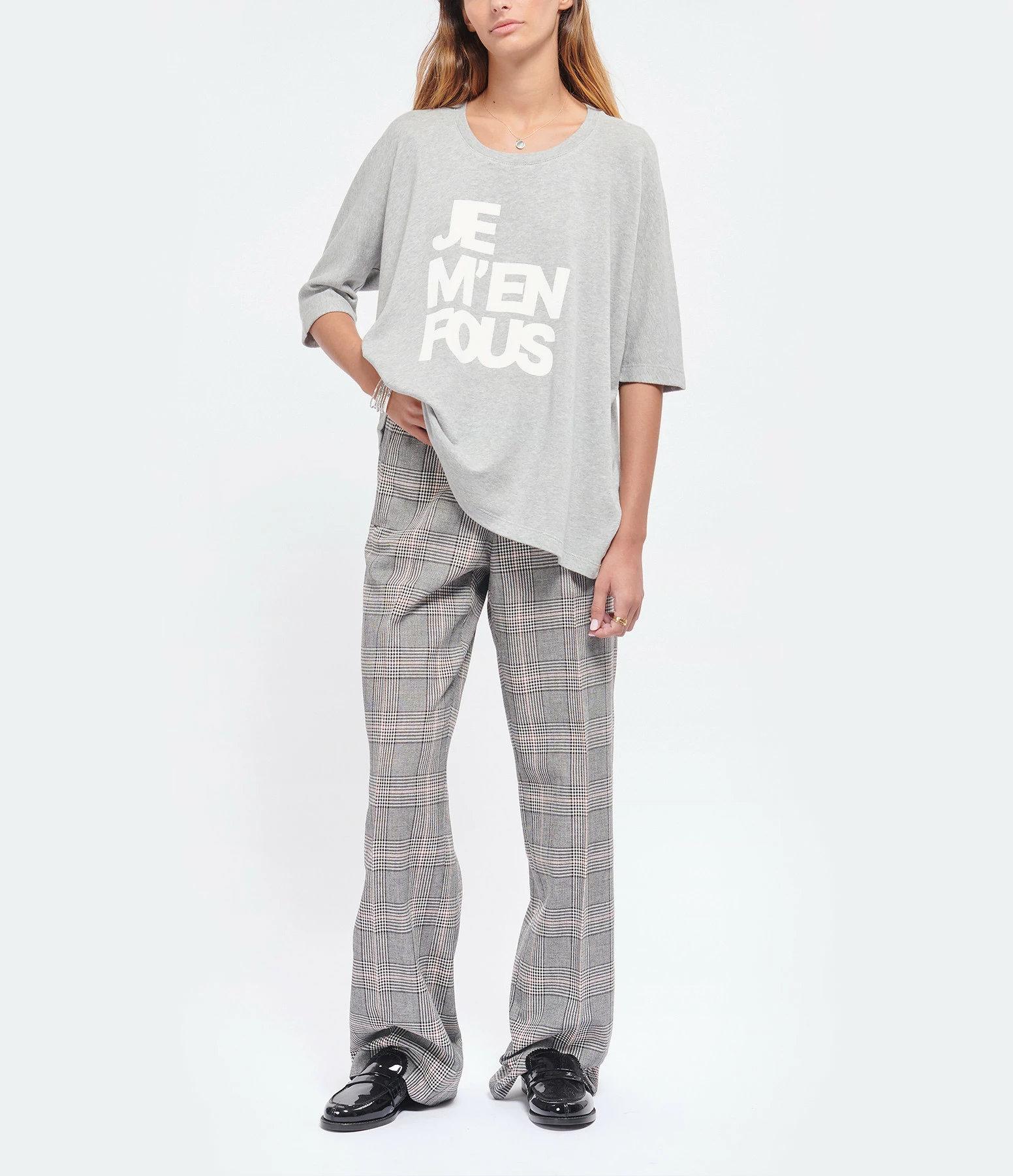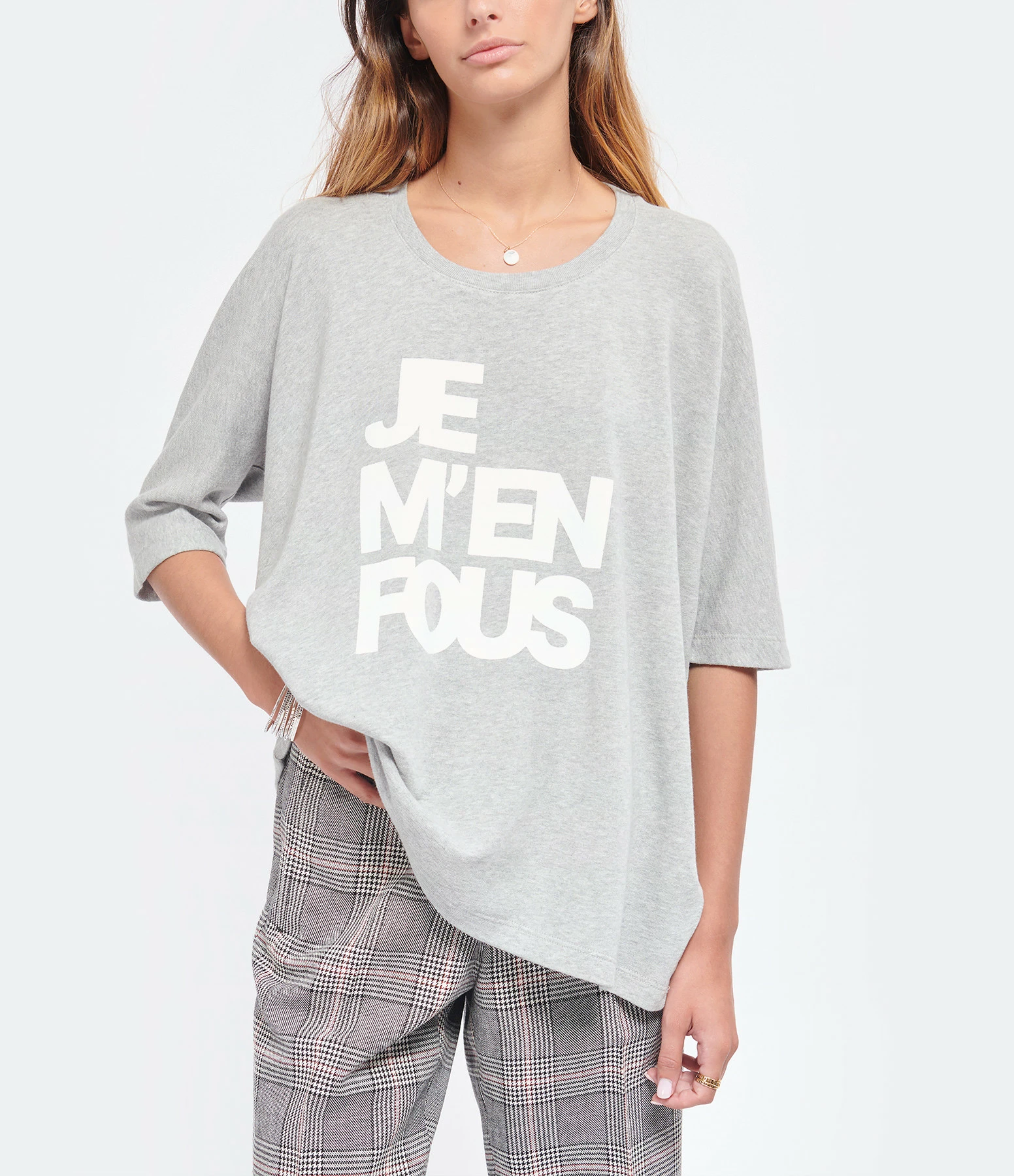 Tee-shirt en coton molletonné gris chiné. Inscription “Je m’en fous” sérigraphiée en blanc sur le devant. Col rond côtelé. Manches courtes dolman. Coupe droite large. Base droite.