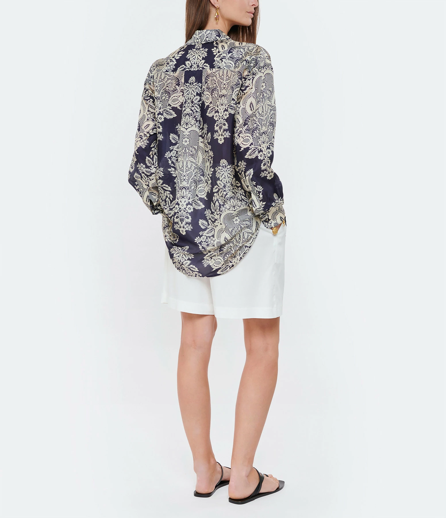 Chemise longue en soie bleue à imprimés blanc. Col chemisier. Fermeture par boutons. Manches longues. Coupe droite. Base arrondie plus courte à l’avant.